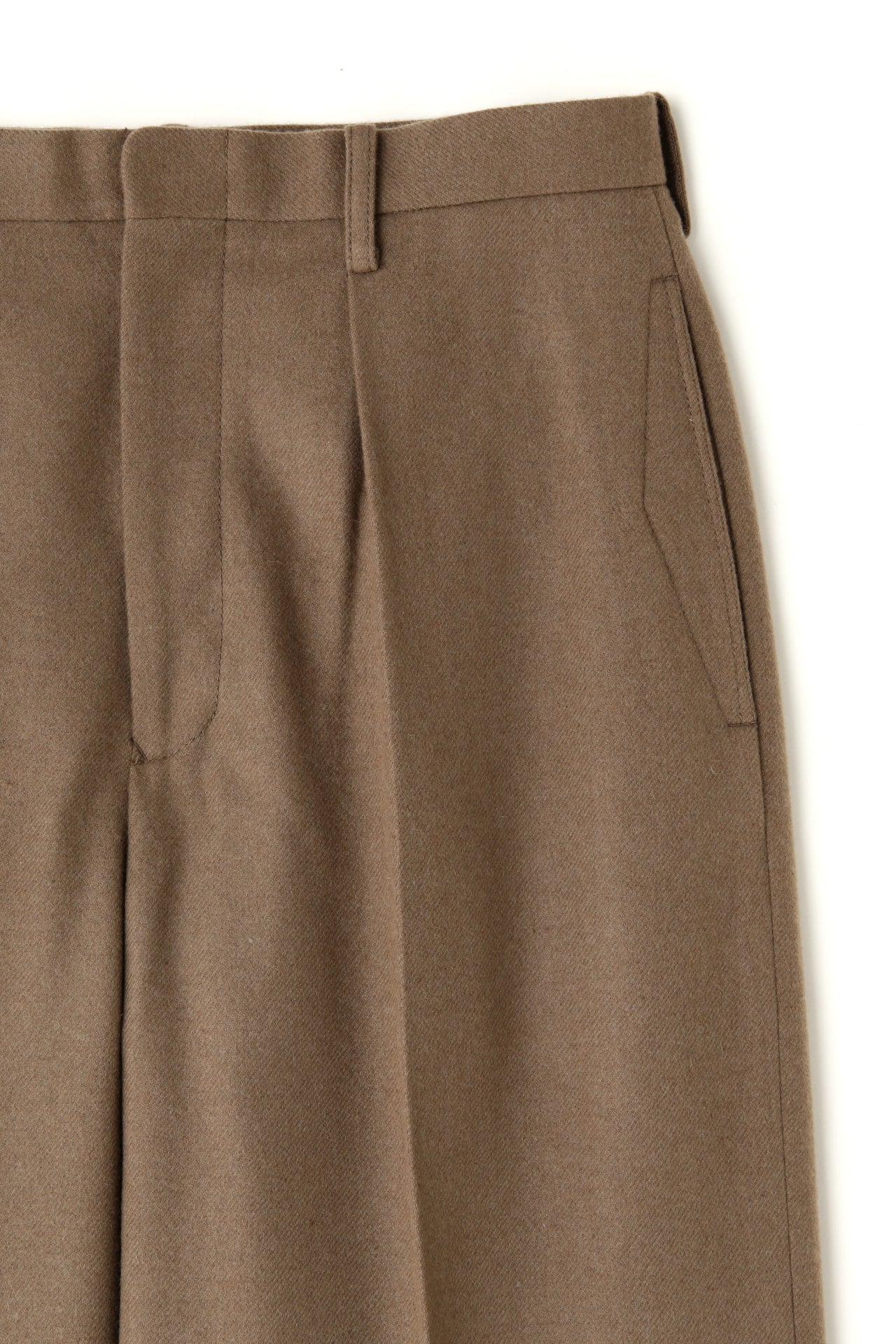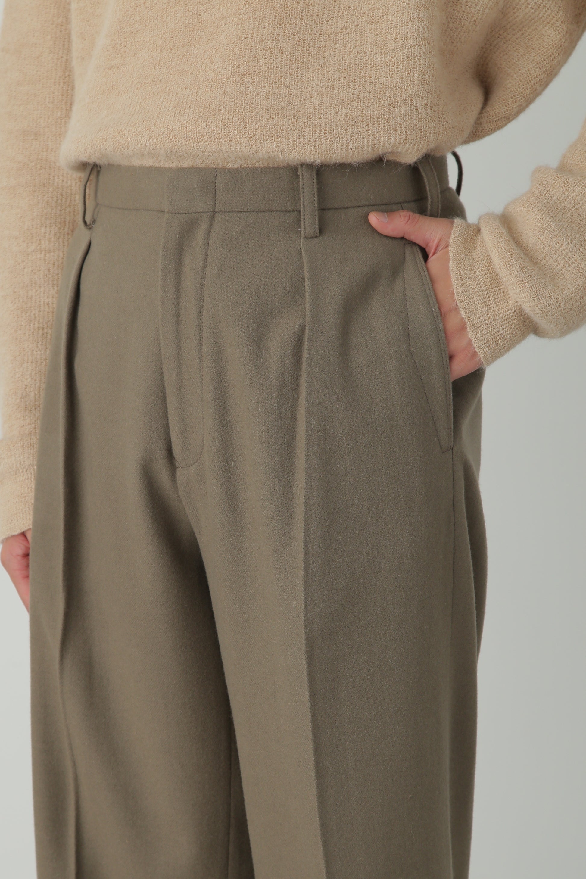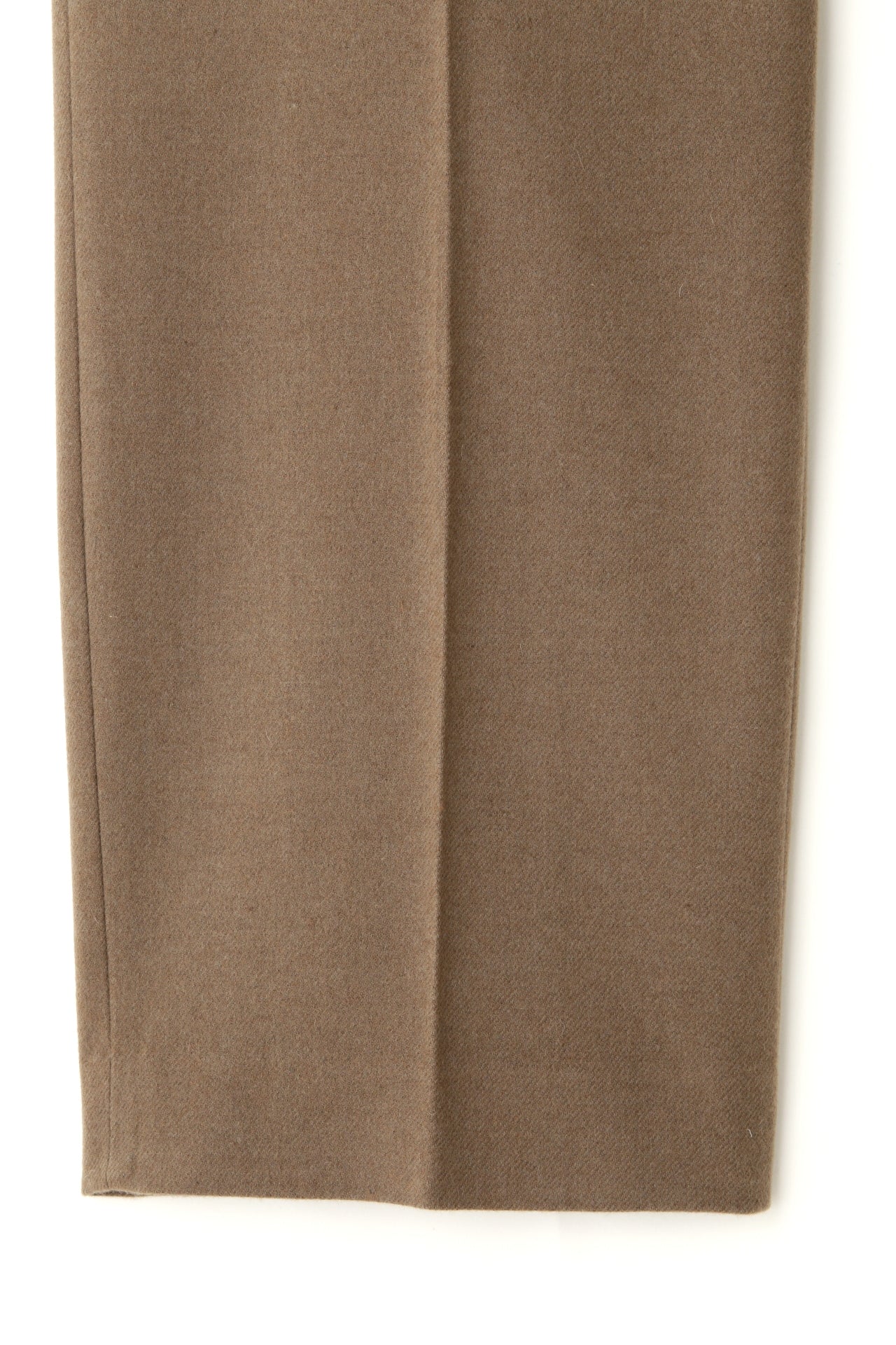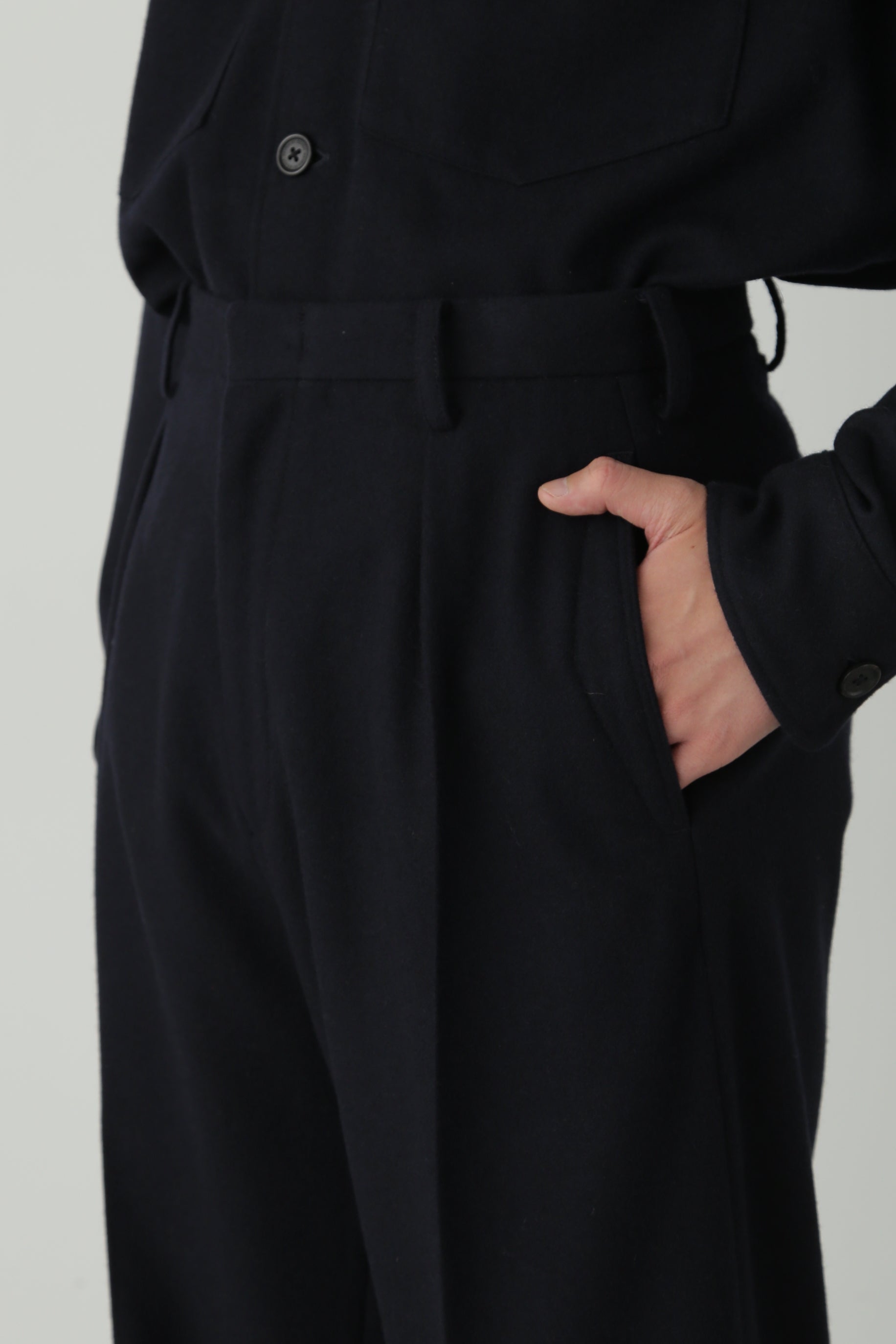 The Melton fabric is made by weaving yarn made from a blend of five different types of wool with different textures to a strict standard, resulting in a high density yet soft finish with a gentle touch. The design is also characterized by the unique drape created by the generous silhouette and the firmness of the material. One of the design elements is that the length is slightly longer so that the unique drape can be enjoyed. These slacks with an in-tuck design go well with blousons and shirts made from the same material, as well as being worn alone.