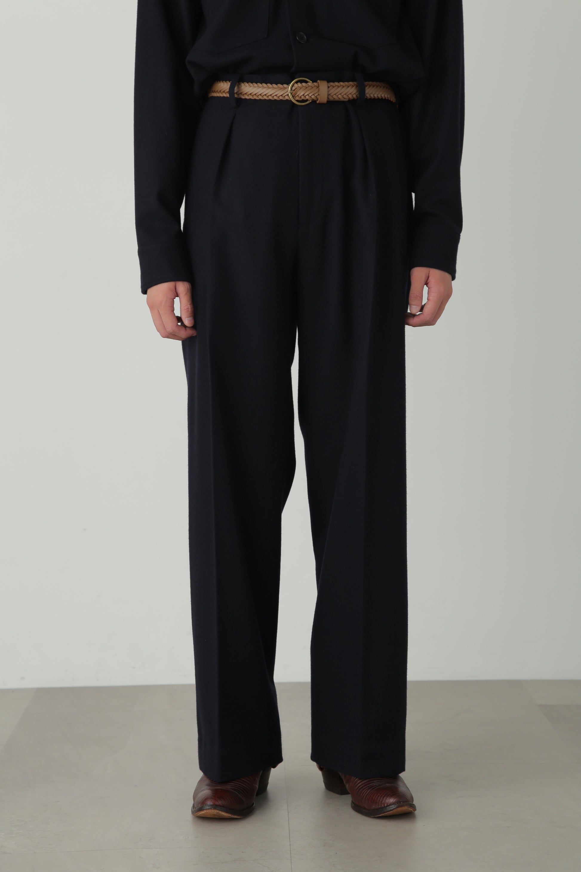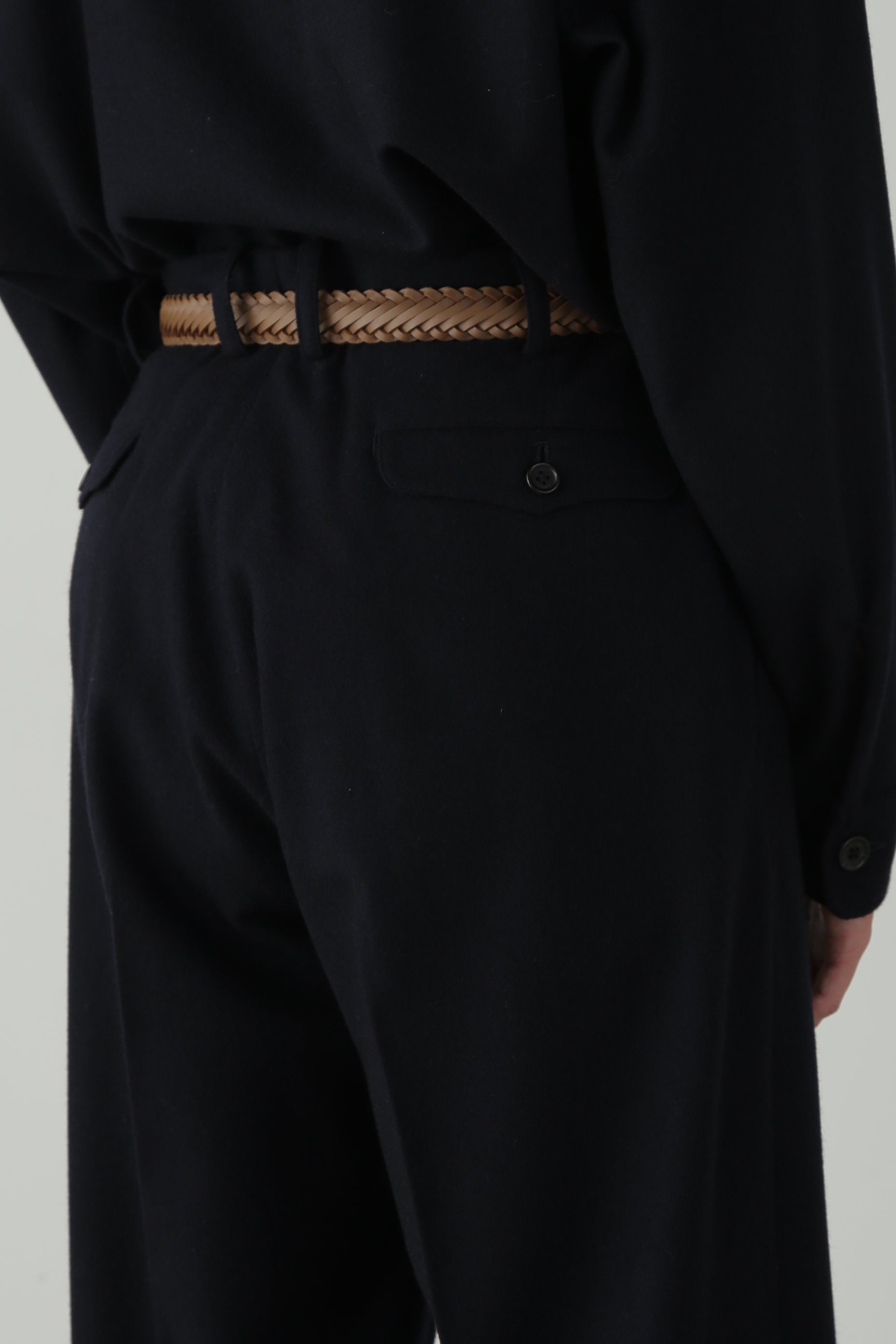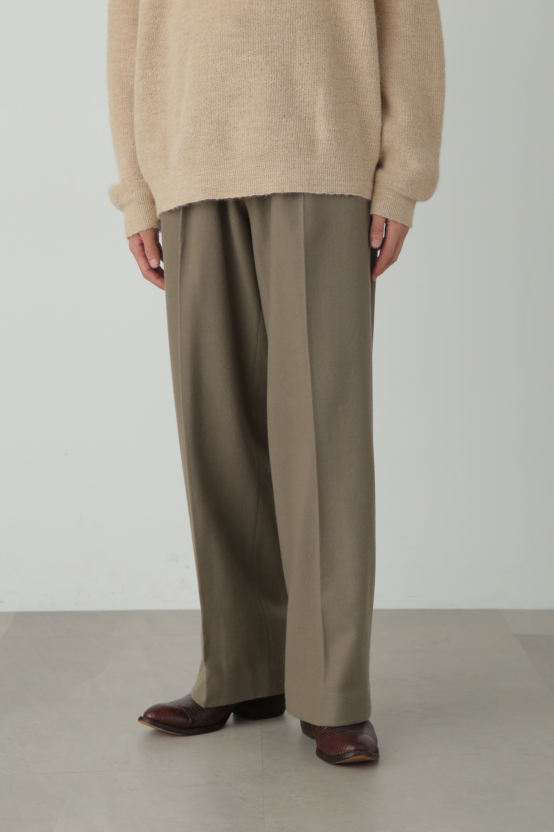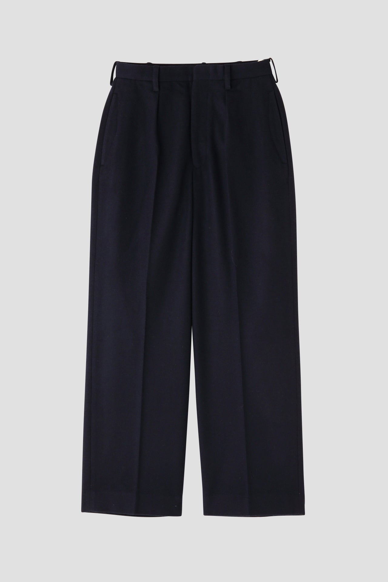 The Melton fabric is made by weaving yarn made from a blend of five different types of wool with different textures to a strict standard, resulting in a high density yet soft finish with a gentle touch. The design is also characterized by the unique drape created by the generous silhouette and the firmness of the material. One of the design elements is that the length is slightly longer so that the unique drape can be enjoyed. These slacks with an in-tuck design go well with blousons and shirts made from the same material, as well as being worn alone.