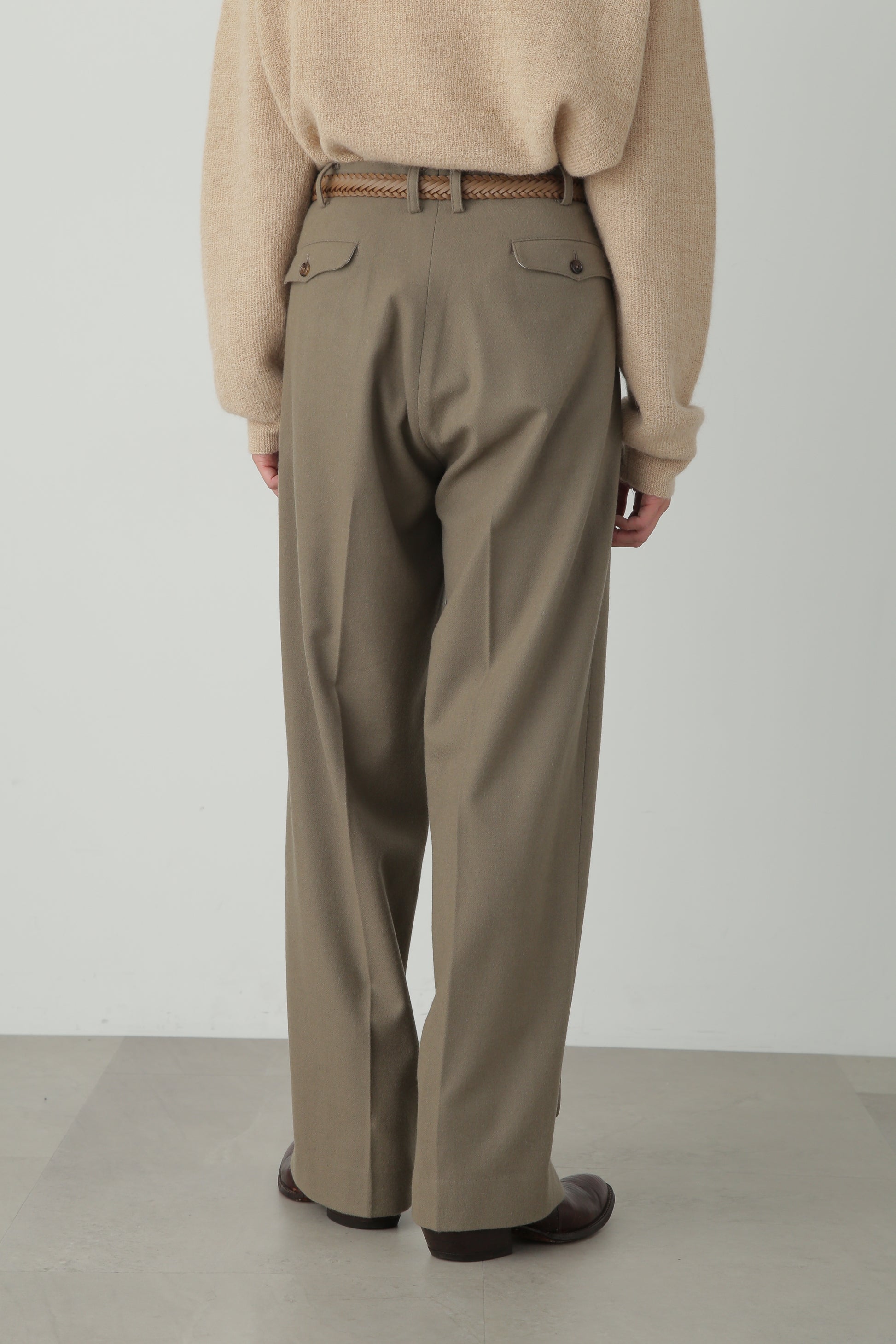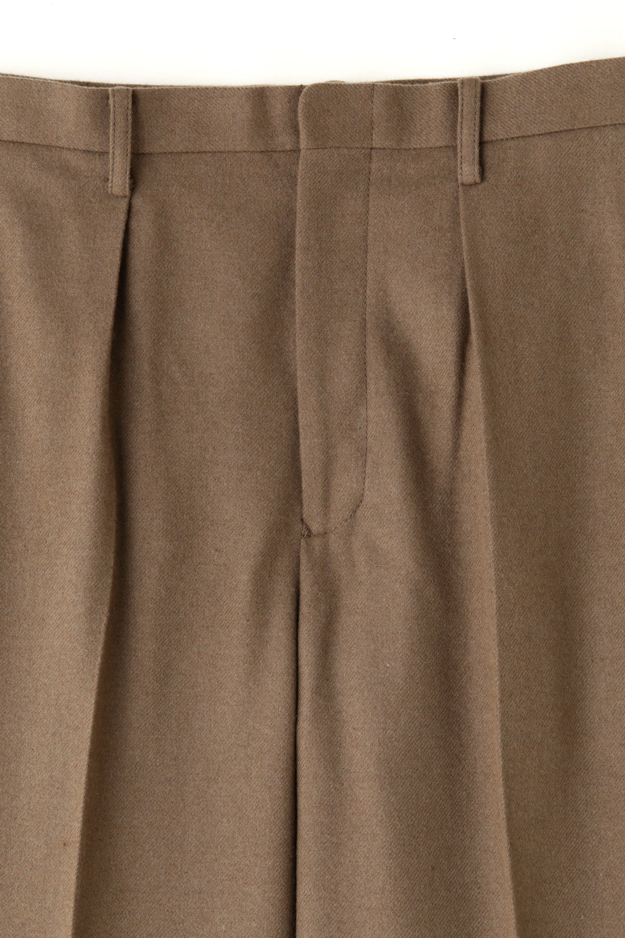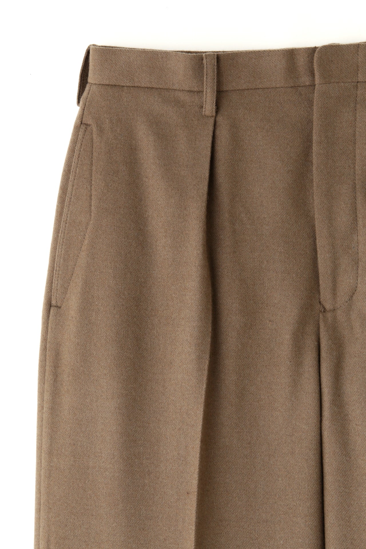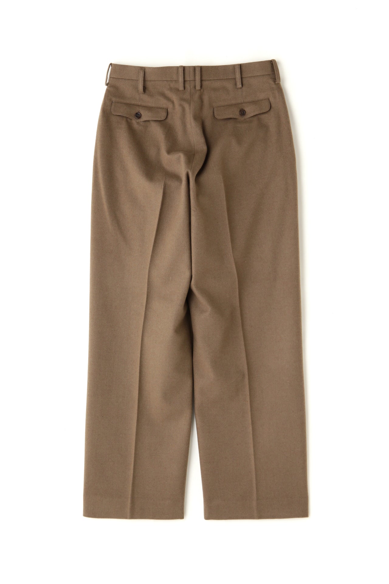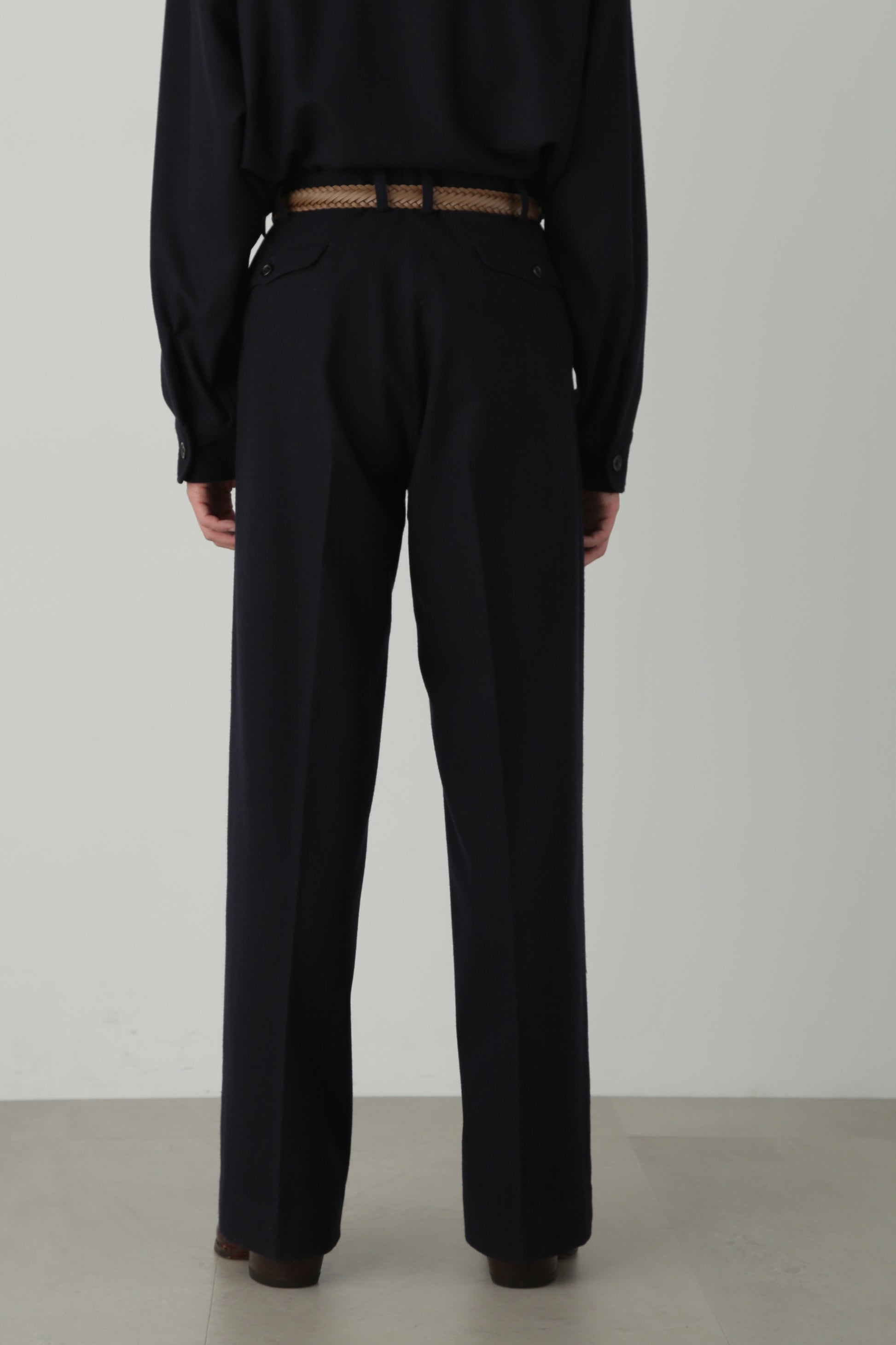 The Melton fabric is made by weaving yarn made from a blend of five different types of wool with different textures to a strict standard, resulting in a high density yet soft finish with a gentle touch. The design is also characterized by the unique drape created by the generous silhouette and the firmness of the material. One of the design elements is that the length is slightly longer so that the unique drape can be enjoyed. These slacks with an in-tuck design go well with blousons and shirts made from the same material, as well as being worn alone.