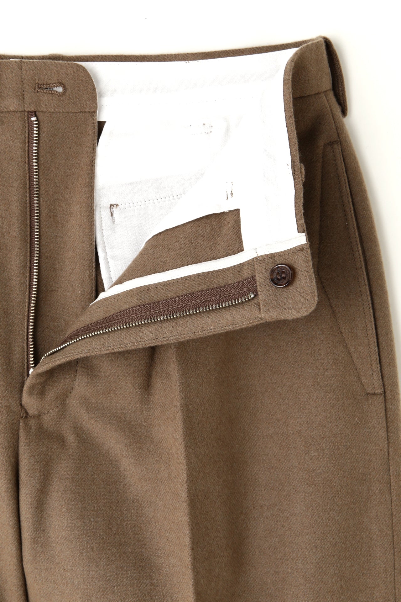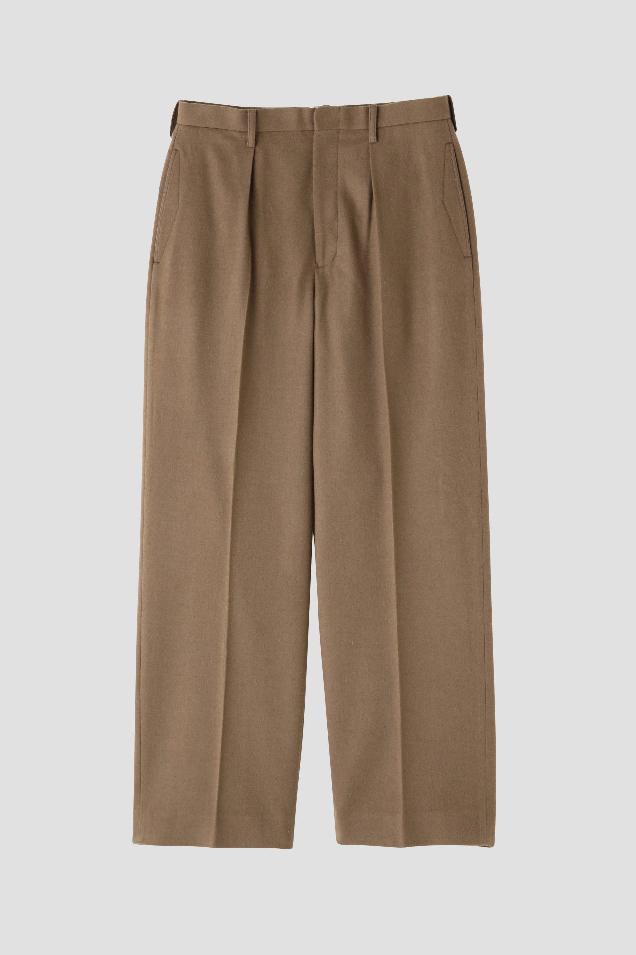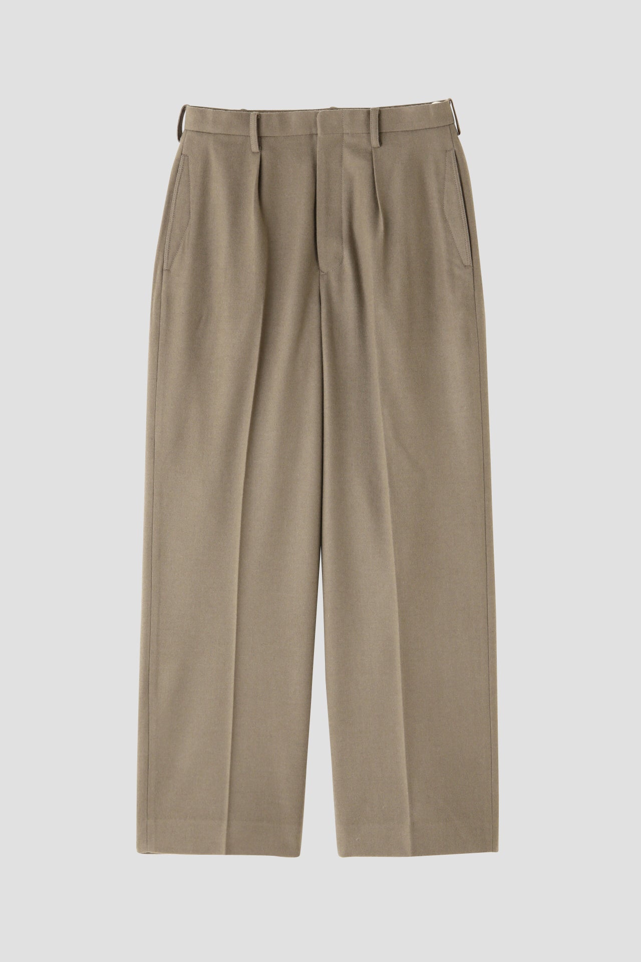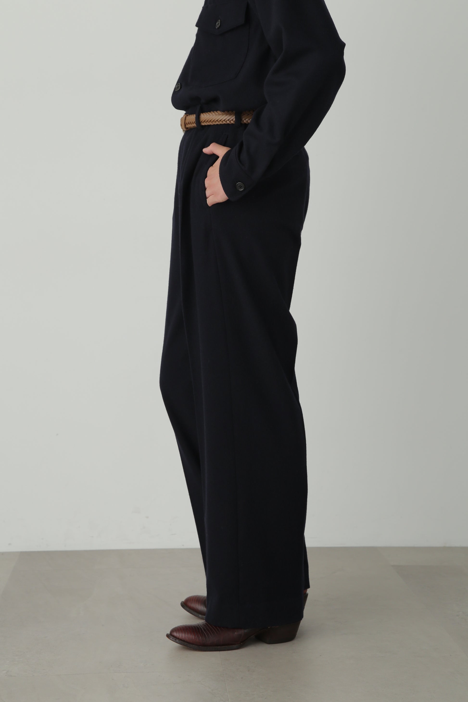 The Melton fabric is made by weaving yarn made from a blend of five different types of wool with different textures to a strict standard, resulting in a high density yet soft finish with a gentle touch. The design is also characterized by the unique drape created by the generous silhouette and the firmness of the material. One of the design elements is that the length is slightly longer so that the unique drape can be enjoyed. These slacks with an in-tuck design go well with blousons and shirts made from the same material, as well as being worn alone.