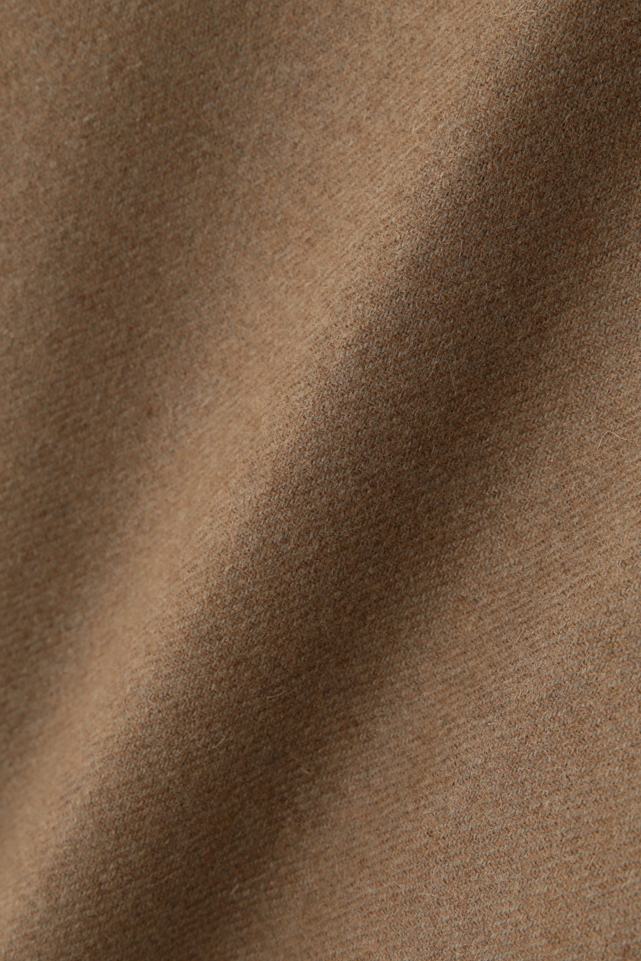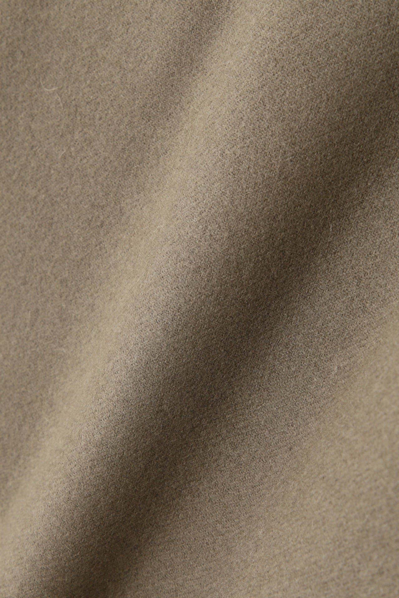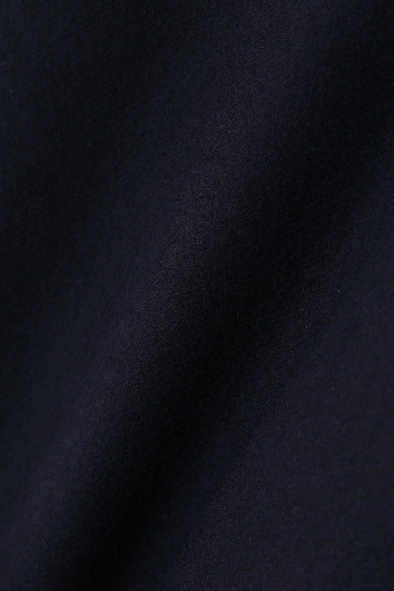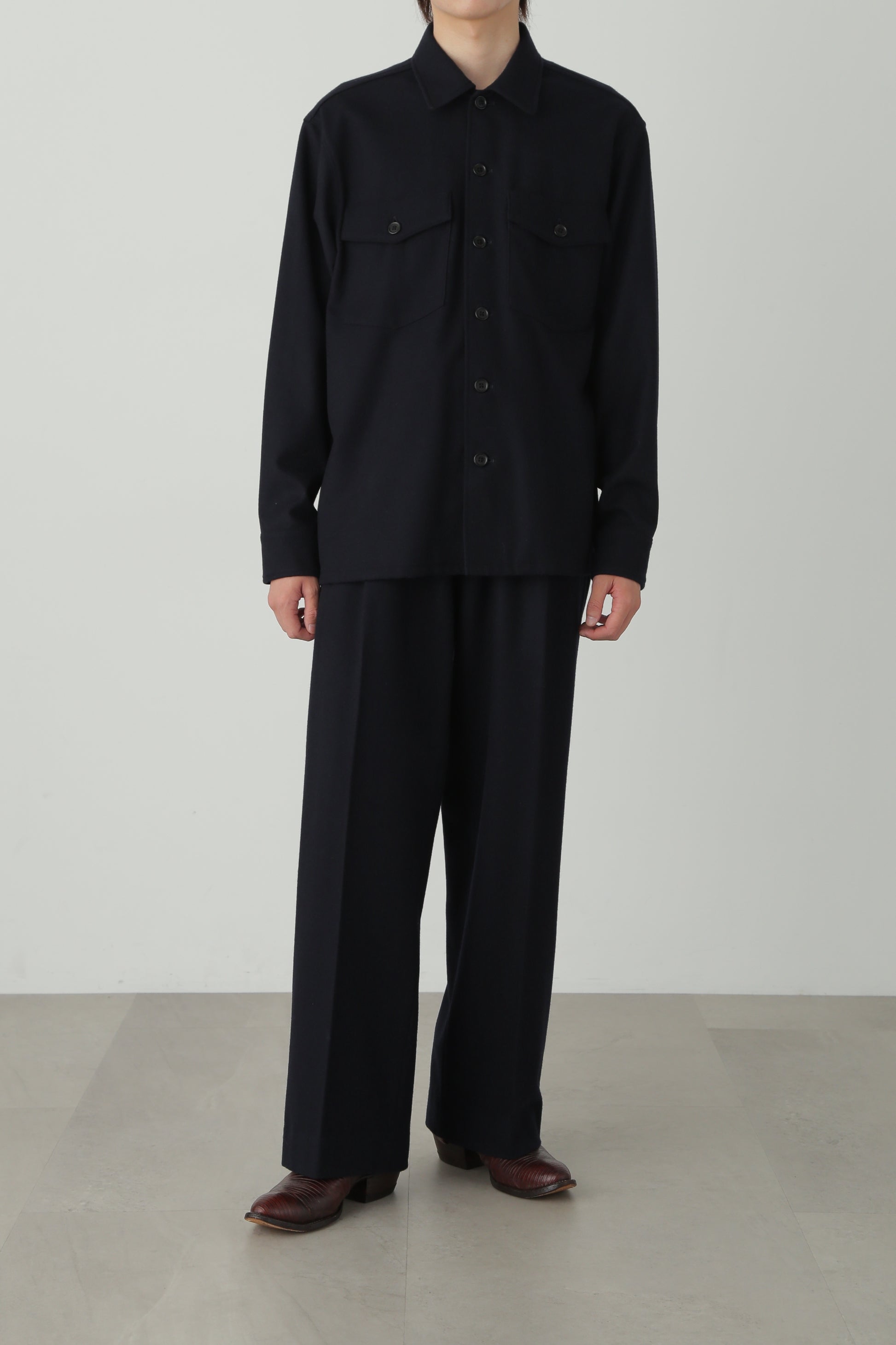 The Melton fabric is made by weaving yarn made from a blend of five different types of wool with different textures to a strict standard, resulting in a high density yet soft finish with a gentle touch. The design is also characterized by the unique drape created by the generous silhouette and the firmness of the material. One of the design elements is that the length is slightly longer so that the unique drape can be enjoyed. These slacks with an in-tuck design go well with blousons and shirts made from the same material, as well as being worn alone.