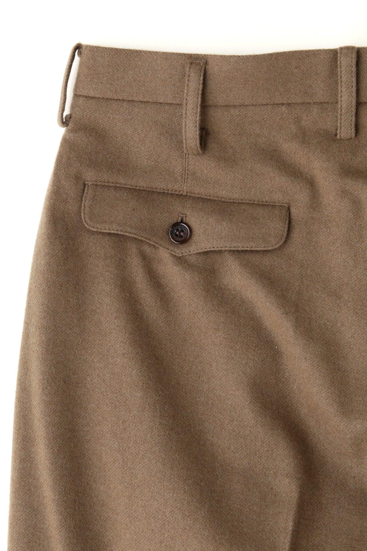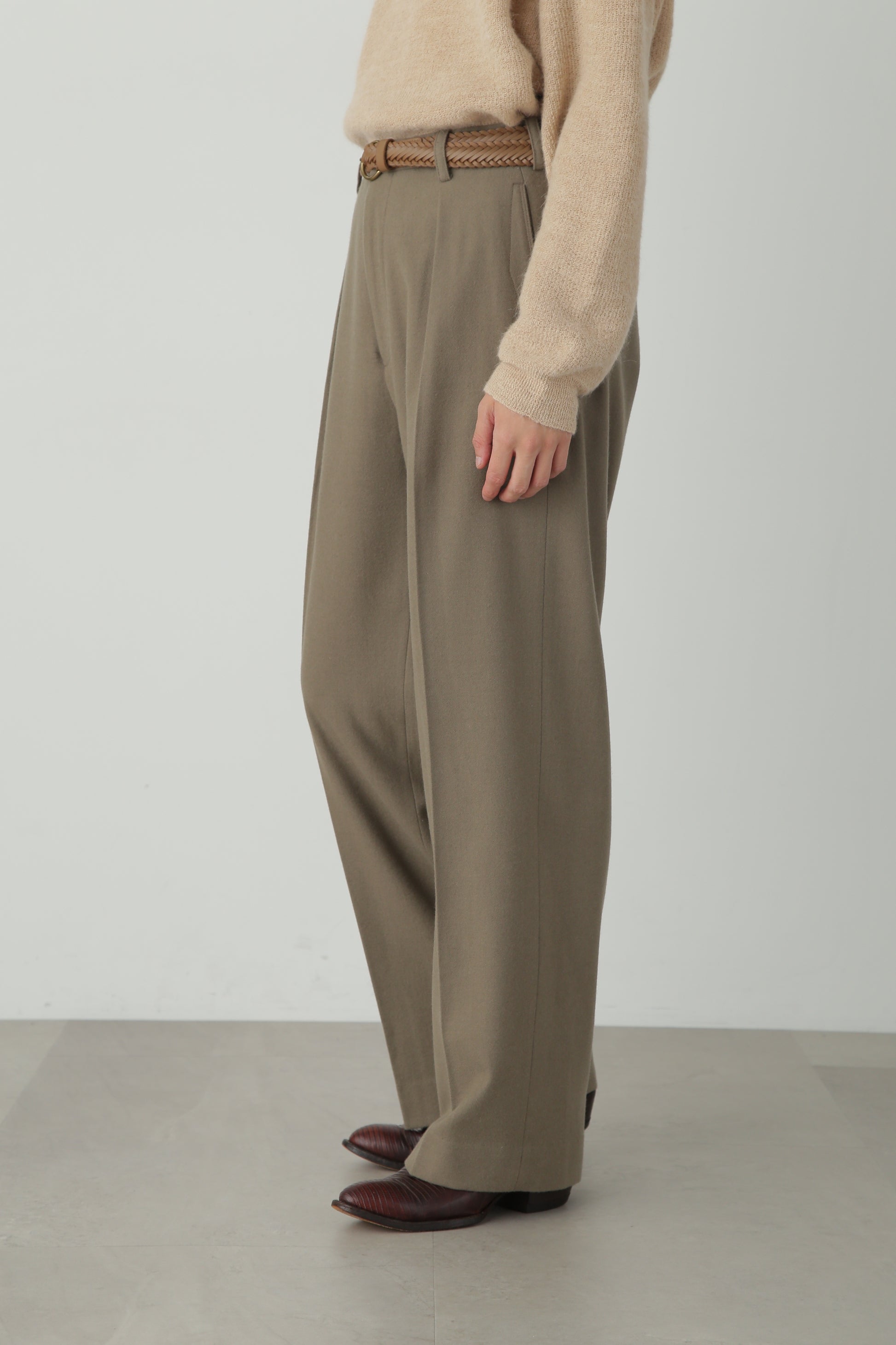 These slacks have an in-tuck design and are made from Melton material, which is soft yet firm and resilient.