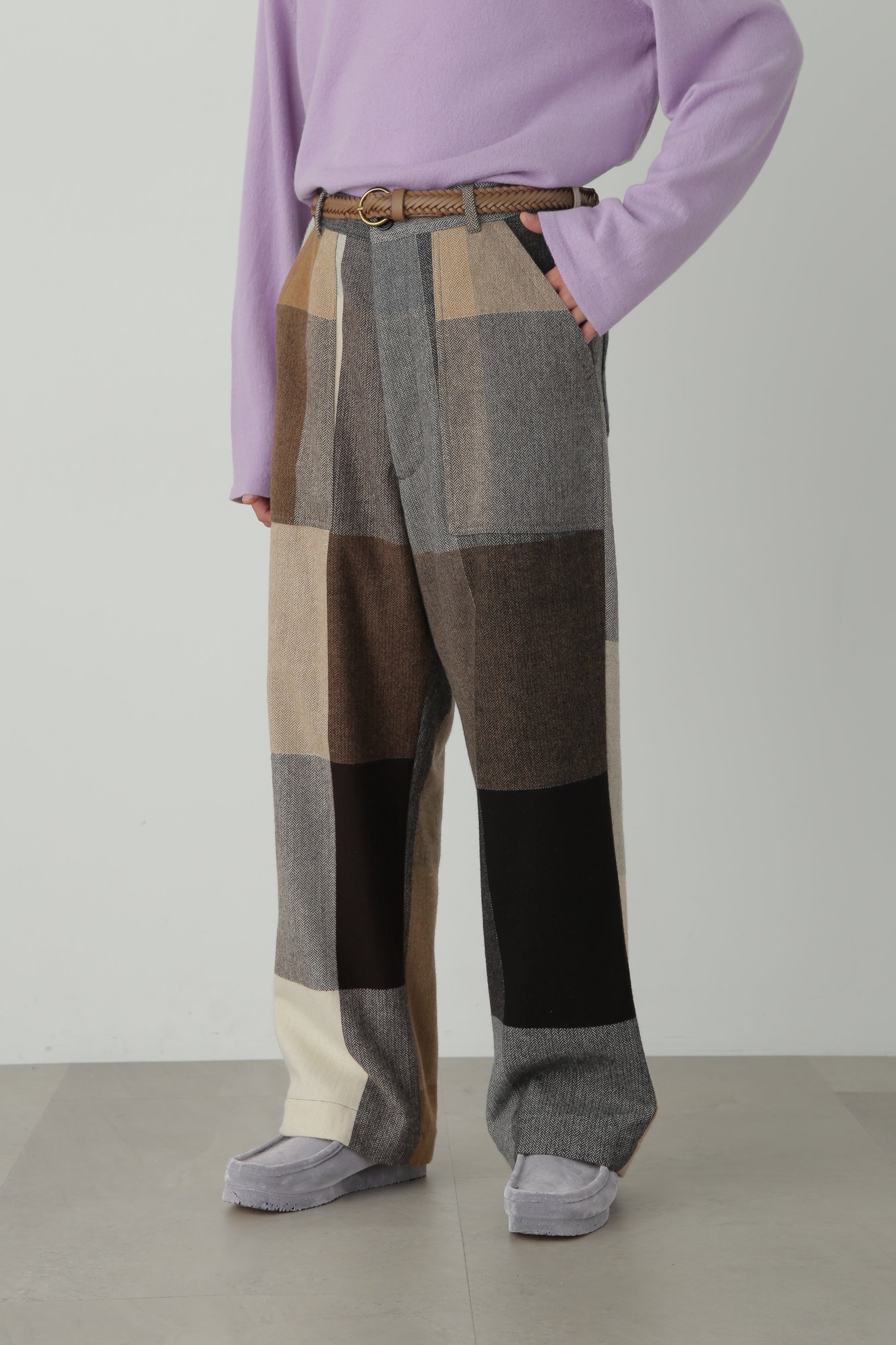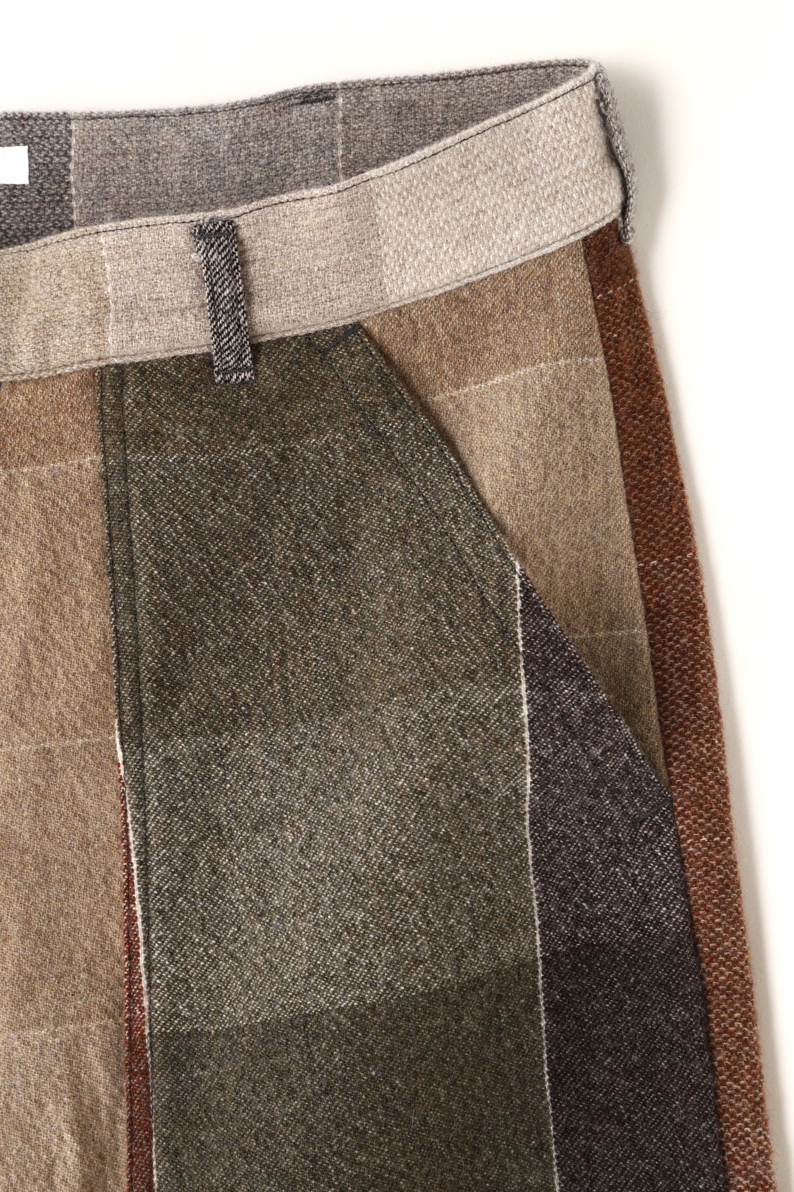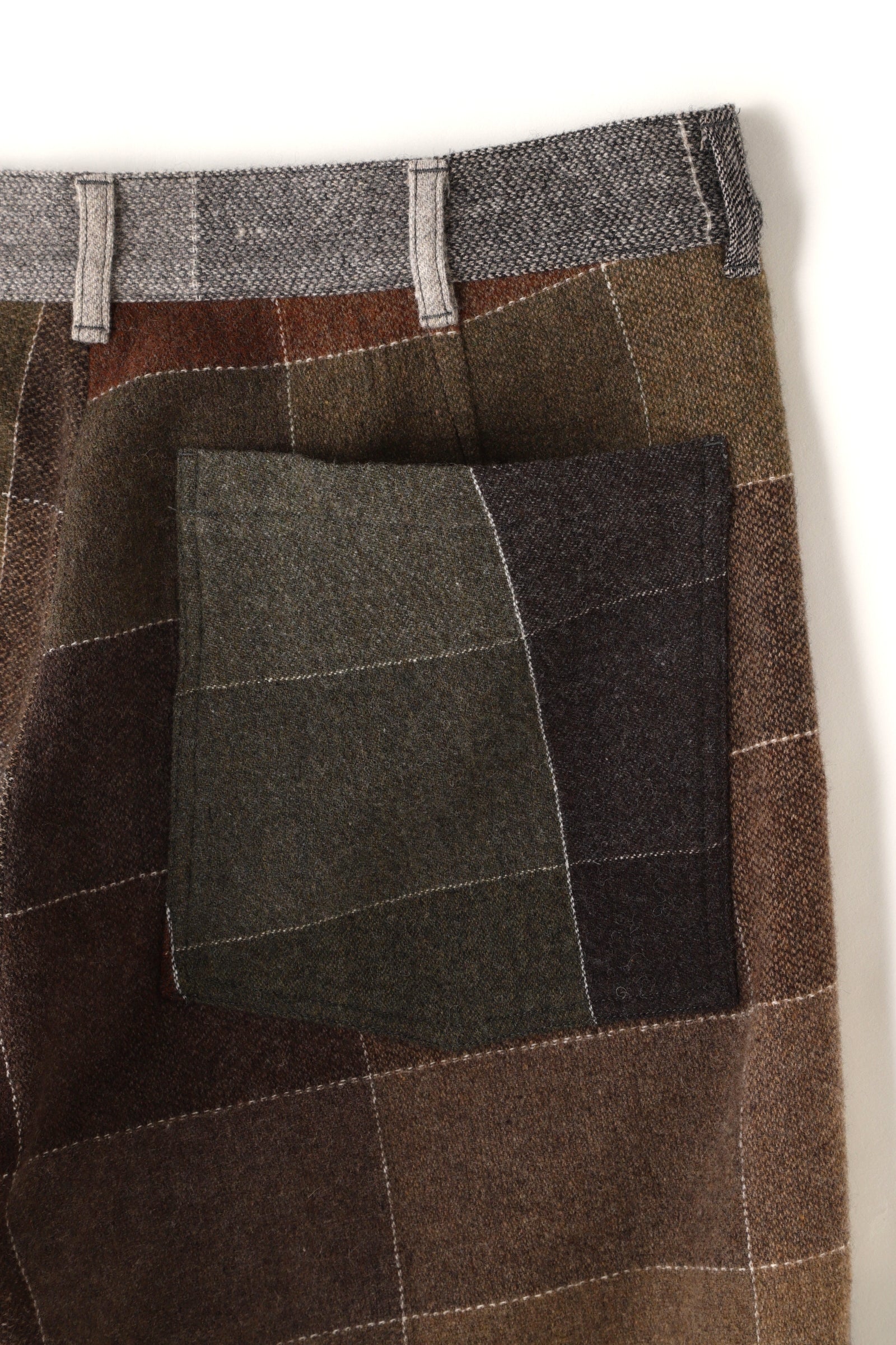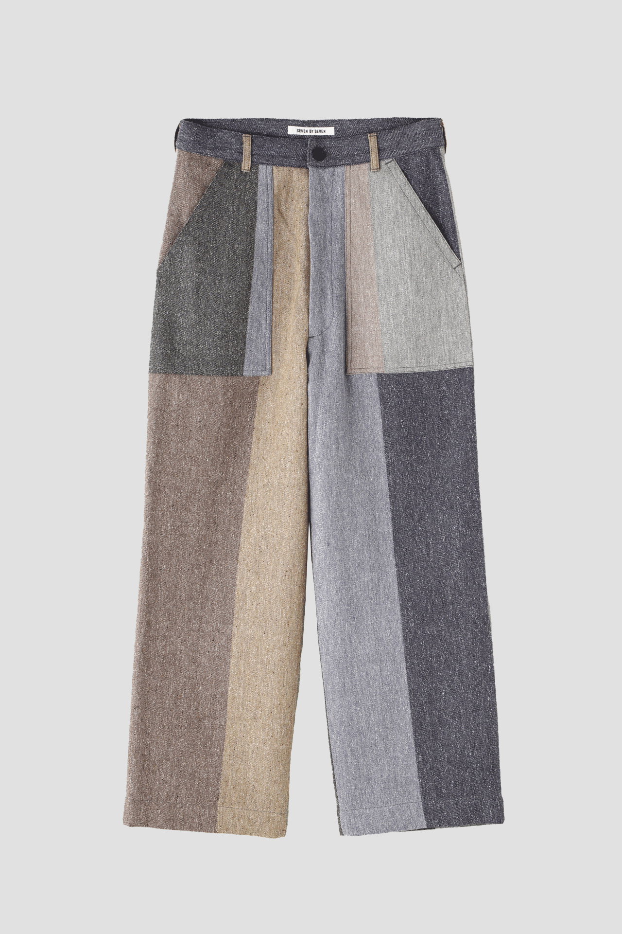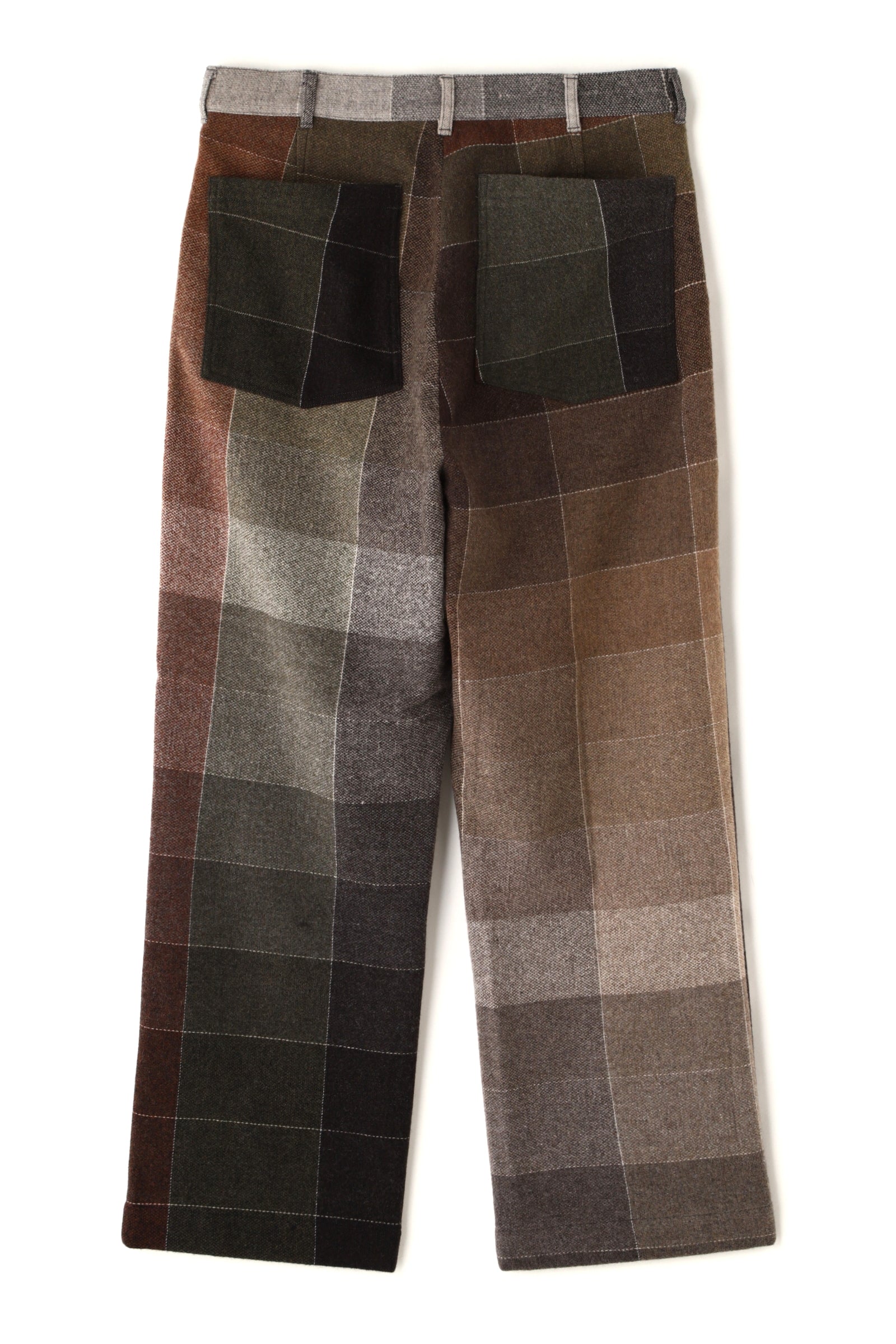 When making yarn-dyed materials, the fabric (mass sample) that is woven with various warp and weft variations uses multiple colors of threads in both the vertical and horizontal directions, so it is a material that is almost completely unsuitable for mass production. It has only been used as a reference for the coloring of the fabric in the pre-process of making the material, but due to the huge cost, it is rarely made in modern times. However, the brand has noticed the interestingness of this mass sample fabric and has been steadily collecting deadstock materials. This time, we have finally collected enough volume to make clothes, so we are developing it in several variations of styles. This is a fatigue design trouser that has been made with as much unnecessary detail as possible to highlight the interestingness of this material, while creating a change in the pattern with an attached pocket. Please enjoy the gradation unique to this material, such as the difference in texture of each part and the change in color as it approaches the hem, and the difference in the pattern created by the assortment expression.