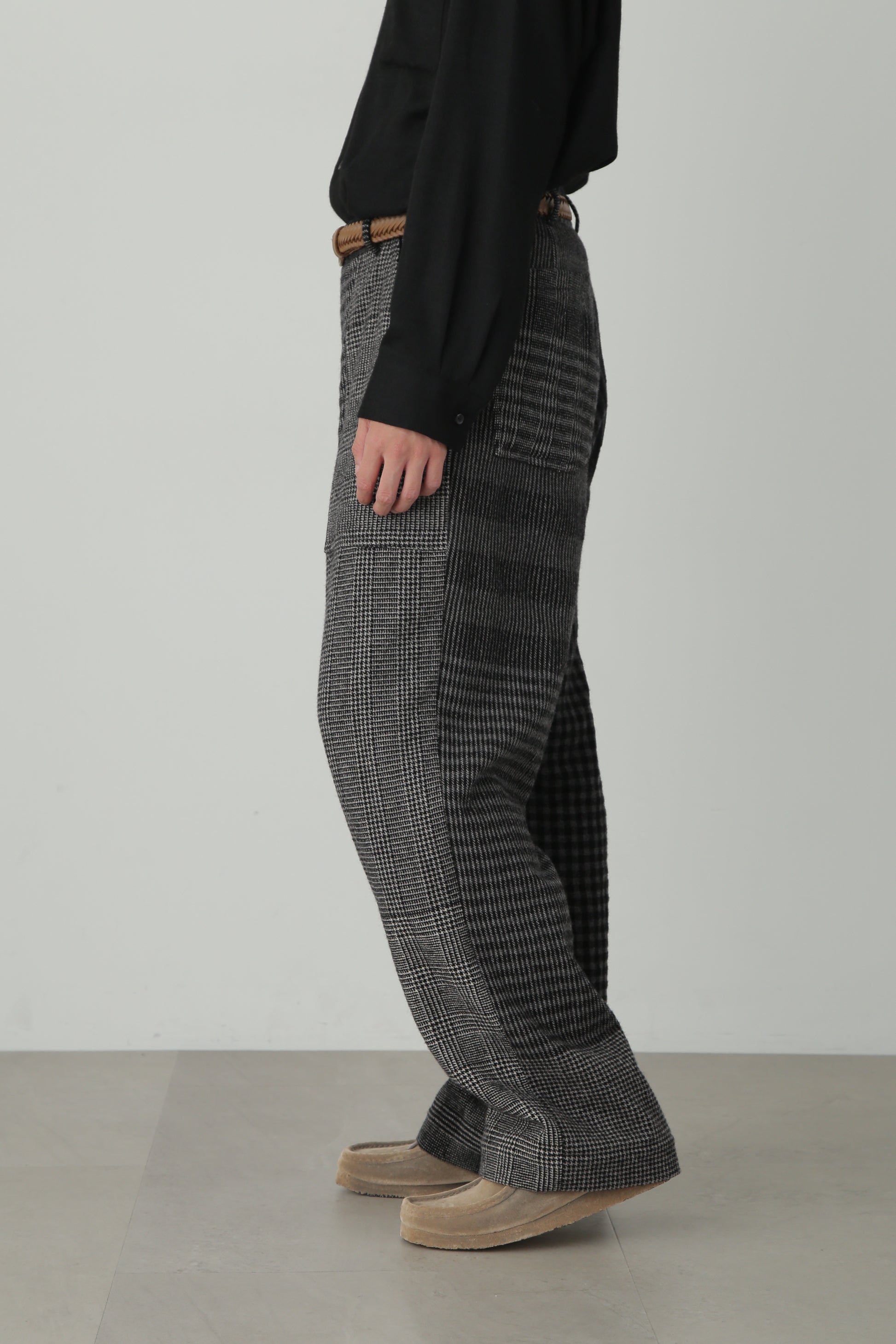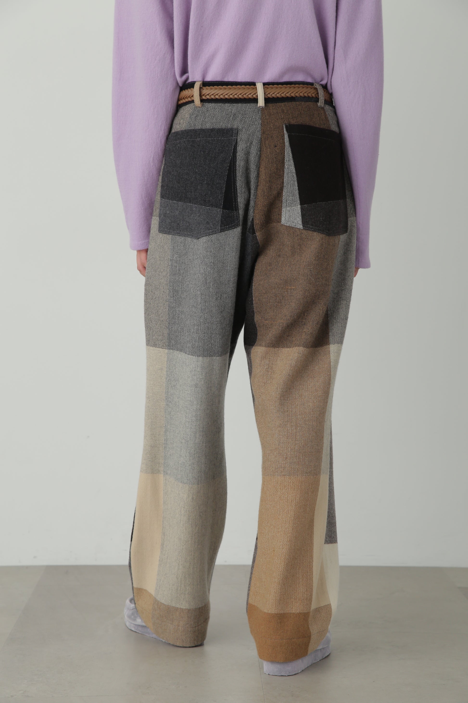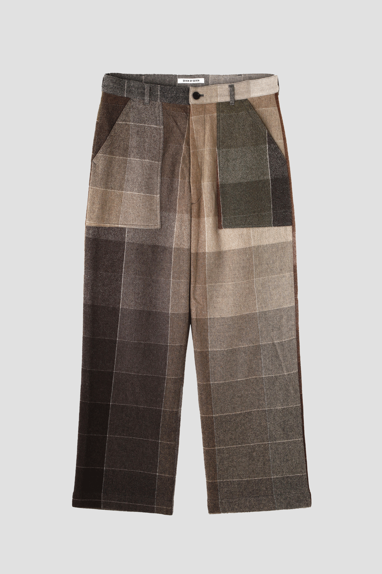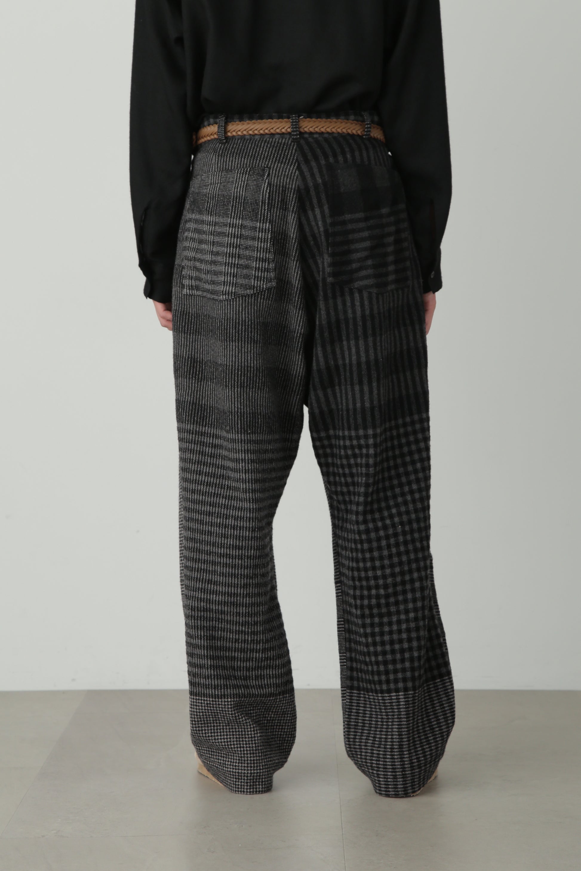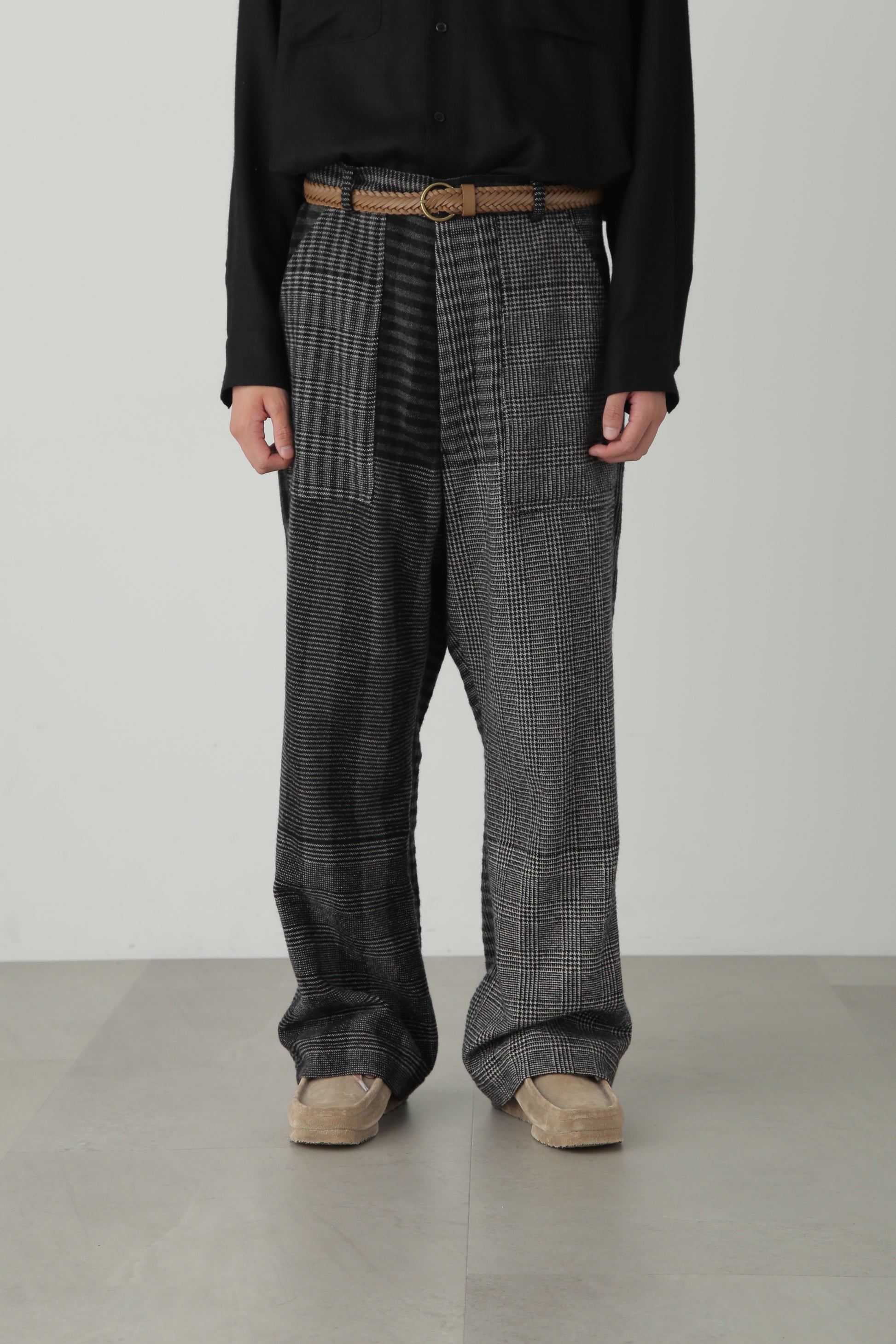When making yarn-dyed materials, the fabric (mass sample) that is woven with various warp and weft variations uses multiple colors of threads in both the vertical and horizontal directions, so it is a material that is almost completely unsuitable for mass production. It has only been used as a reference for the coloring of the fabric in the pre-process of making the material, but due to the huge cost, it is rarely made in modern times. However, the brand has noticed the interestingness of this mass sample fabric and has been steadily collecting deadstock materials. This time, we have finally collected enough volume to make clothes, so we are developing it in several variations of styles. This is a fatigue design trouser that has been made with as much unnecessary detail as possible to highlight the interestingness of this material, while creating a change in the pattern with an attached pocket. Please enjoy the gradation unique to this material, such as the difference in texture of each part and the change in color as it approaches the hem, and the difference in the pattern created by the assortment expression.