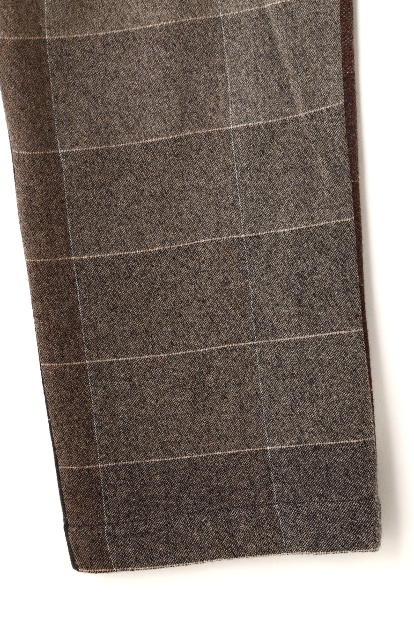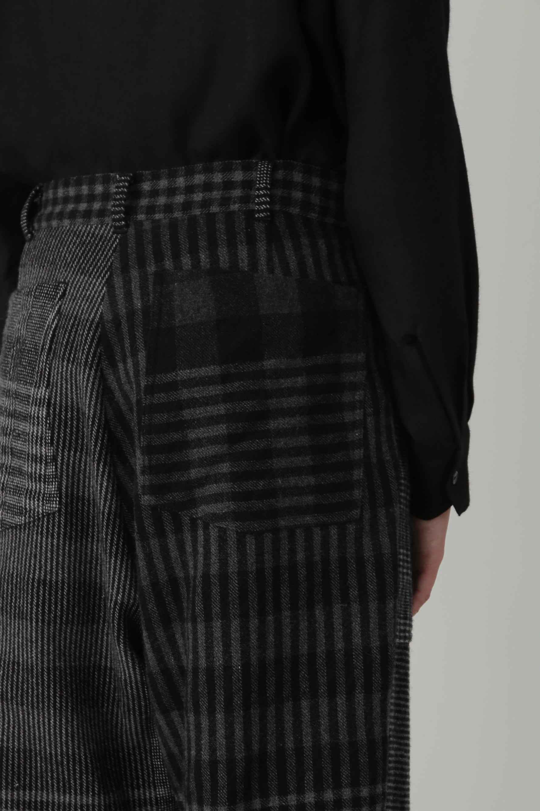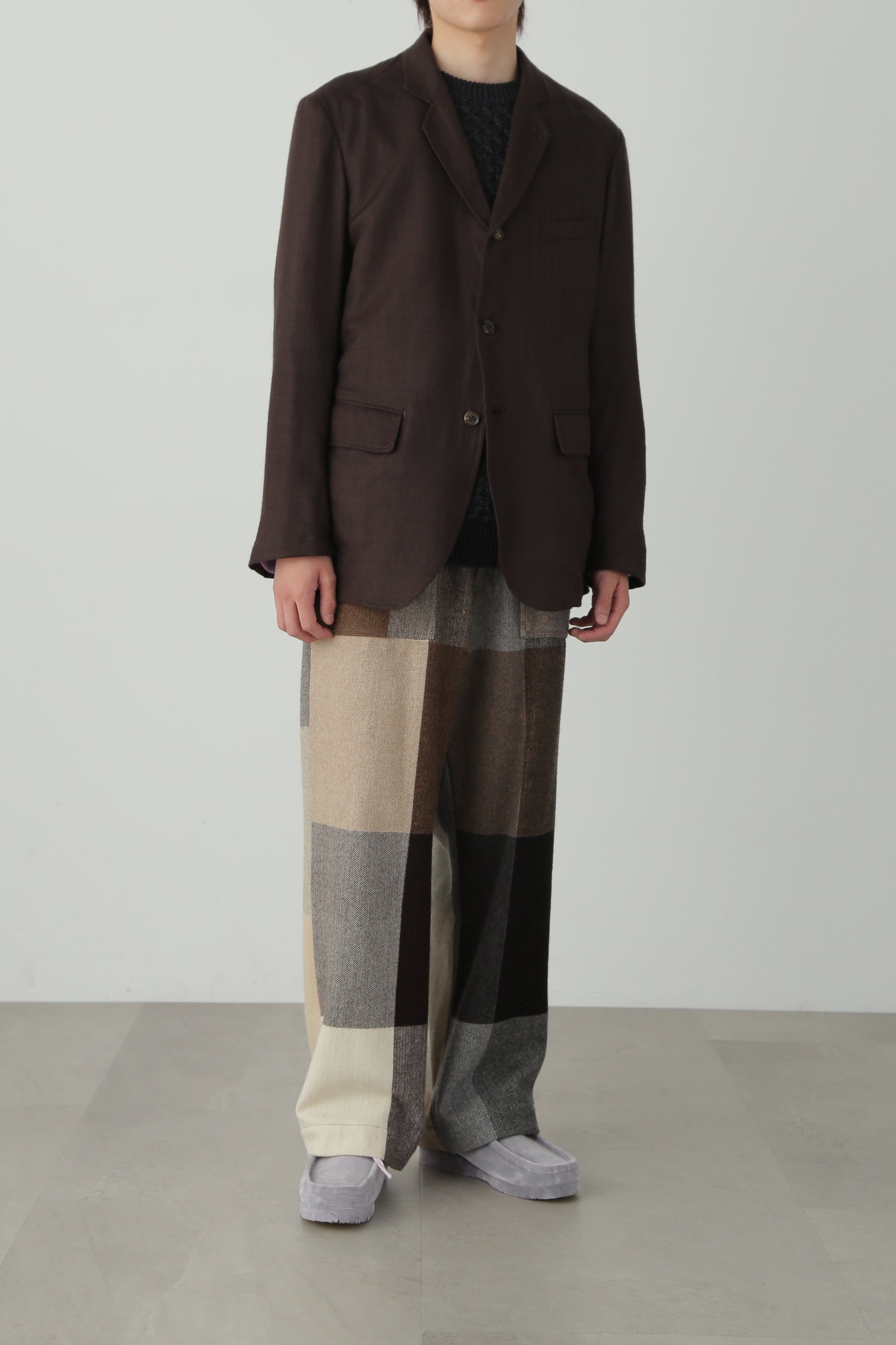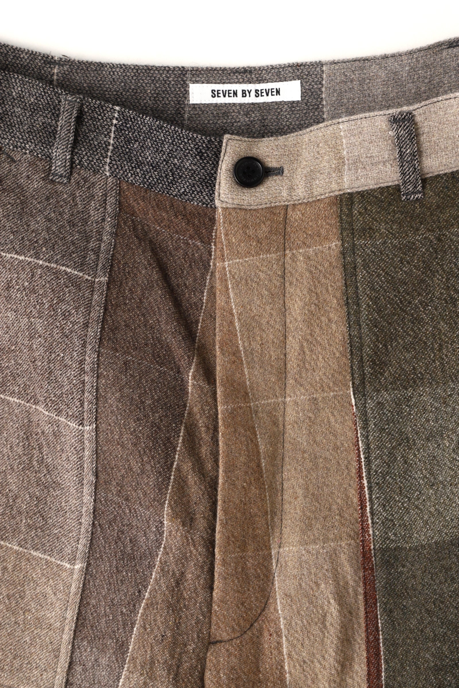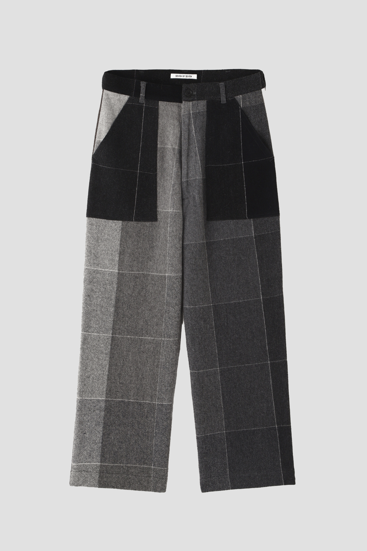 When making yarn-dyed materials, the fabric (mass sample) that is woven with various warp and weft variations uses multiple colors of threads in both the vertical and horizontal directions, so it is a material that is almost completely unsuitable for mass production. It has only been used as a reference for the coloring of the fabric in the pre-process of making the material, but due to the huge cost, it is rarely made in modern times. However, the brand has noticed the interestingness of this mass sample fabric and has been steadily collecting deadstock materials. This time, we have finally collected enough volume to make clothes, so we are developing it in several variations of styles. This is a fatigue design trouser that has been made with as much unnecessary detail as possible to highlight the interestingness of this material, while creating a change in the pattern with an attached pocket. Please enjoy the gradation unique to this material, such as the difference in texture of each part and the change in color as it approaches the hem, and the difference in the pattern created by the assortment expression.
