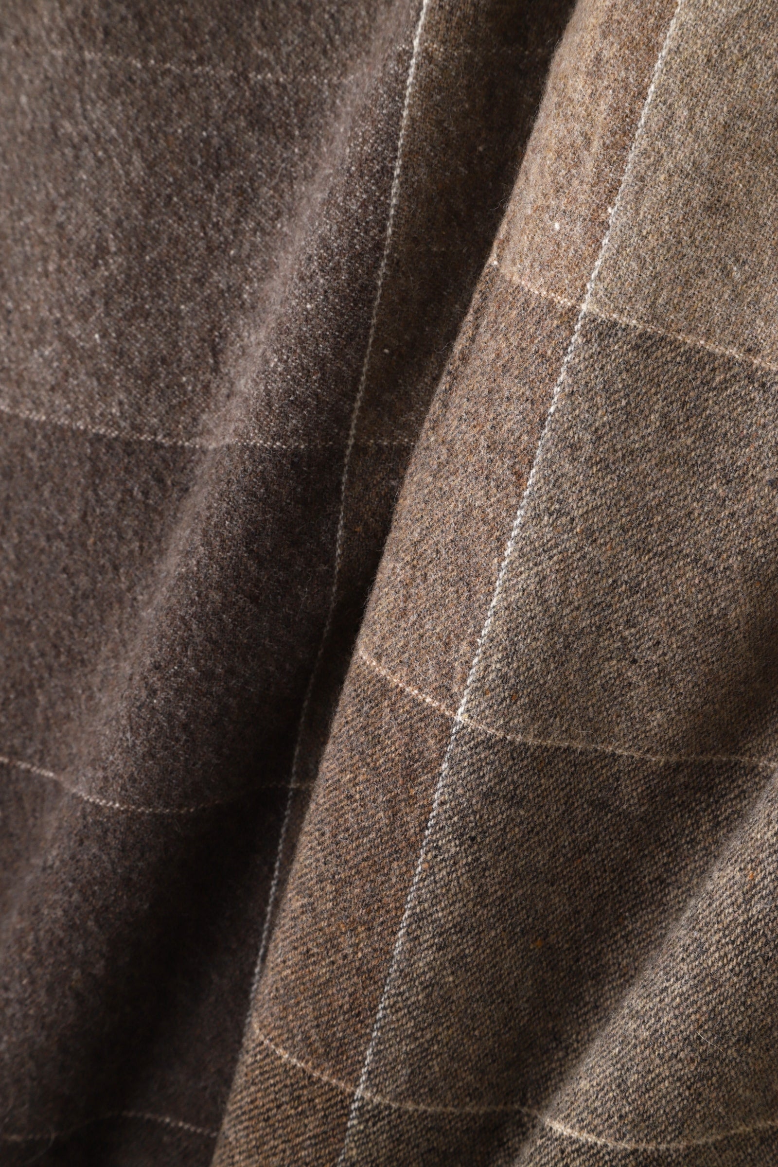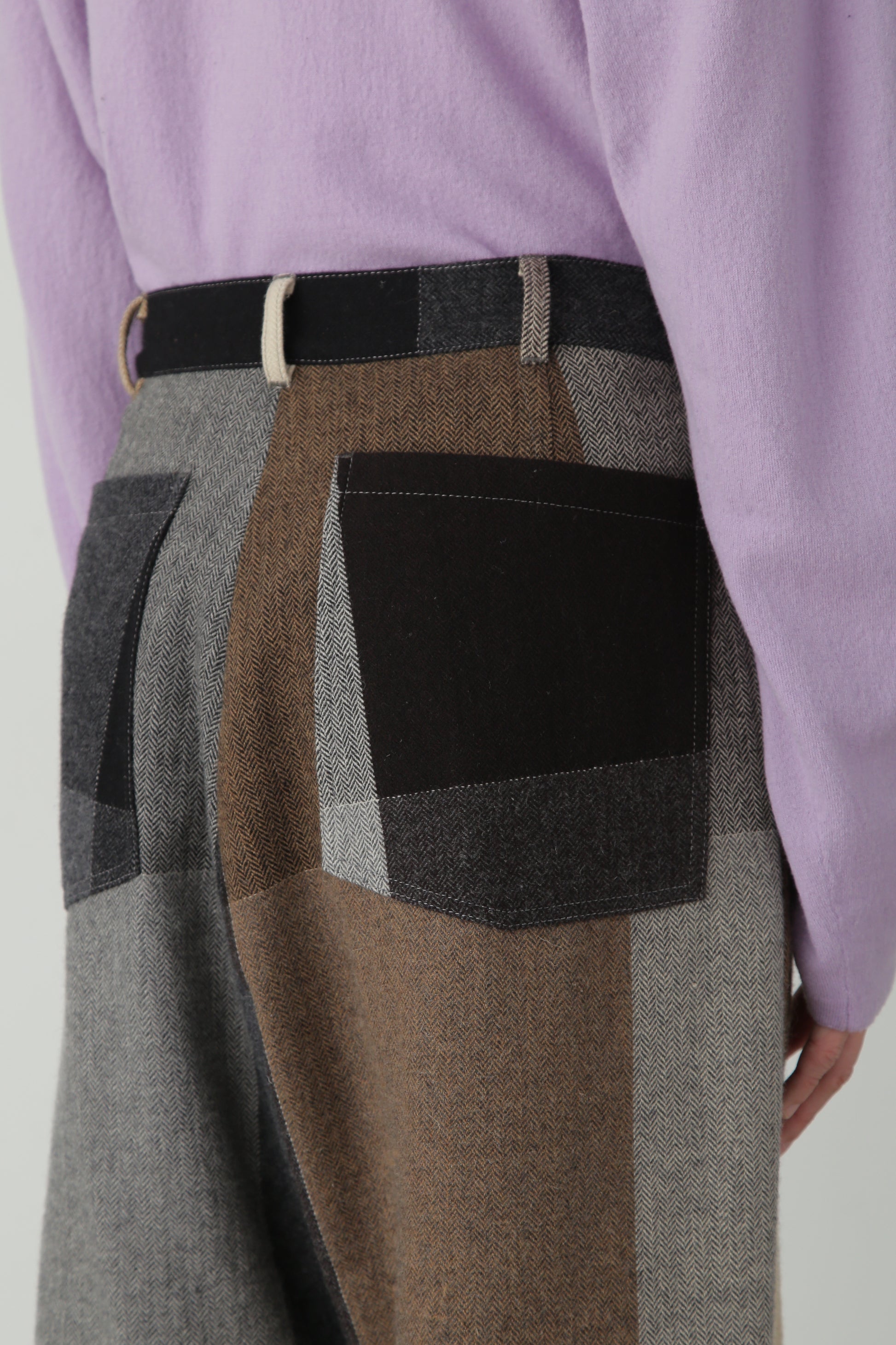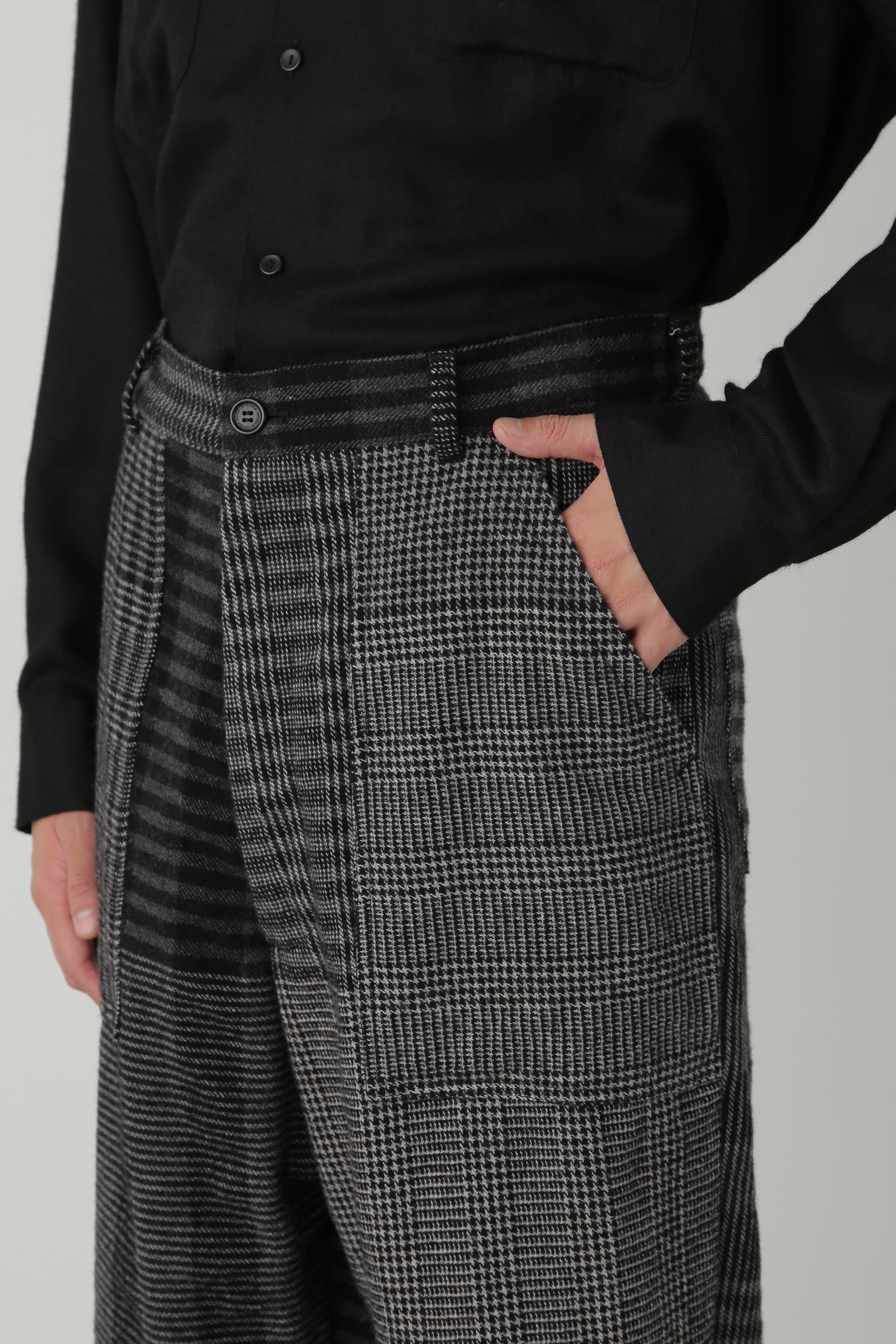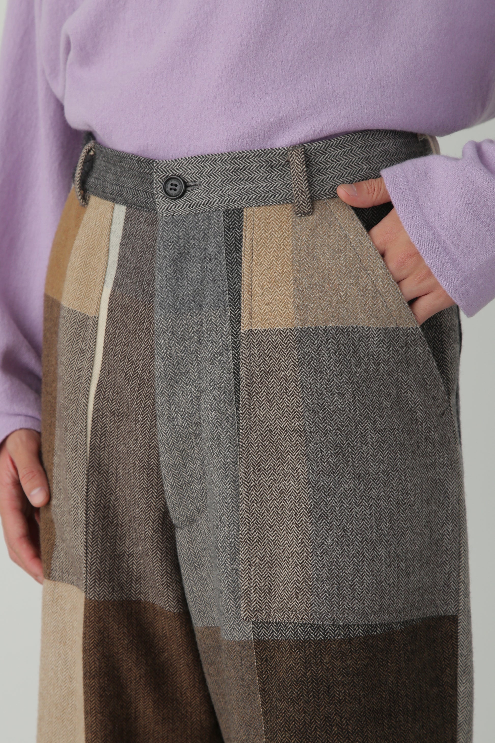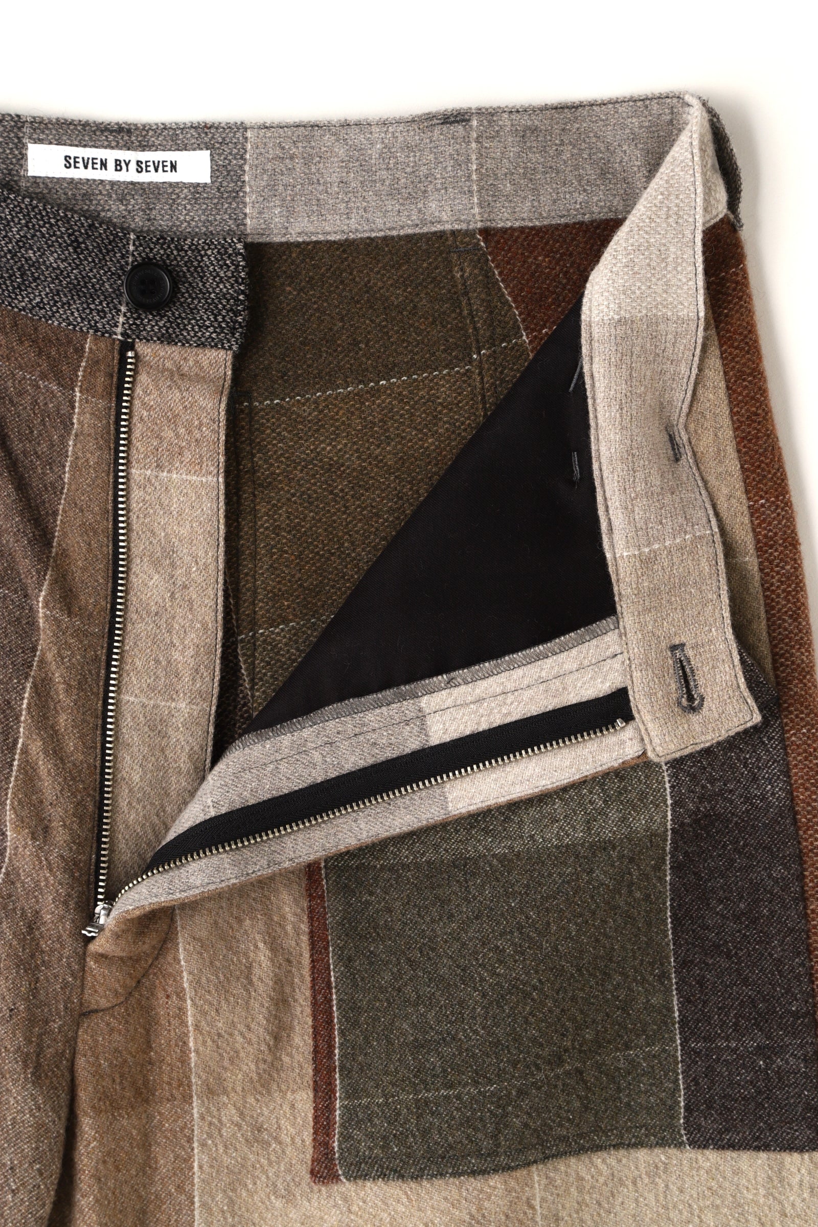 When making yarn-dyed materials, the fabric (mass sample) that is woven with various warp and weft variations uses multiple colors of threads in both the vertical and horizontal directions, so it is a material that is almost completely unsuitable for mass production. It has only been used as a reference for the coloring of the fabric in the pre-process of making the material, but due to the huge cost, it is rarely made in modern times. However, the brand has noticed the interestingness of this mass sample fabric and has been steadily collecting deadstock materials. This time, we have finally collected enough volume to make clothes, so we are developing it in several variations of styles. This is a fatigue design trouser that has been made with as much unnecessary detail as possible to highlight the interestingness of this material, while creating a change in the pattern with an attached pocket. Please enjoy the gradation unique to this material, such as the difference in texture of each part and the change in color as it approaches the hem, and the difference in the pattern created by the assortment expression.