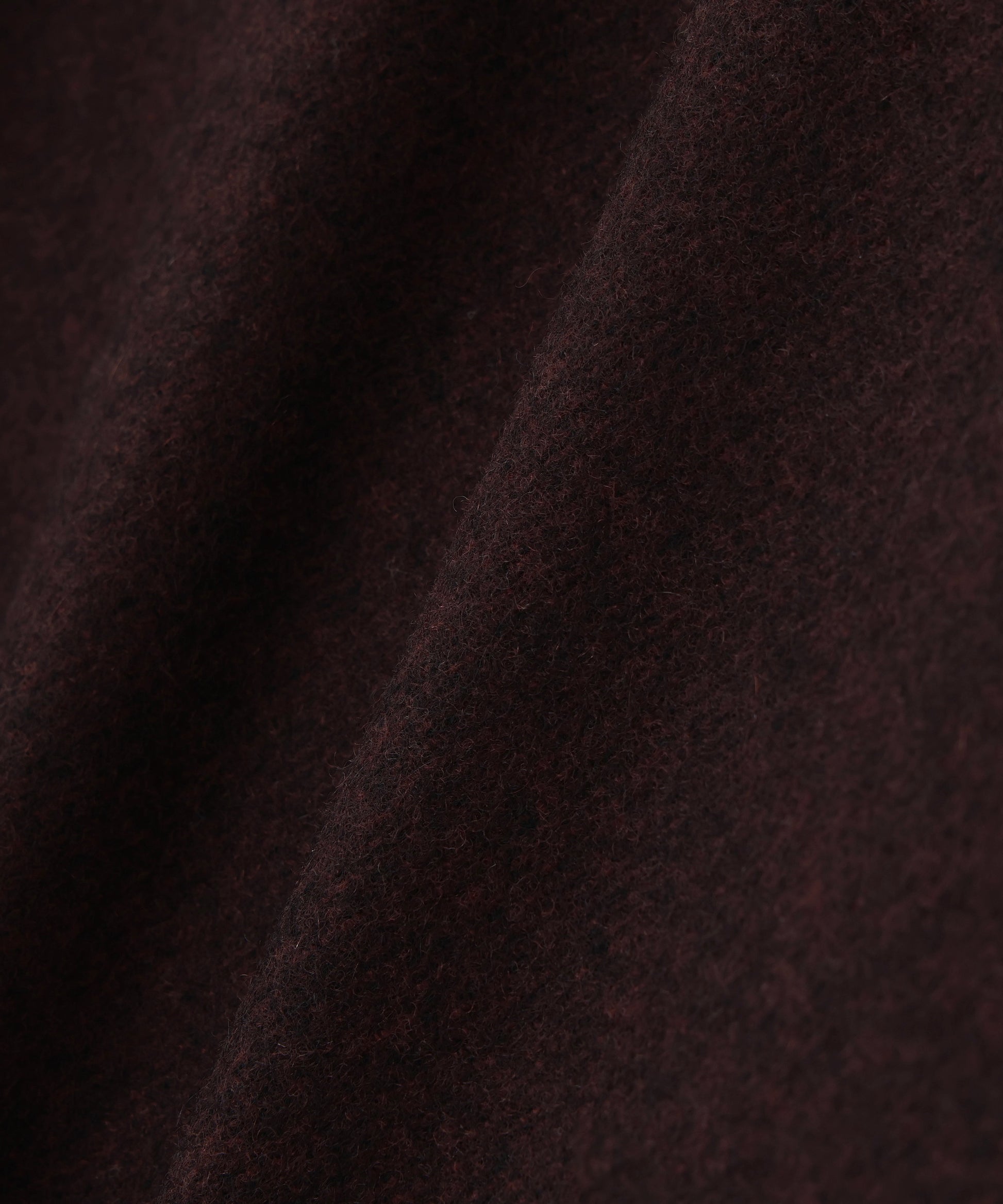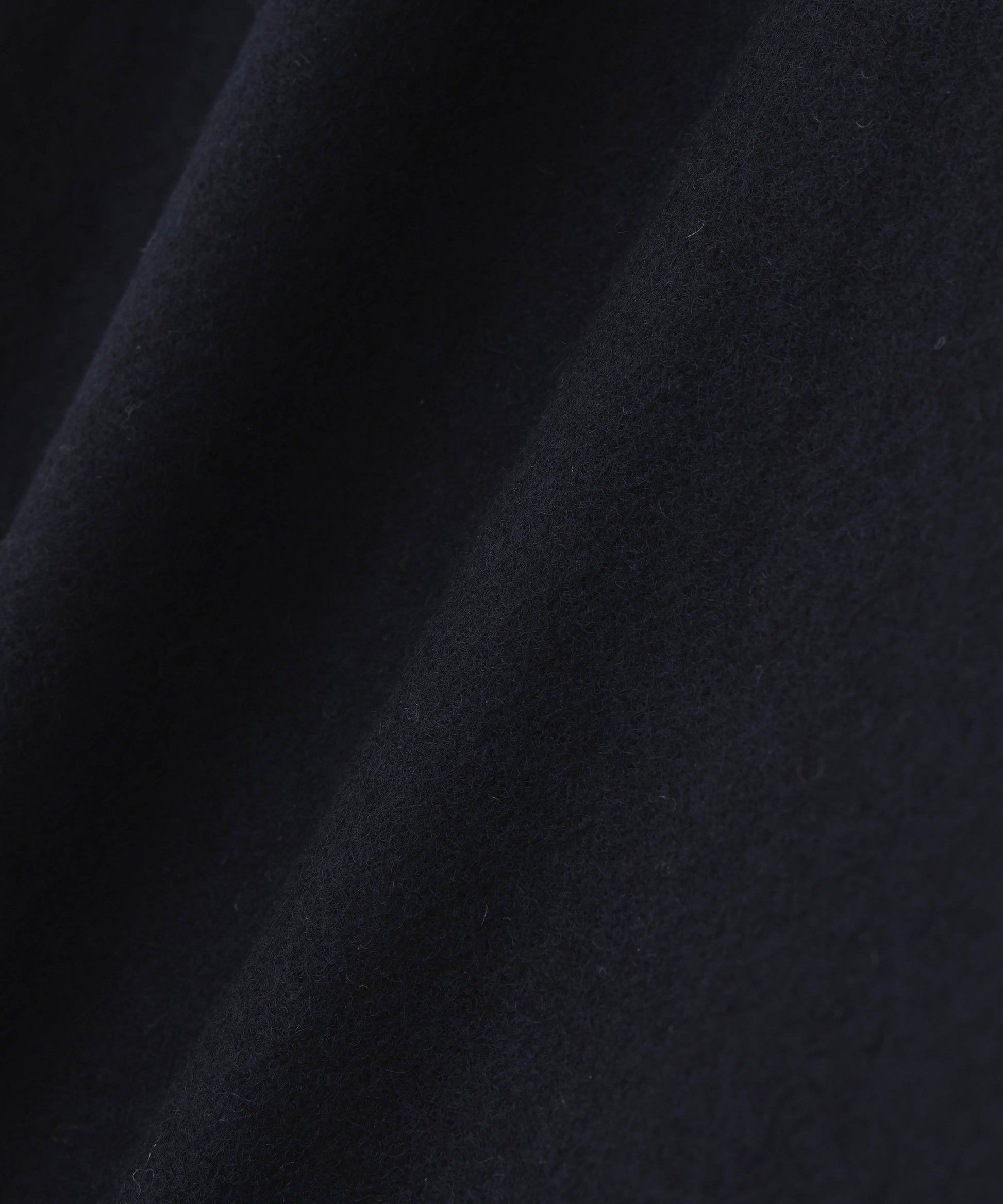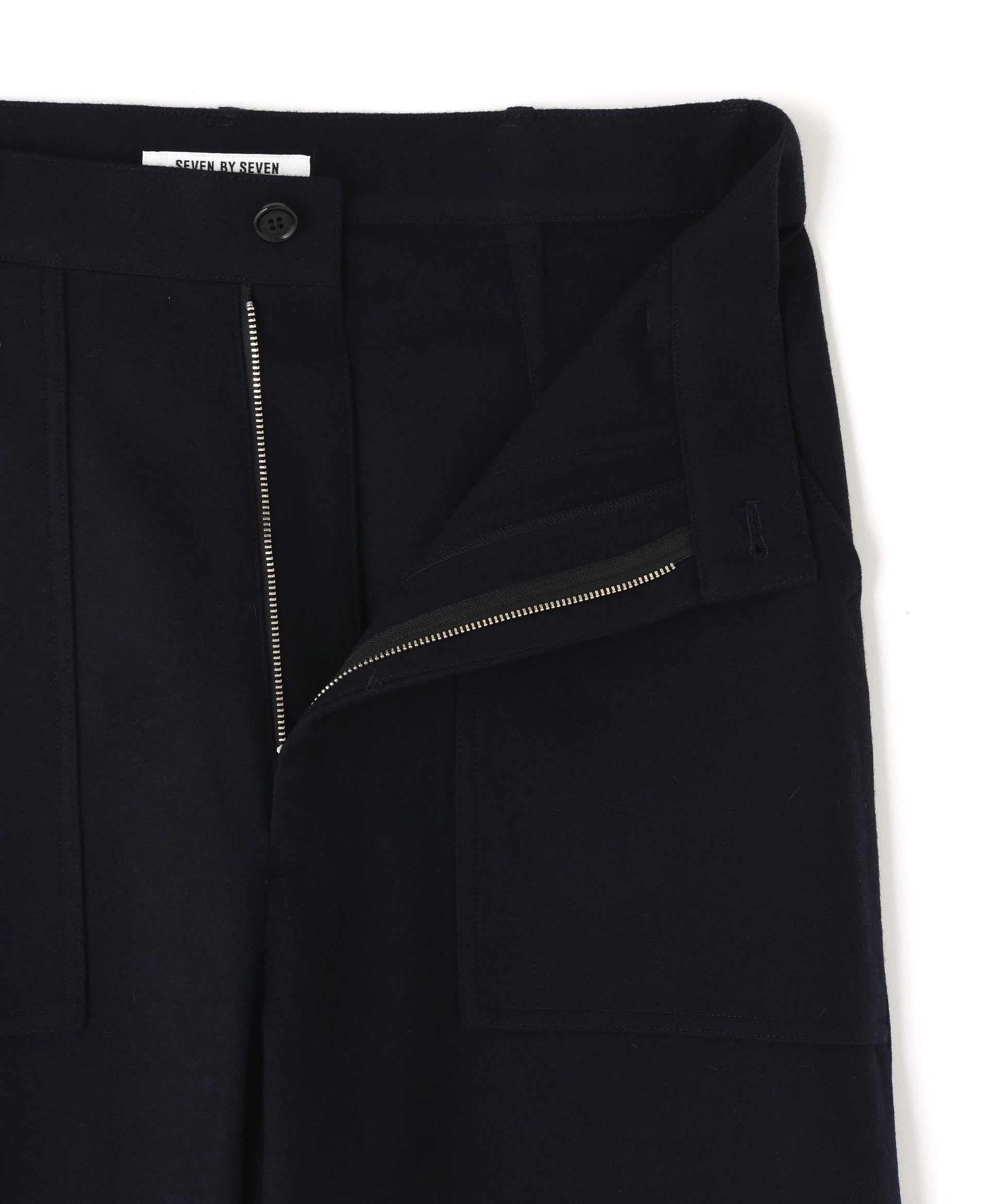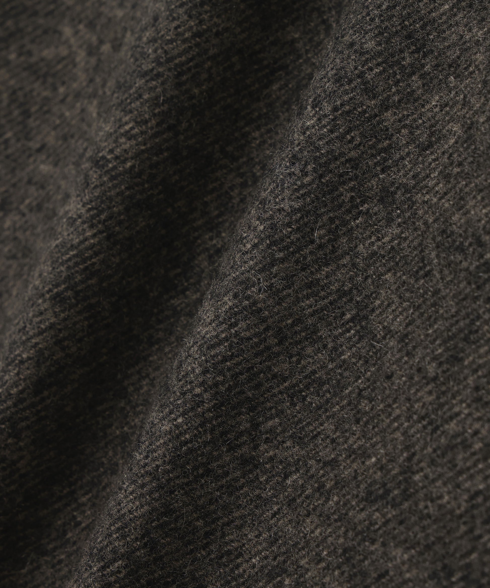 質感の異なる5種のウールをブレンドした糸をしっかりとした規格で織り上げメルトン生地は、高密度ながらも柔らかさがあり、タッチの優しい仕上がりとなっています。余白たっぷりなシルエットと素材のハリコシが相まって独特なドレープ感が生まれるのもデザインの特徴となっています。ファティーグパンツのデザインながらもベースのシルエットはスラックスをイメージした仕上がりの為、カジュアルな印象ながらも綺麗に着用出来るのも特徴の一つです。単体での使用は勿論のこと、同素材で作製したブルゾンやシャツなどとも相性の良い、上質なメルトン素材のファティーグトラウザーです。
