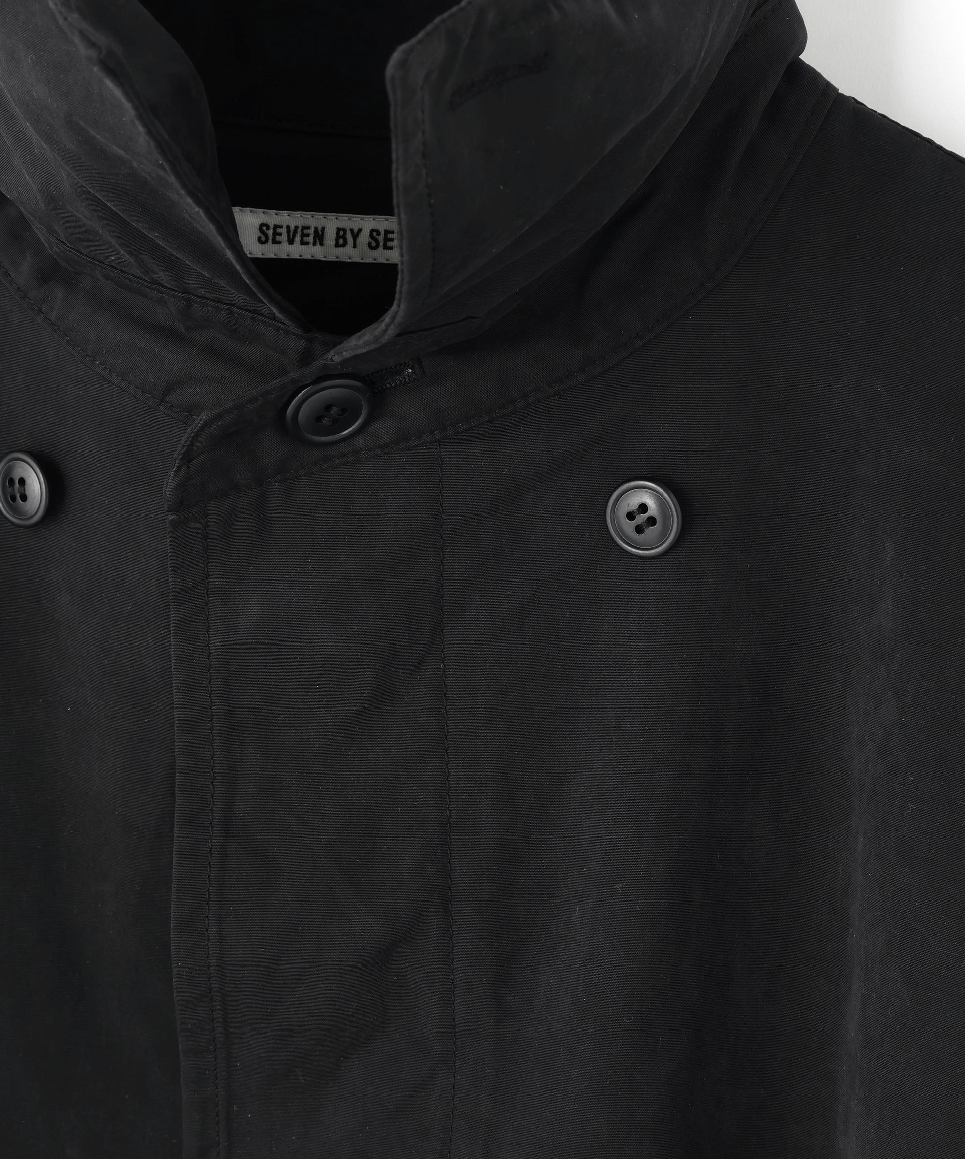 高密度のワックス素材を採用して作製した特徴的なデザインのウィンドコート。