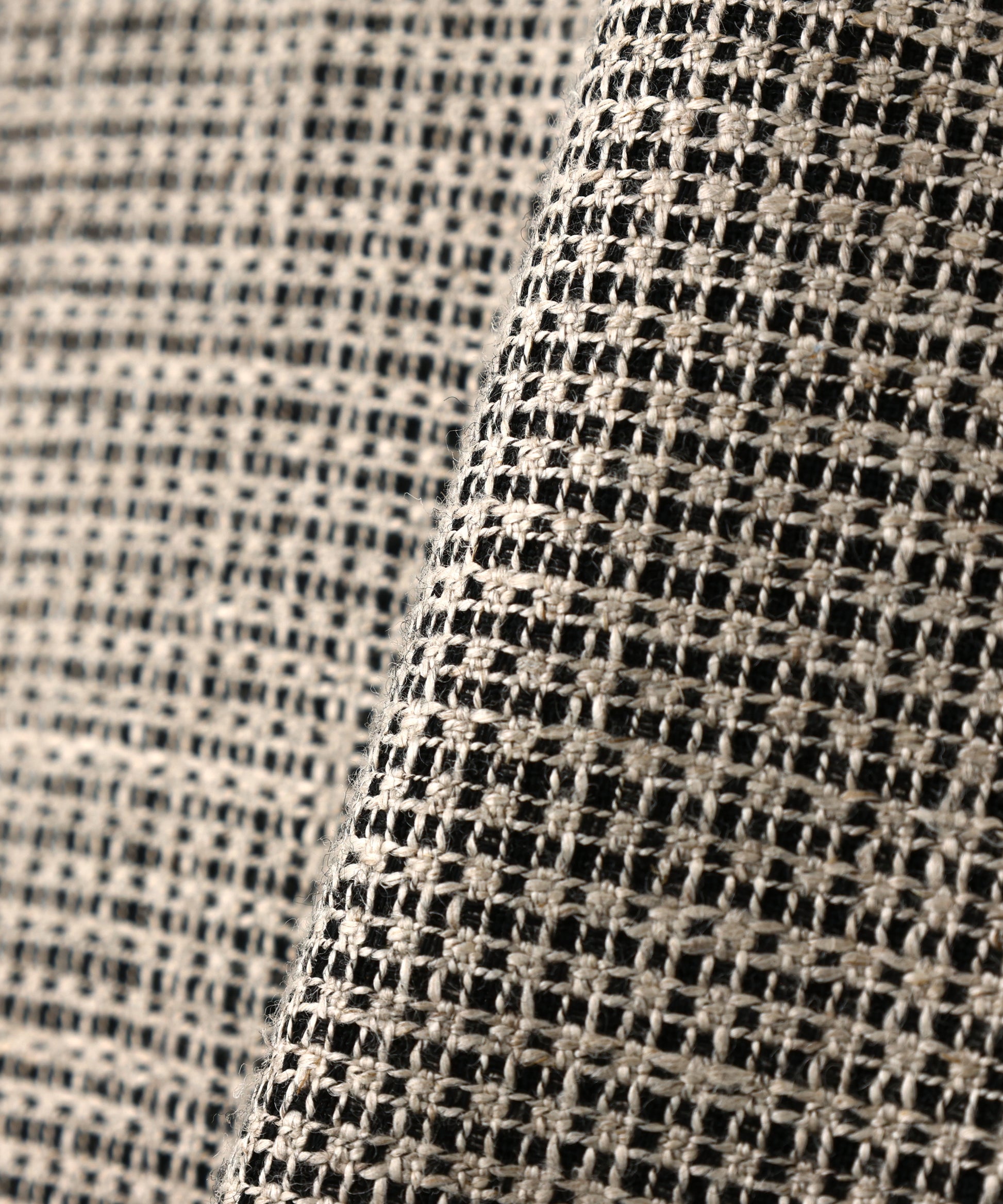 リネンにナイロンフィラメントの杢糸を組み合わせウールと交織(経糸と緯糸で素材の異なるものを組み合わせること)させた生地は、交織の際に2種類の織り方を組み合わせながら織ることで、透け感がありながらも凹凸のある表情に仕上がりました。