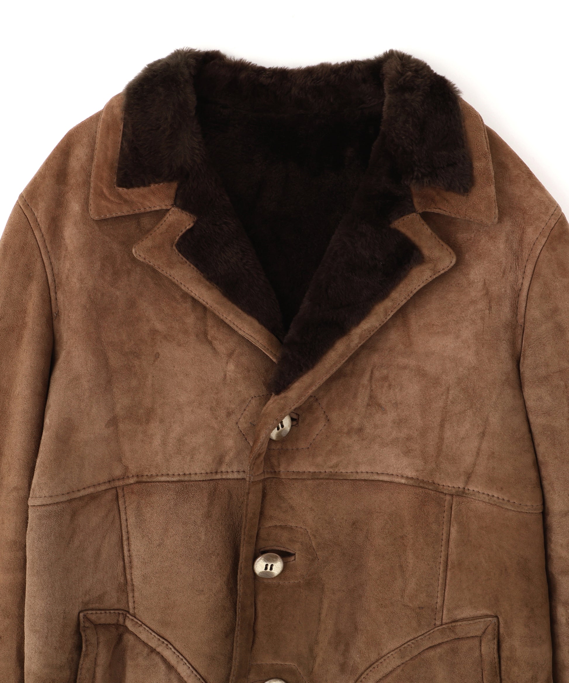 ブラウンのムートンジャケット、大きめの3つボタン仕様でクラシックで上品に着用できるのが特徴。