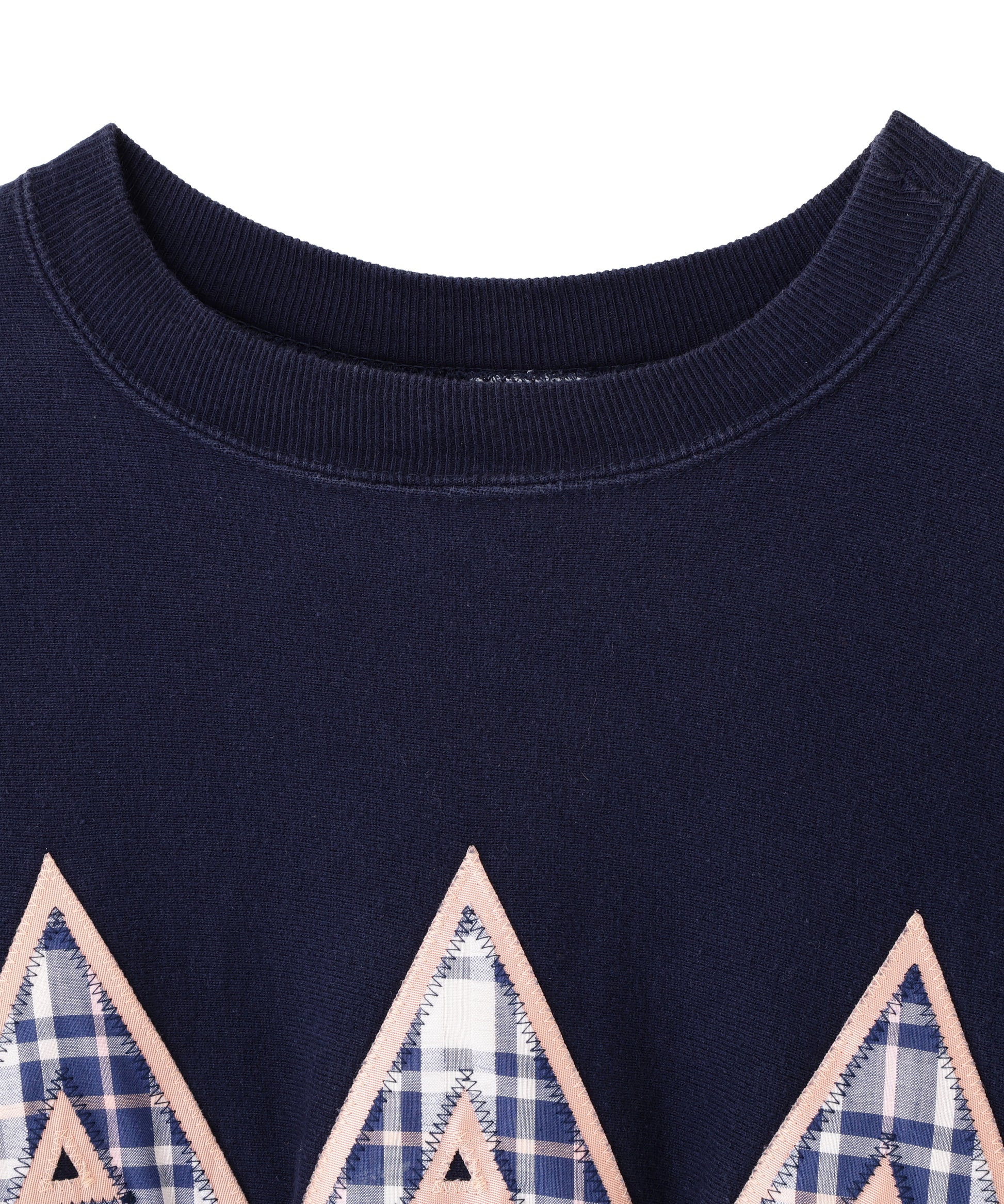 ネイビーボディに、チェック柄を落とし込んだトライアングルモチーフが映えるクルーネックスウェット。フロントのワッペンデザインが程よいアクセントになり、1枚で主役になるアイテム。 *コンディション:GOOD