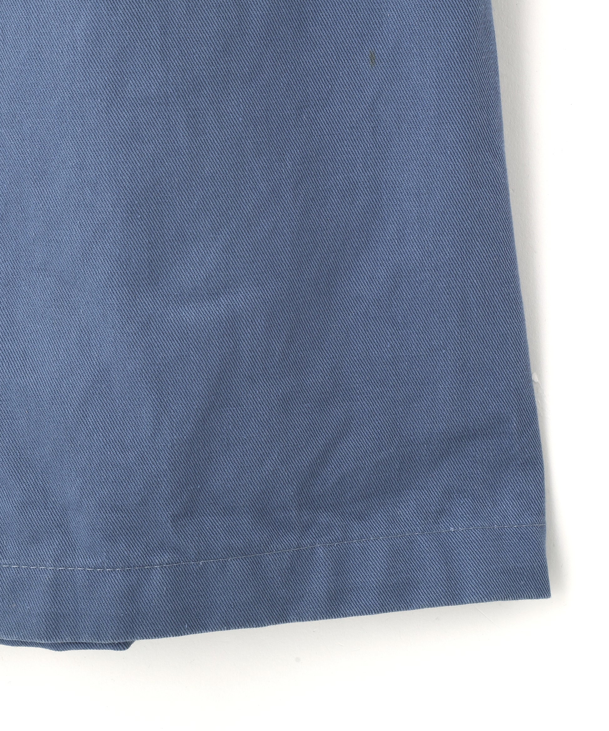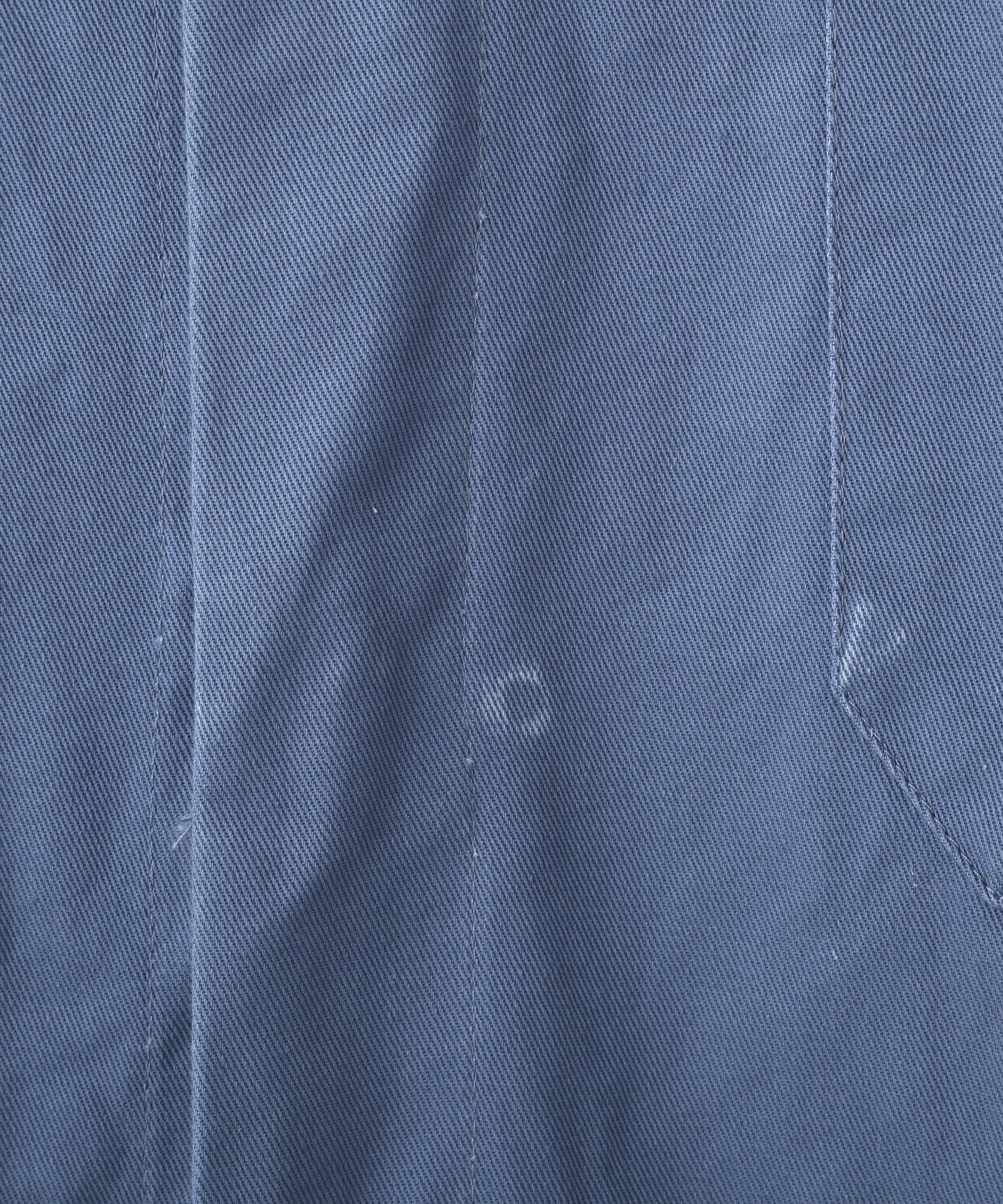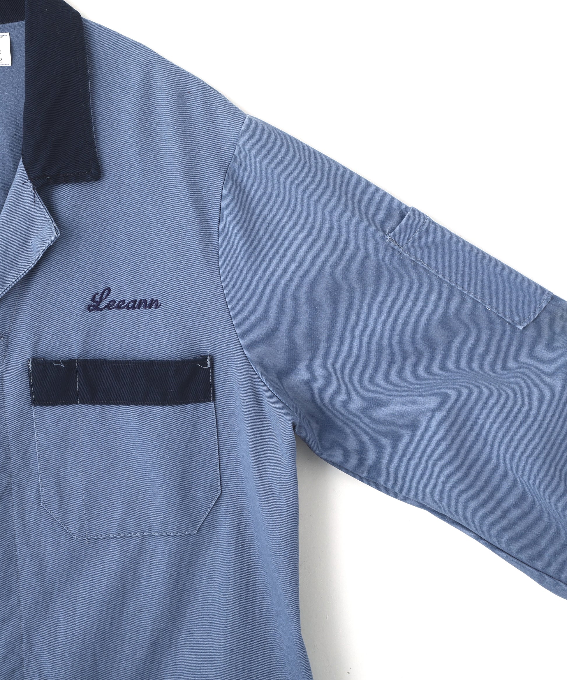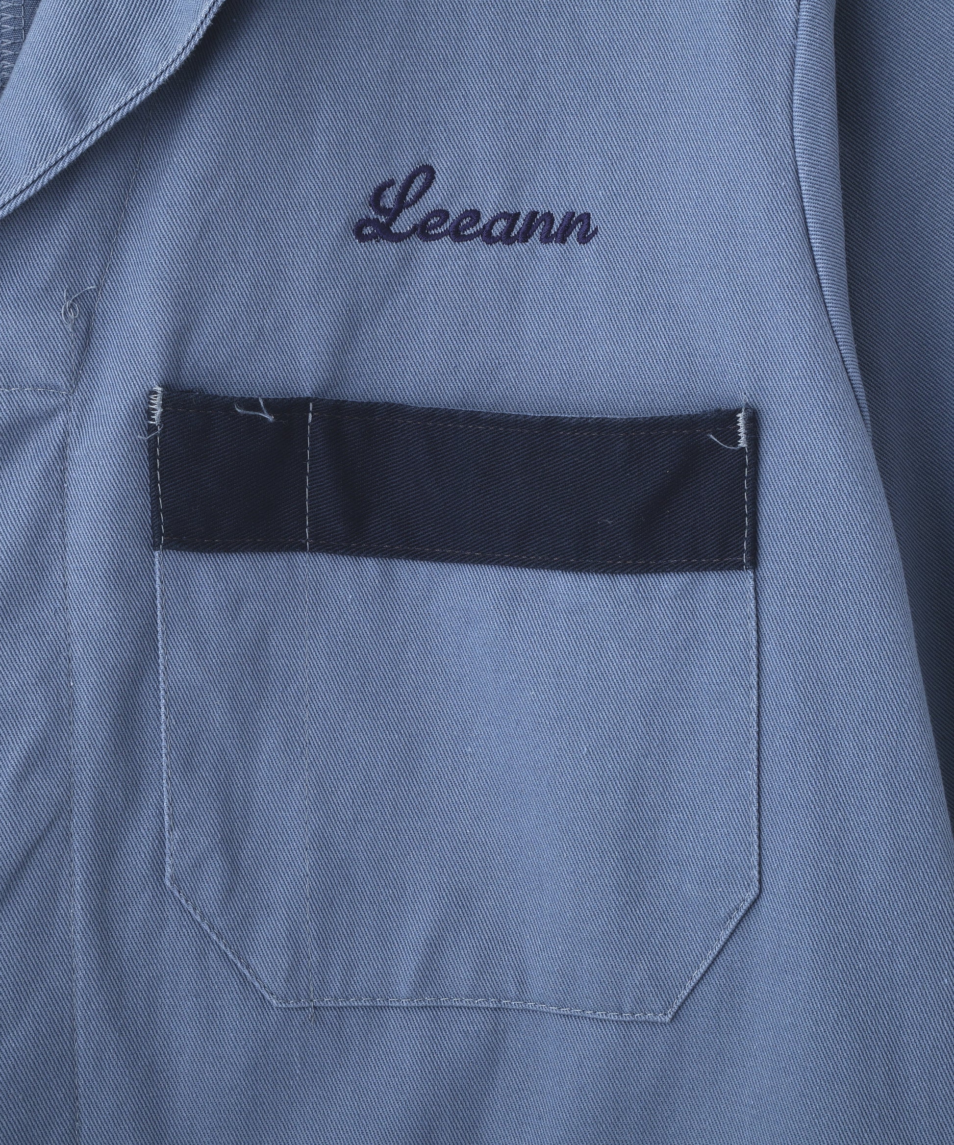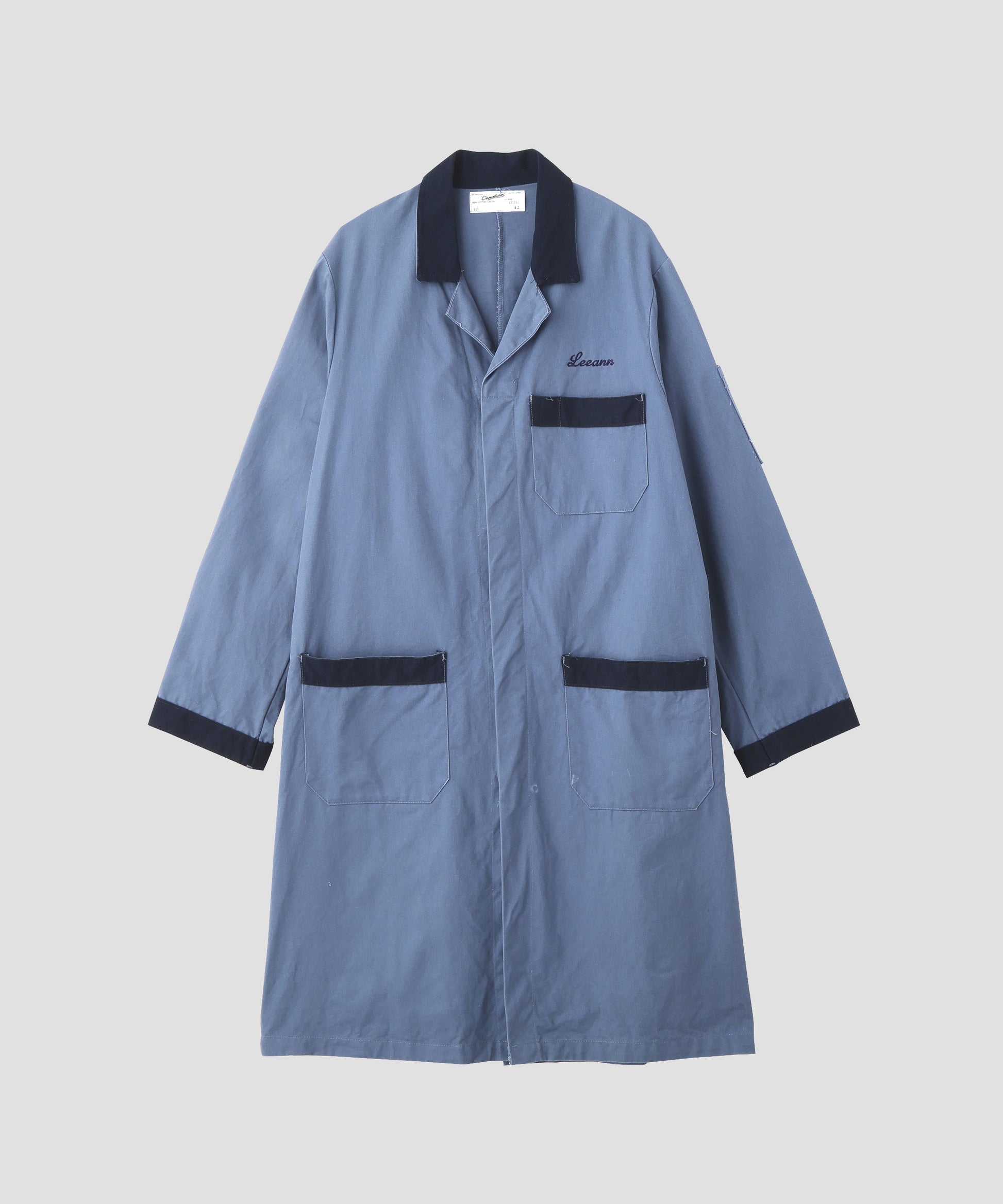 落ち着いたブルーグレーのボディに、襟元・ポケット・袖口へネイビーの切り替えを施した、クラシックなワークコートデザインの一着。胸元には「Leeann」の刺繍入りで、さりげないアクセントに。