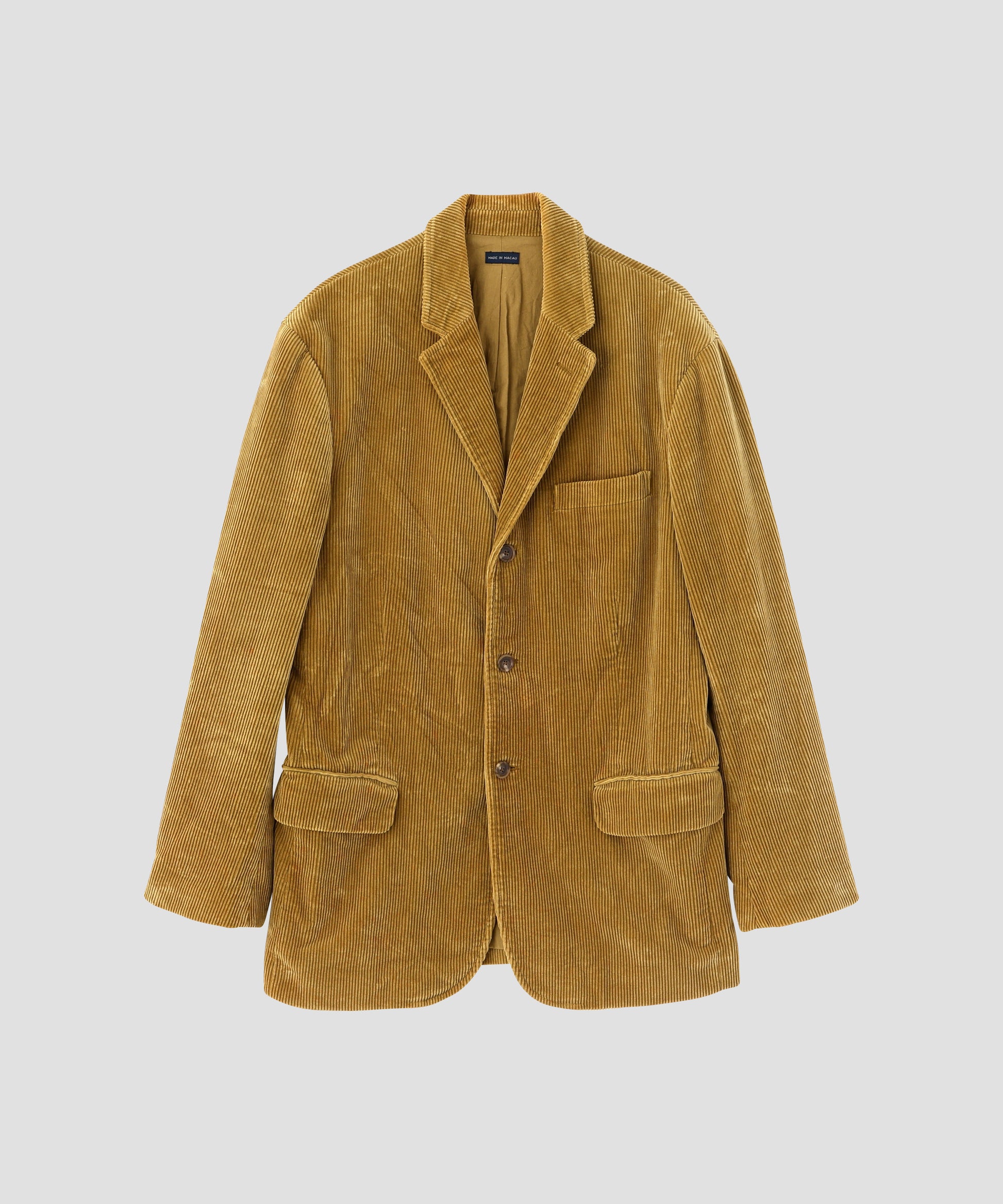 MADE IN MACAU。90s後半-00s前半のPolo RL。キャメルの存在感がある太畝が特徴的なコーデュロイ。3つボタンも相まってクラシックな印象に。