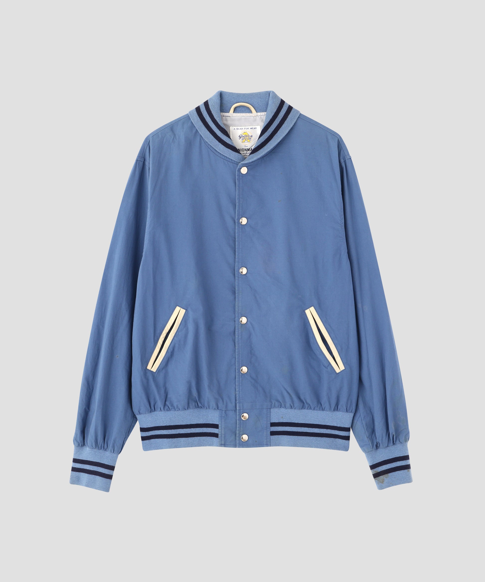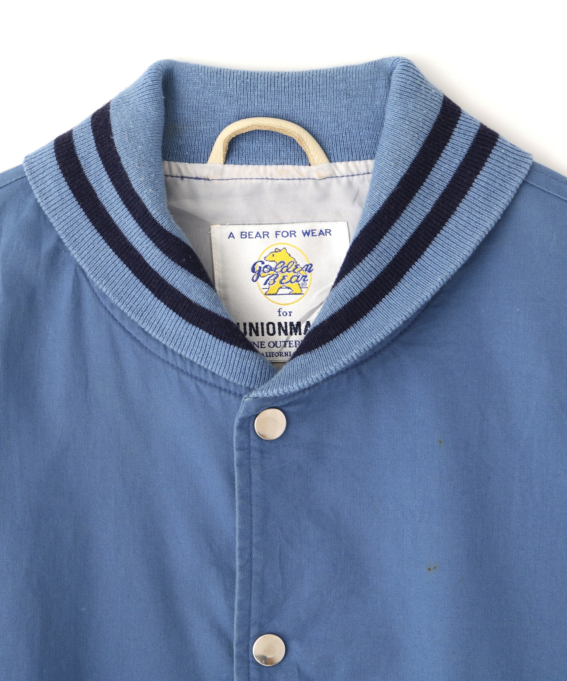 サンフランシスコ発のGolden BearとサンフランシスコのセレクトショップUnion Madeのコラボスタジャン。爽やかな淡いライトブルーのボディーにホワイトレザー切り替えが特徴。
