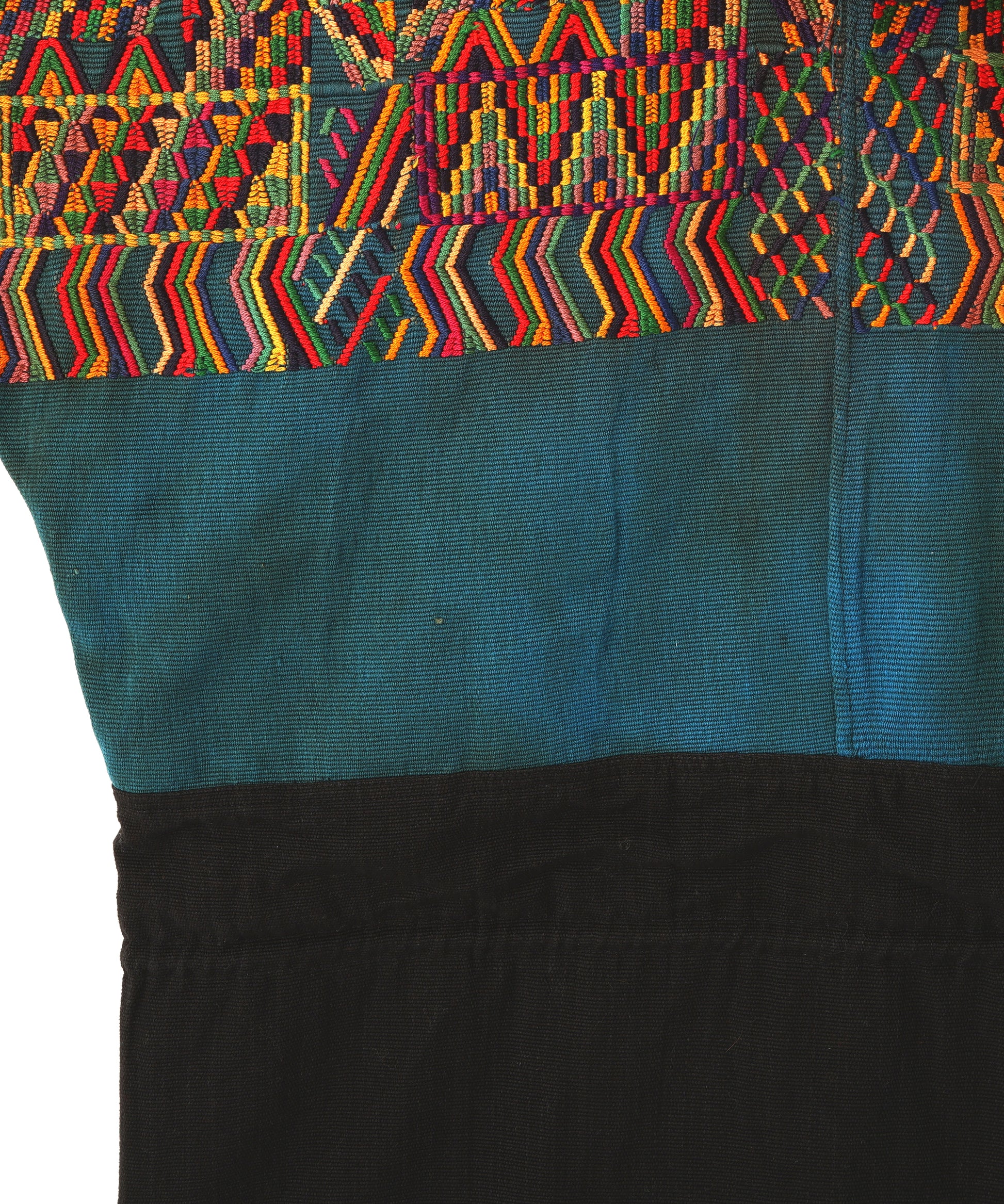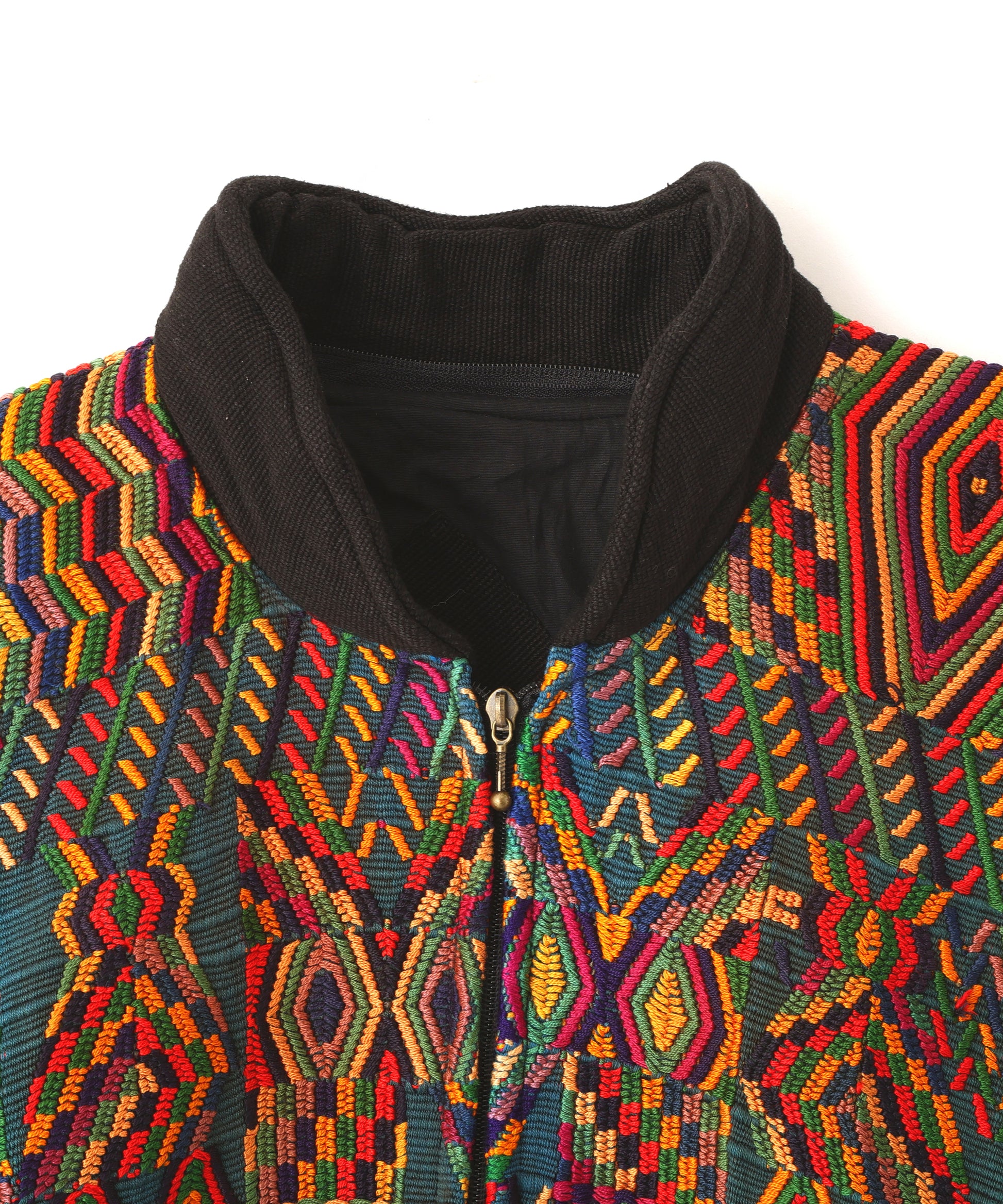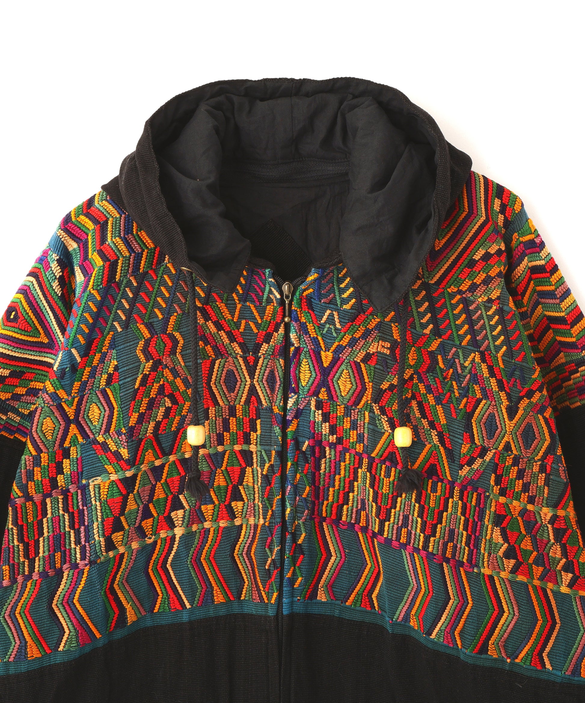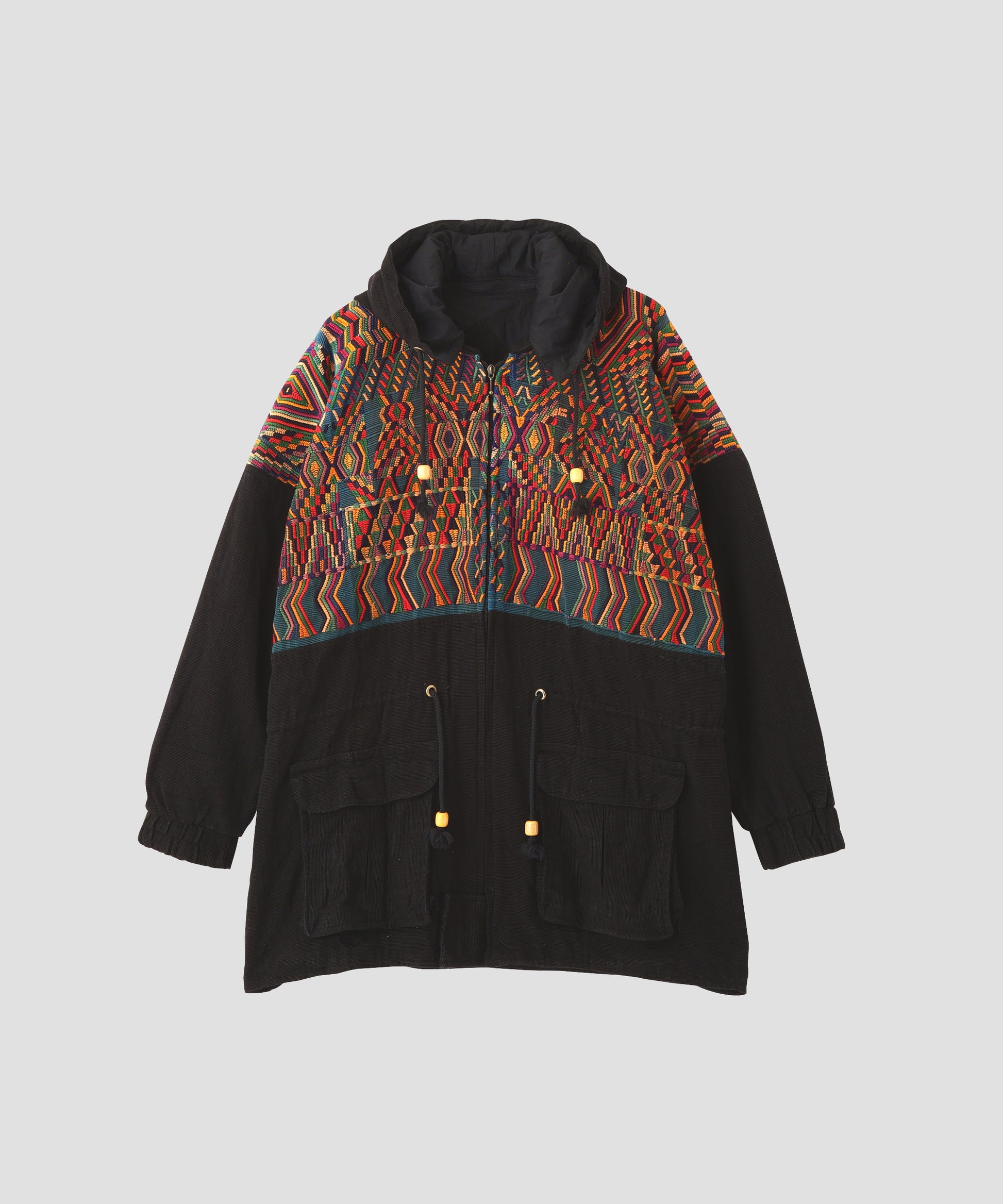 ブラックボディに民族調のカラフルな織柄パネルを大胆に切り替えた、存在感抜群のフーデッドジャケット。レッド・グリーン・イエロー・ブルーなどを組み合わせた緻密な幾何学刺繍がフロント上部に施されたデザインが魅力。フードは取り外しが可能。