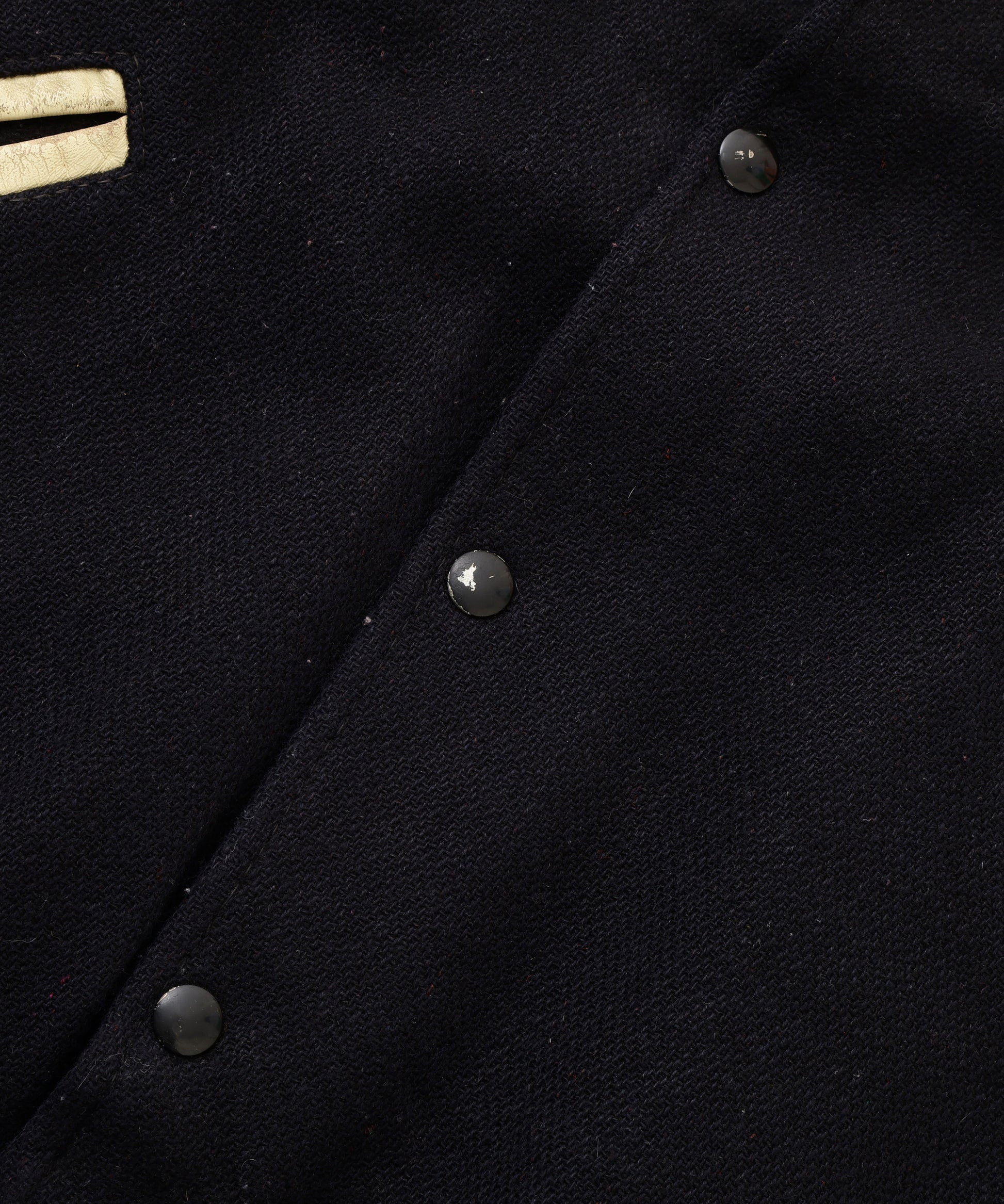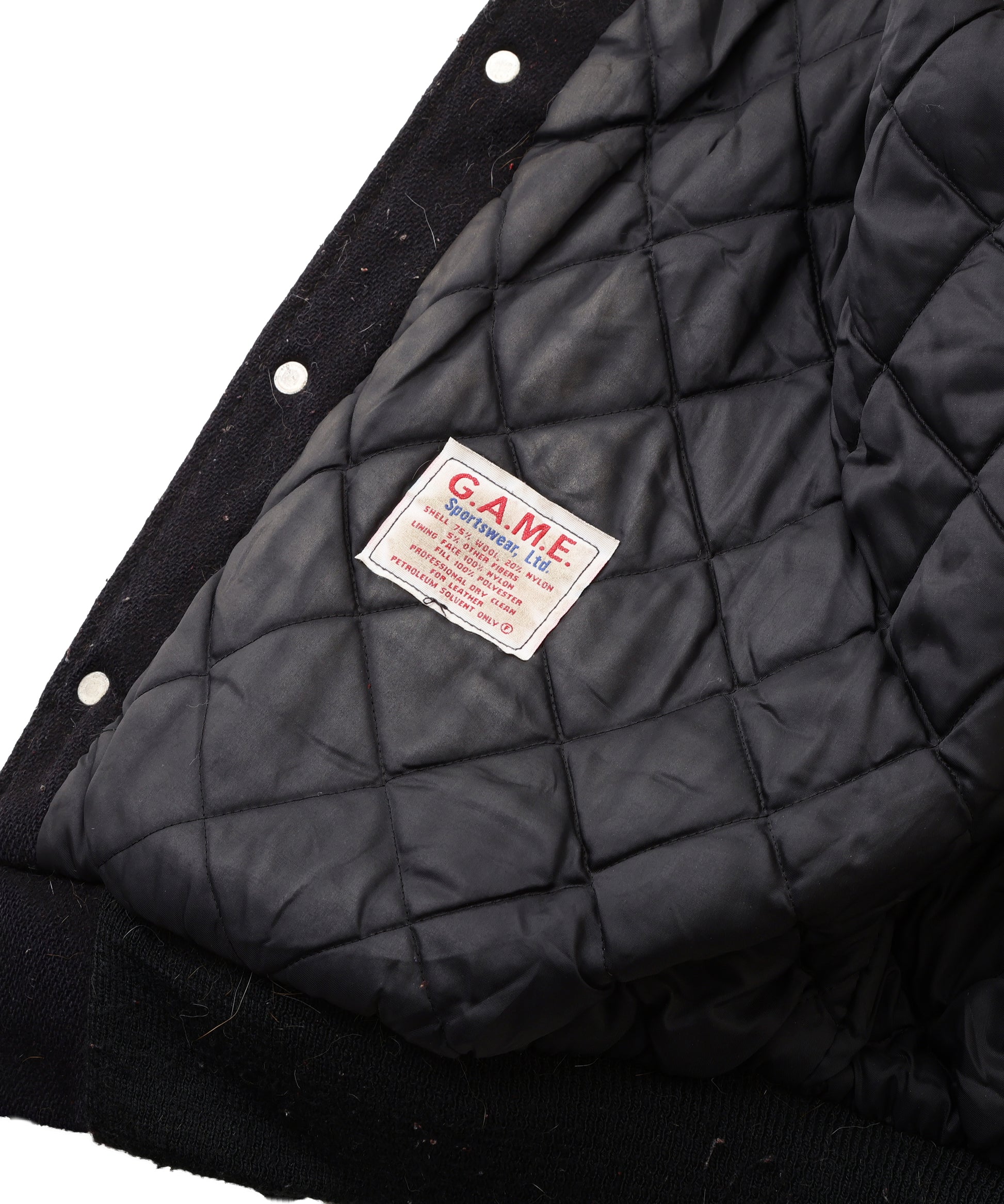 ブラックのウールボディに、アイボリーのレザースリーブを組み合わせた王道デザインのスタジアムジャケット。襟・袖・裾にはレッドライン入りのリブを採用し、ヴィンテージ感のあるスポーティーな雰囲気を演出。 *コンディション:袖レザー部分に汚れ、ポケットに破れ、前身頃に毛玉あり