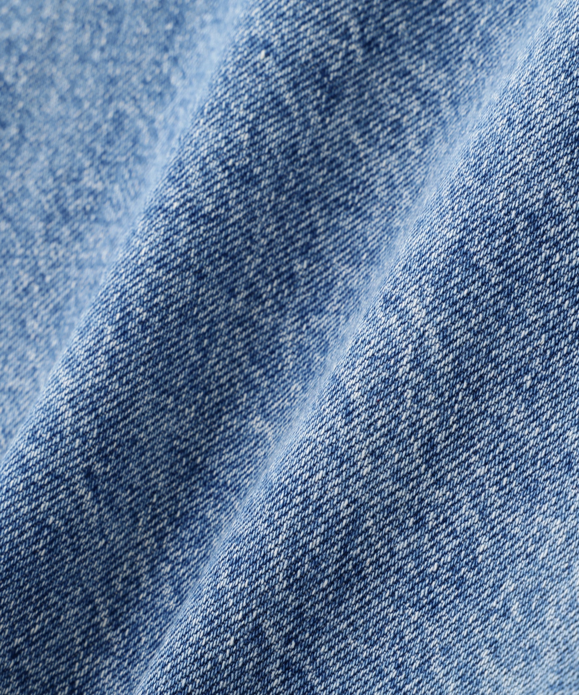 NIKE(ナイキ)のスウッシュロゴがワンポイントで入った、デニム素材のスタジアムジャケット。身頃はウォッシュのかかったライトブルーデニム、袖はホワイトのスウェット生地の切り替えが特徴。