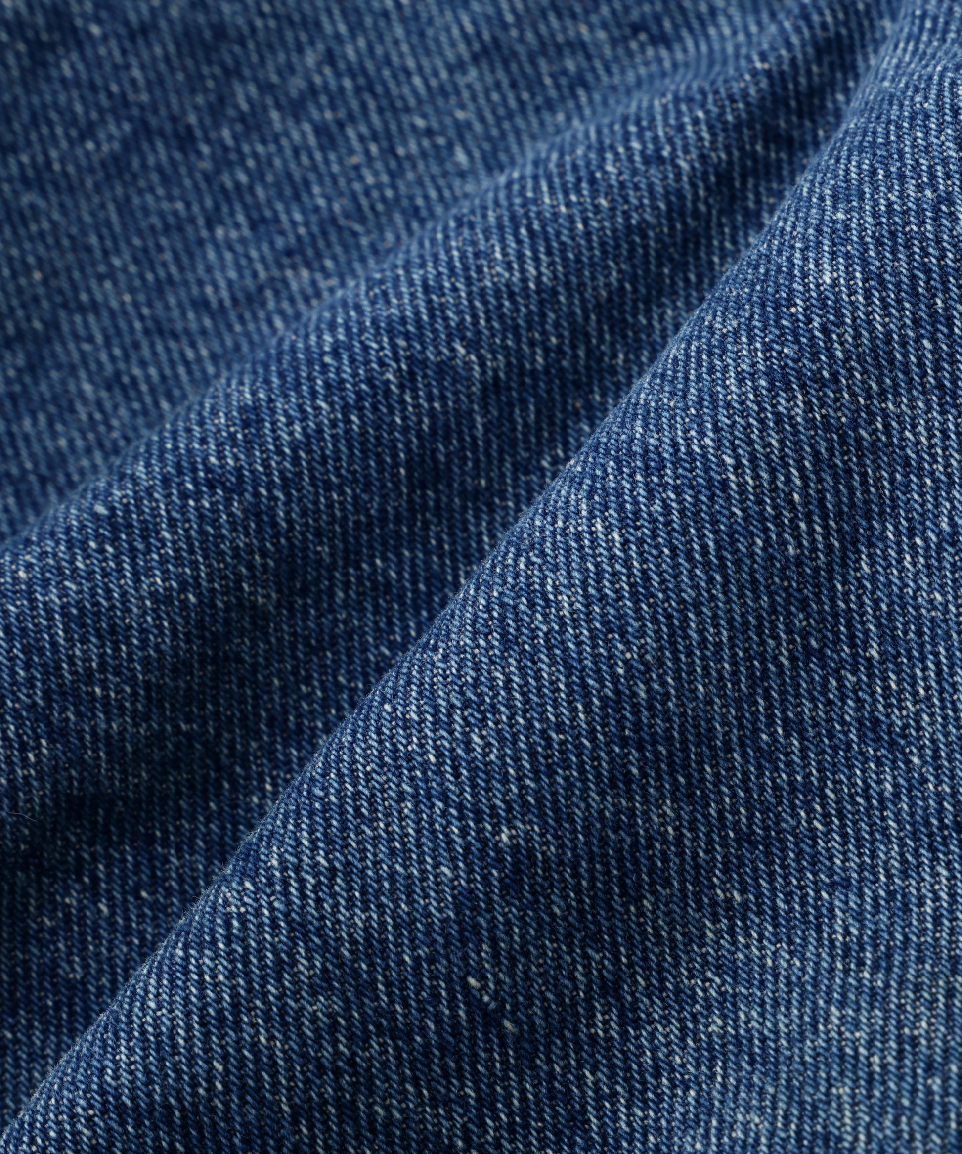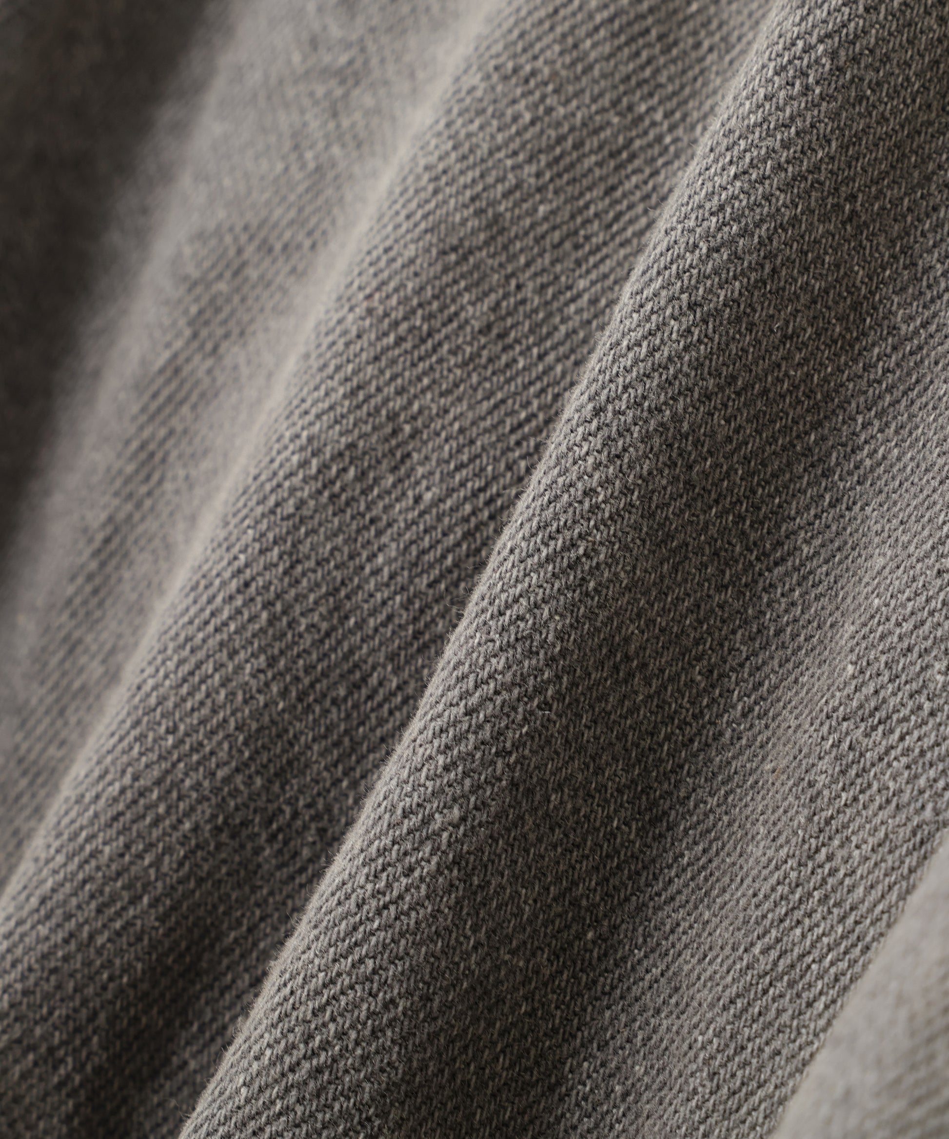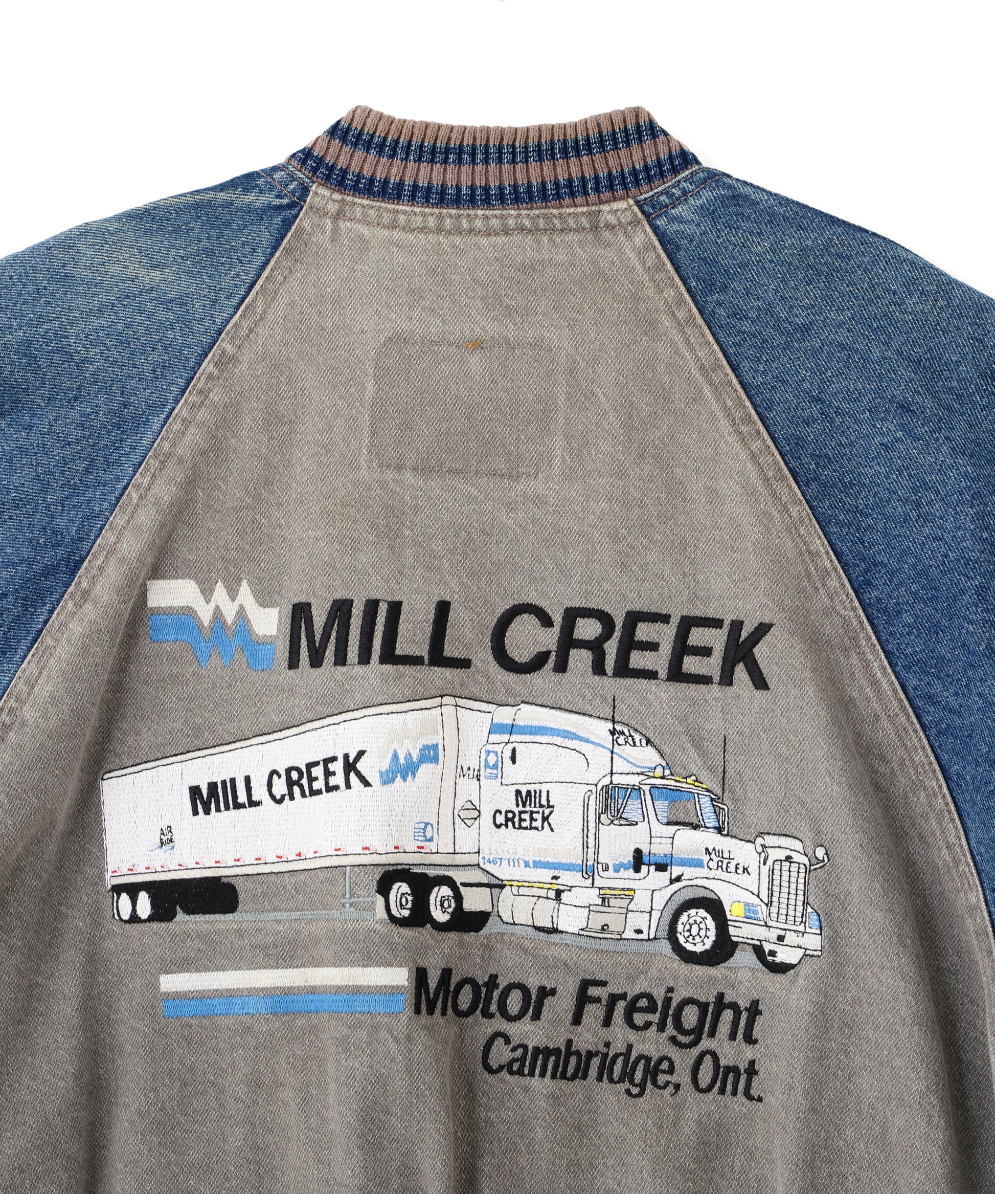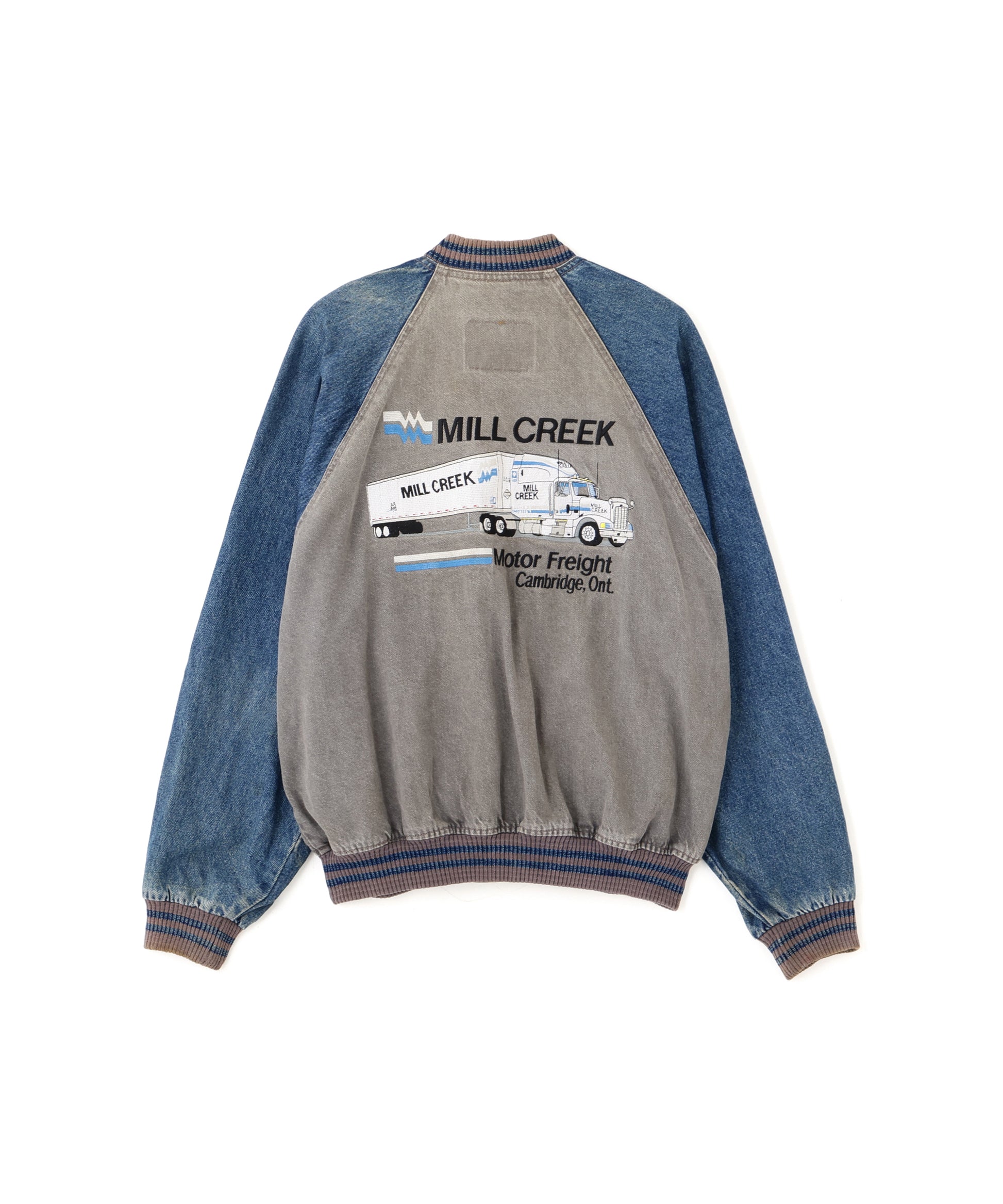 身頃はフェードしたグレー、袖は色落ちしたデニム生地を使用し、経年変化による自然な風合いが雰囲気抜群。リブ部分もストライプ仕様で、クラシックなスタジアムジャケットのディテールをしっかり踏襲している。