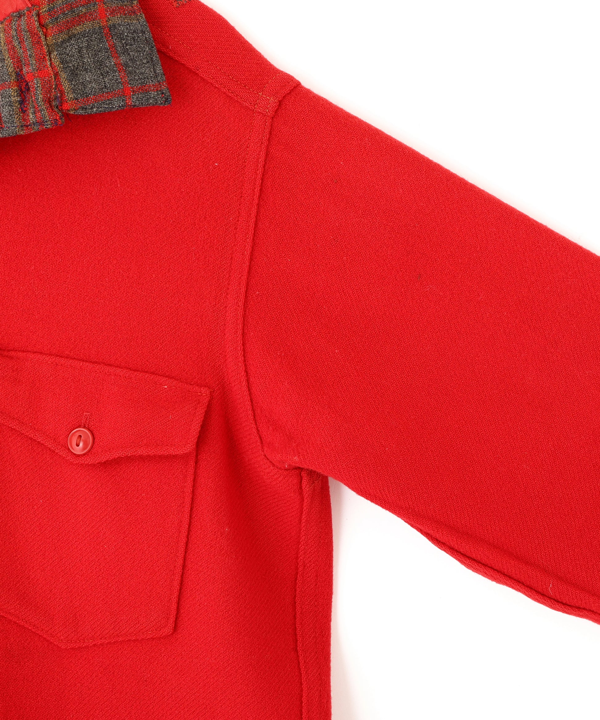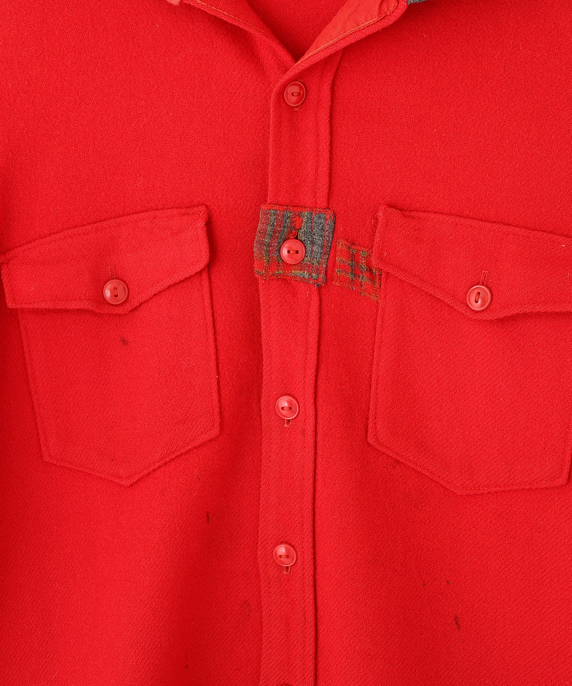 鮮やかなレッドカラーが目を惹く、Woolrichのウールシャツジャケット。 しっかりと厚みのある生地感で、シャツとしてはもちろんライトアウター感覚でも着用できる一着。襟元と前立て部分にはチェック柄の切替が入り、さりげないアクセントに。 *コンディション:前身頃、左袖、襟部分に汚れあり