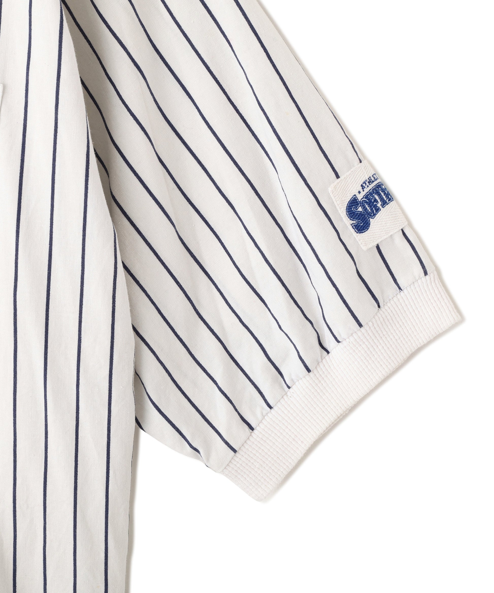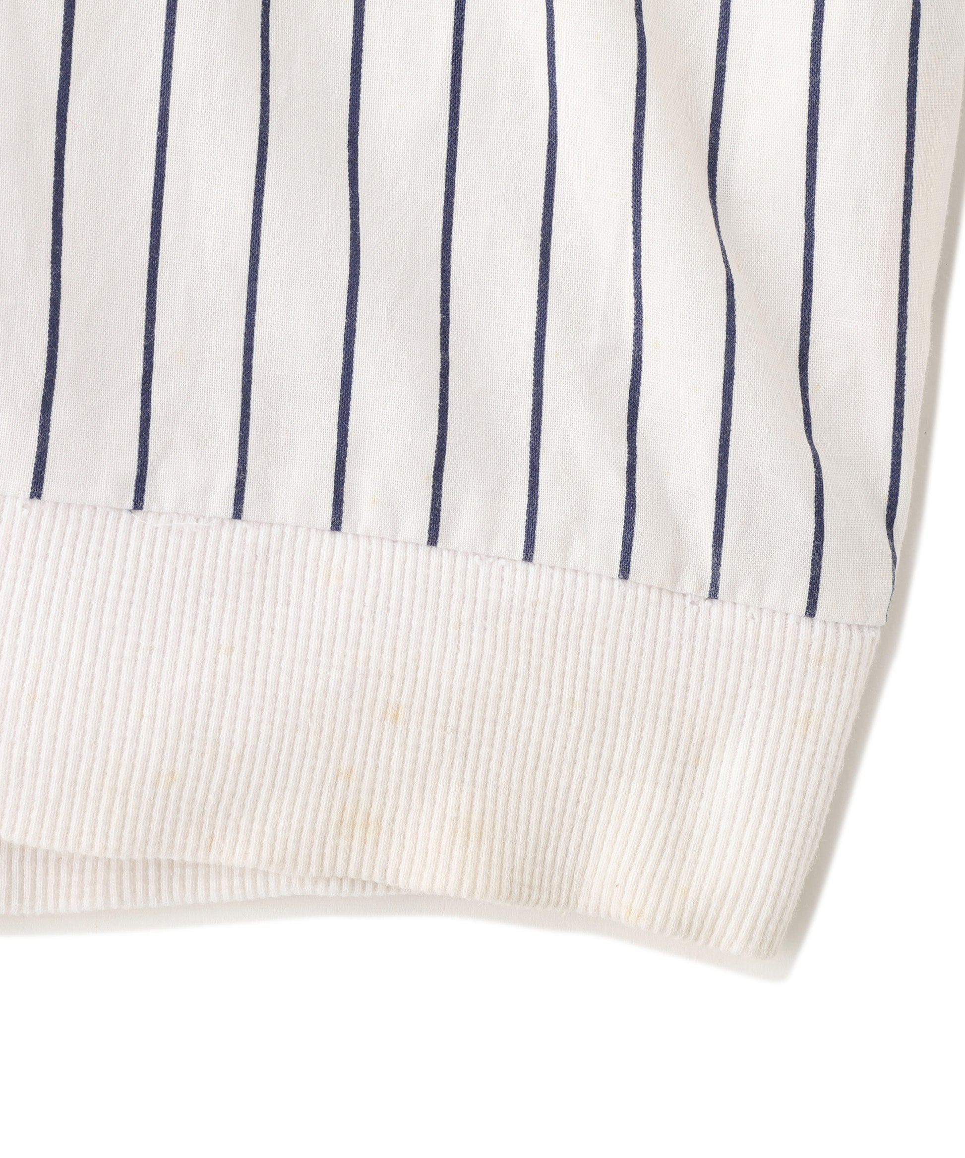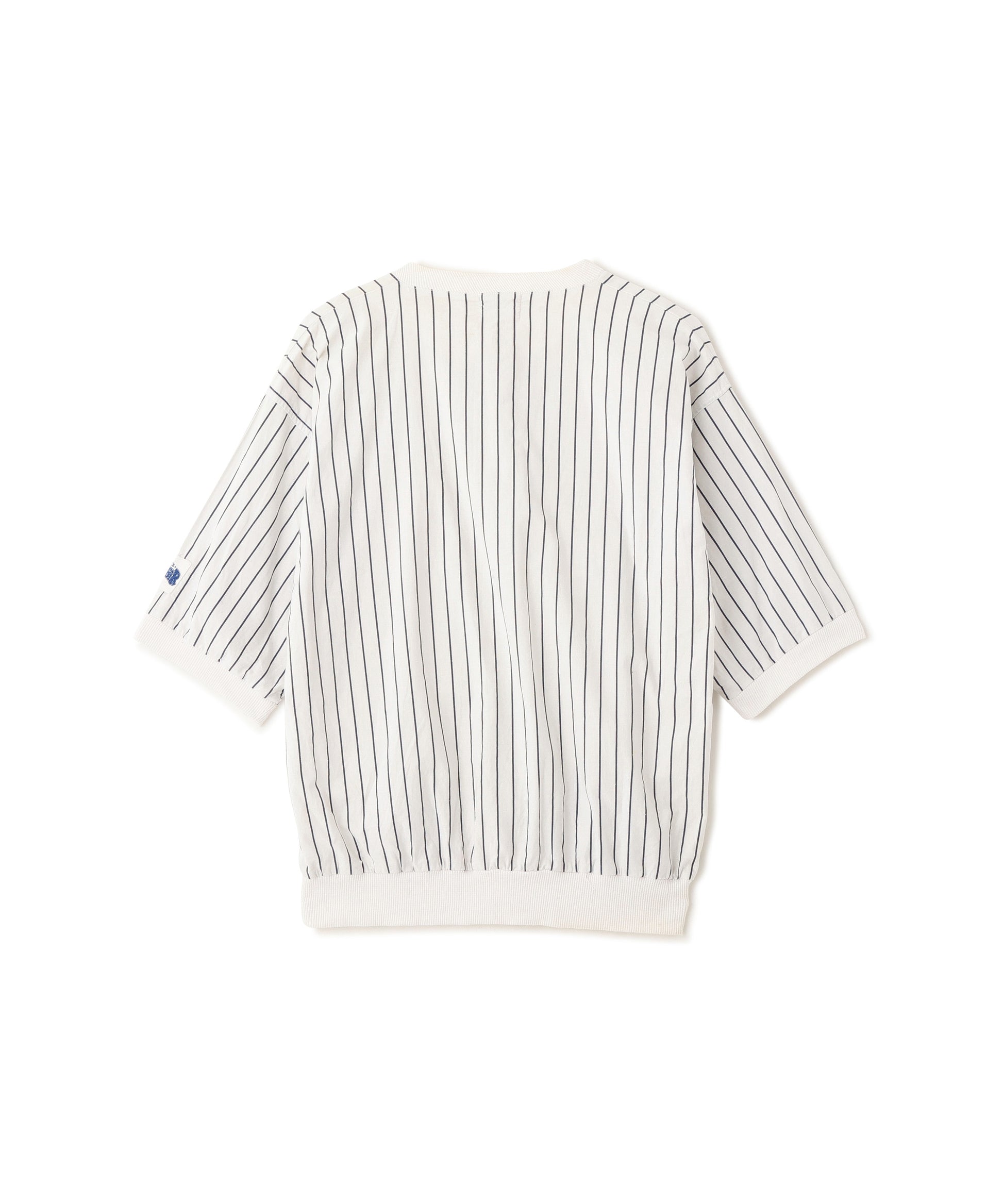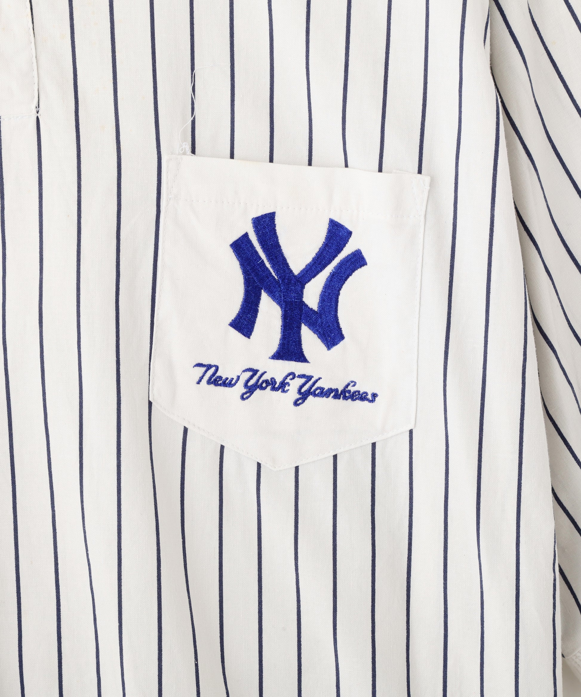 ニューヨーク・ヤンキースのロゴ刺繍がワンポイントで入った、ピンストライプ柄のヘンリーネック半袖トップス。ホワイトベースにネイビーの縦ストライプが映える、爽やかでスポーティーな雰囲気の一着。