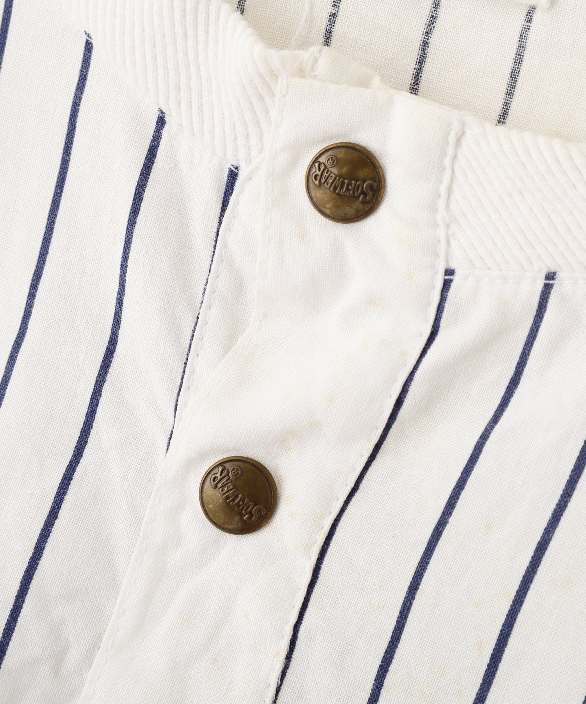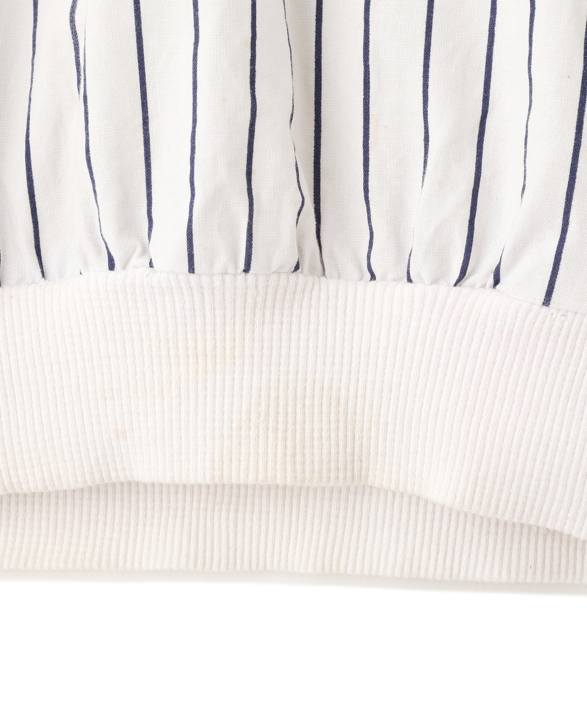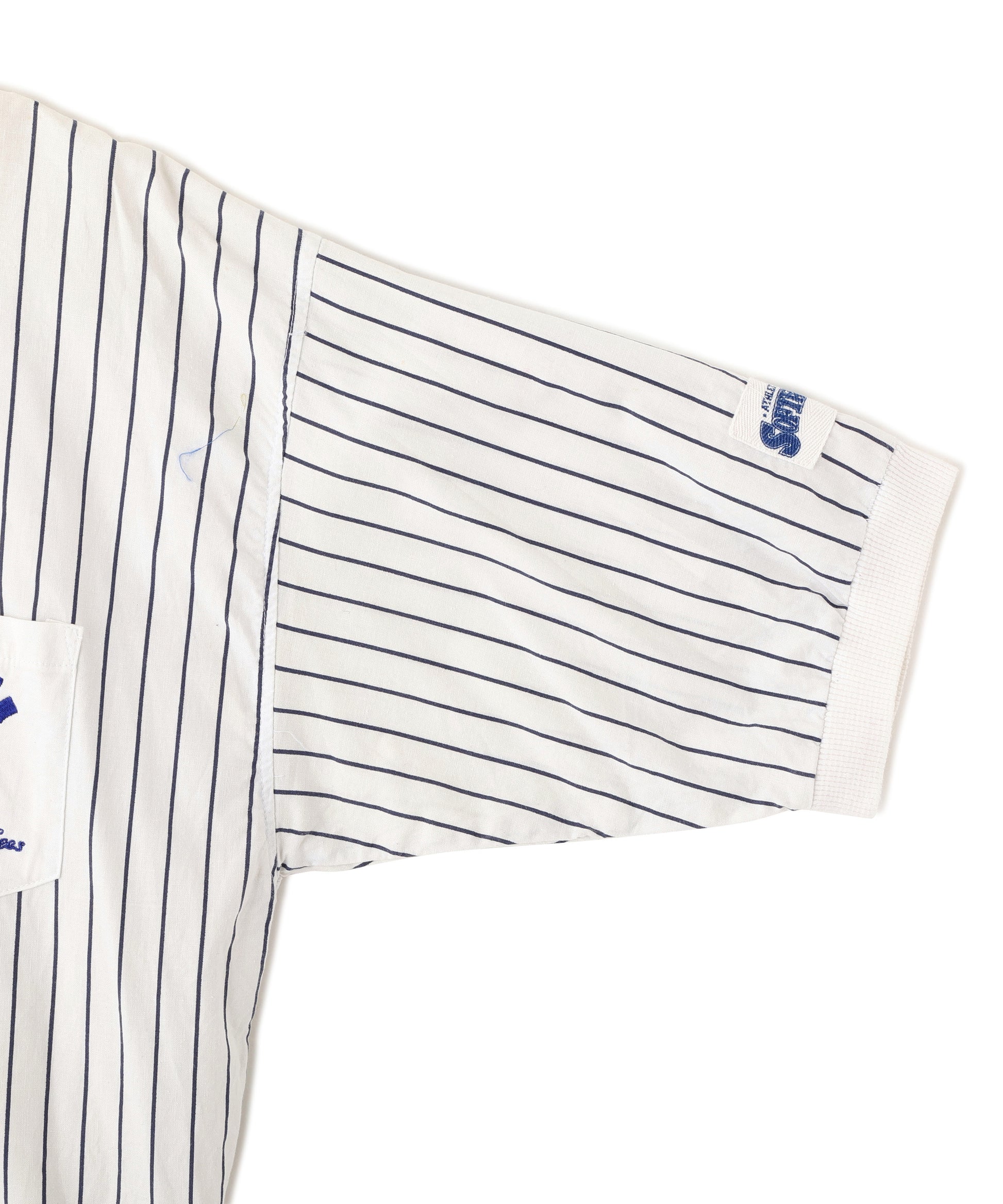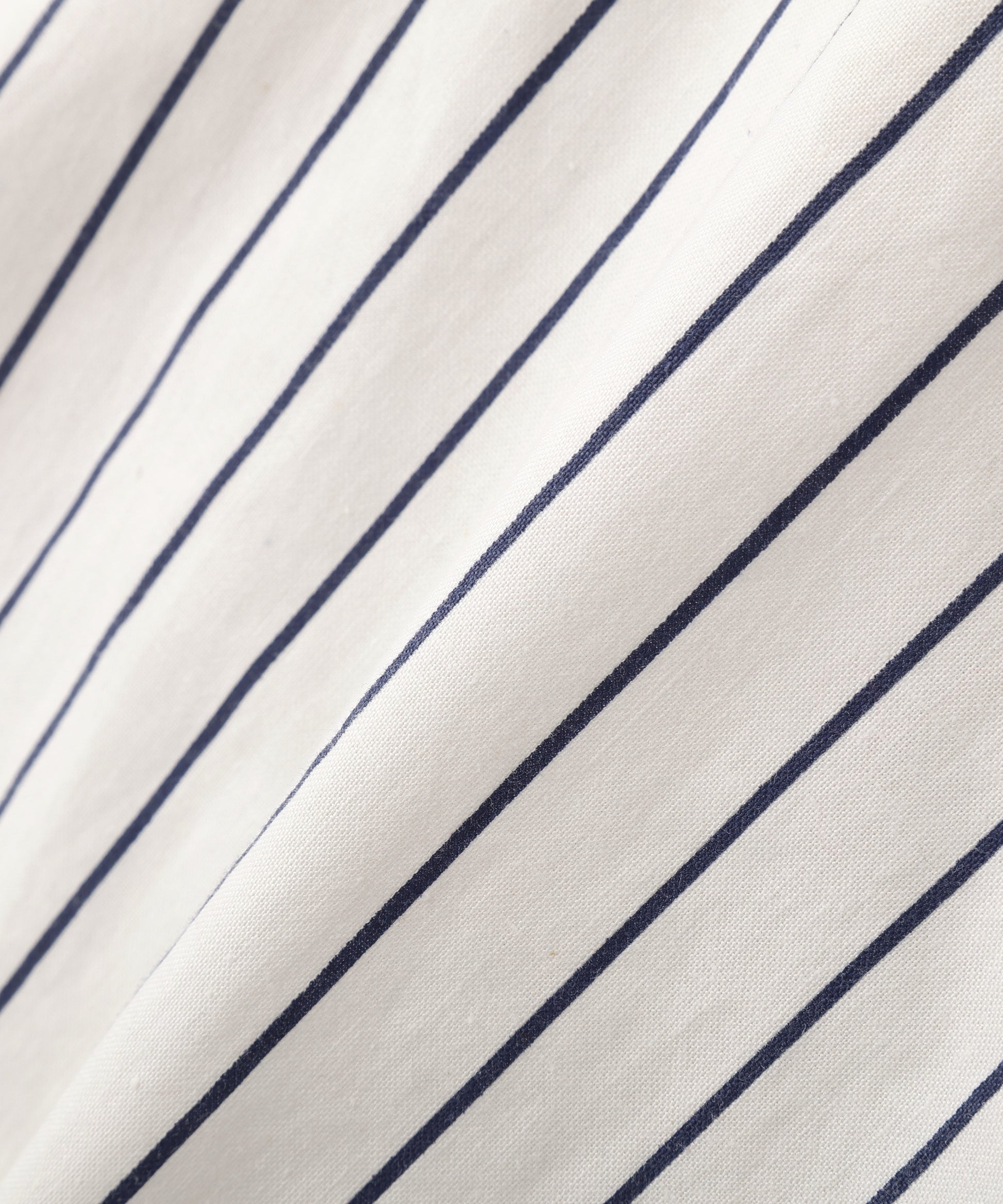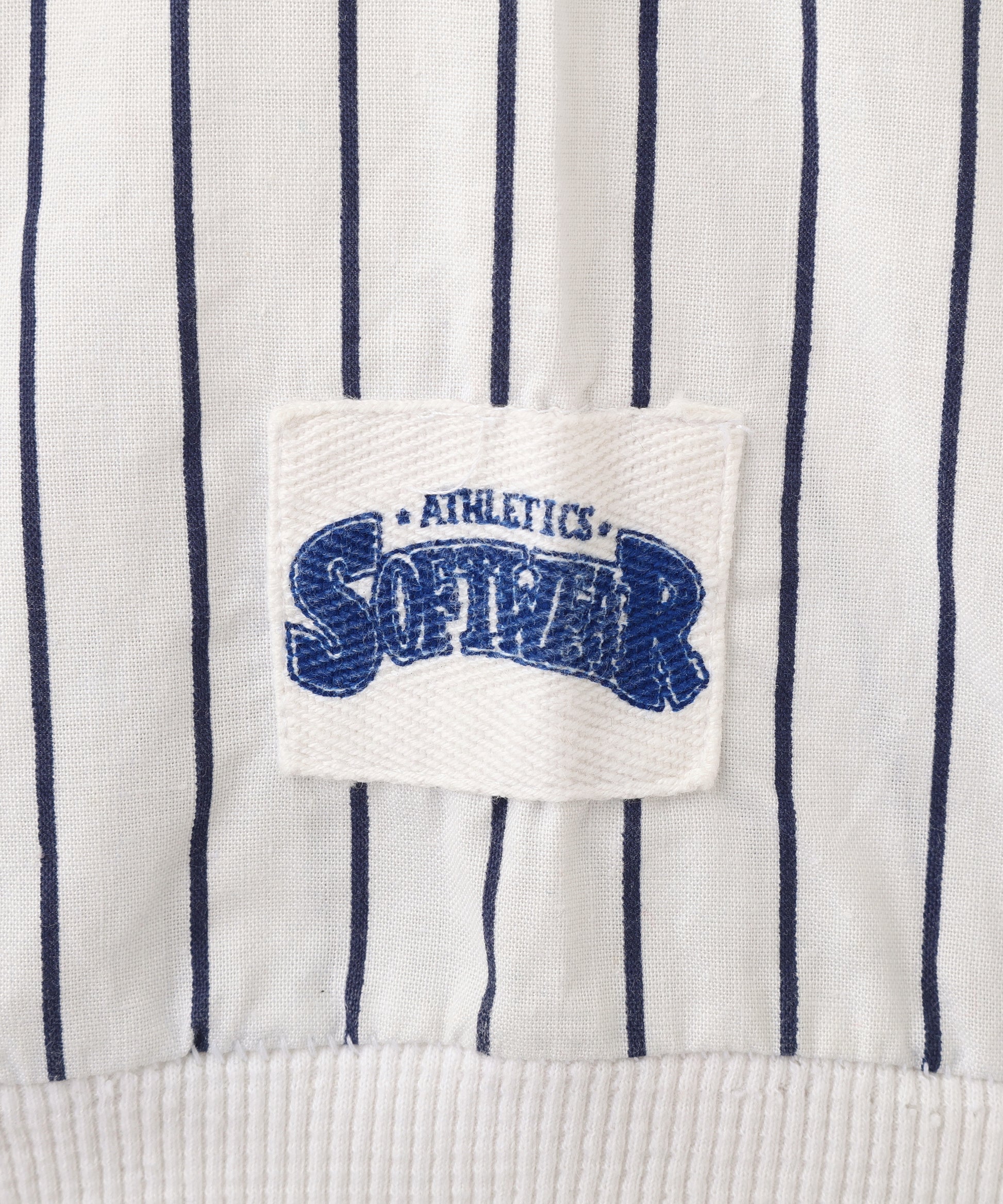 ニューヨーク・ヤンキースのロゴ刺繍がワンポイントで入った、ピンストライプ柄のヘンリーネック半袖トップス。ホワイトベースにネイビーの縦ストライプが映える、爽やかでスポーティーな雰囲気の一着。