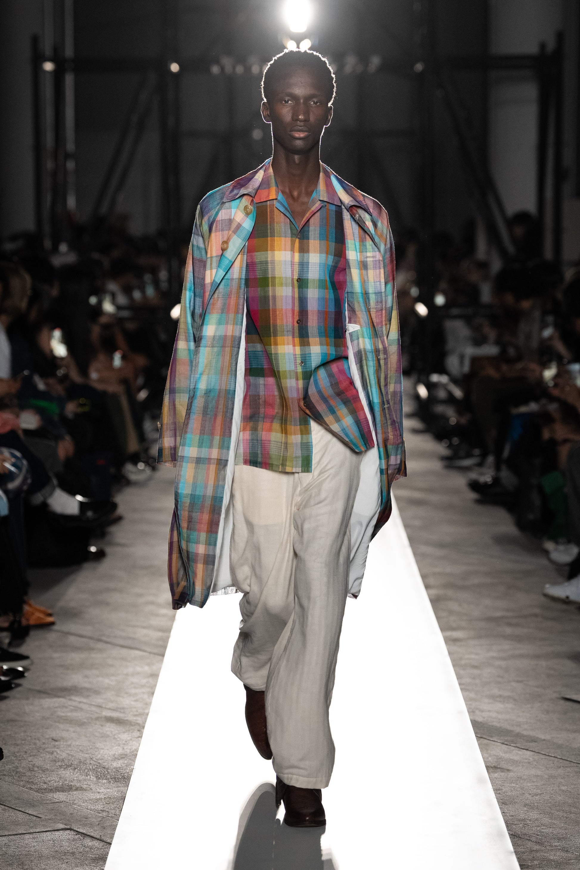 コレクションのインスピレーションを得るべく、デザイナー川上が訪れたインドで偶然見つけた多色使いのマドラスチェック。不規則で多彩な柄の秘密は、工場にあった残糸を用いていること。残った糸を集めてランダムに織られることで新しいマドラスチェックが完成しています。生地は薄く適度なハリがあり、繊細で軽やか。体と衣服の間に1枚空気を纏うような感覚で着こなしたい、春のマドラスです。