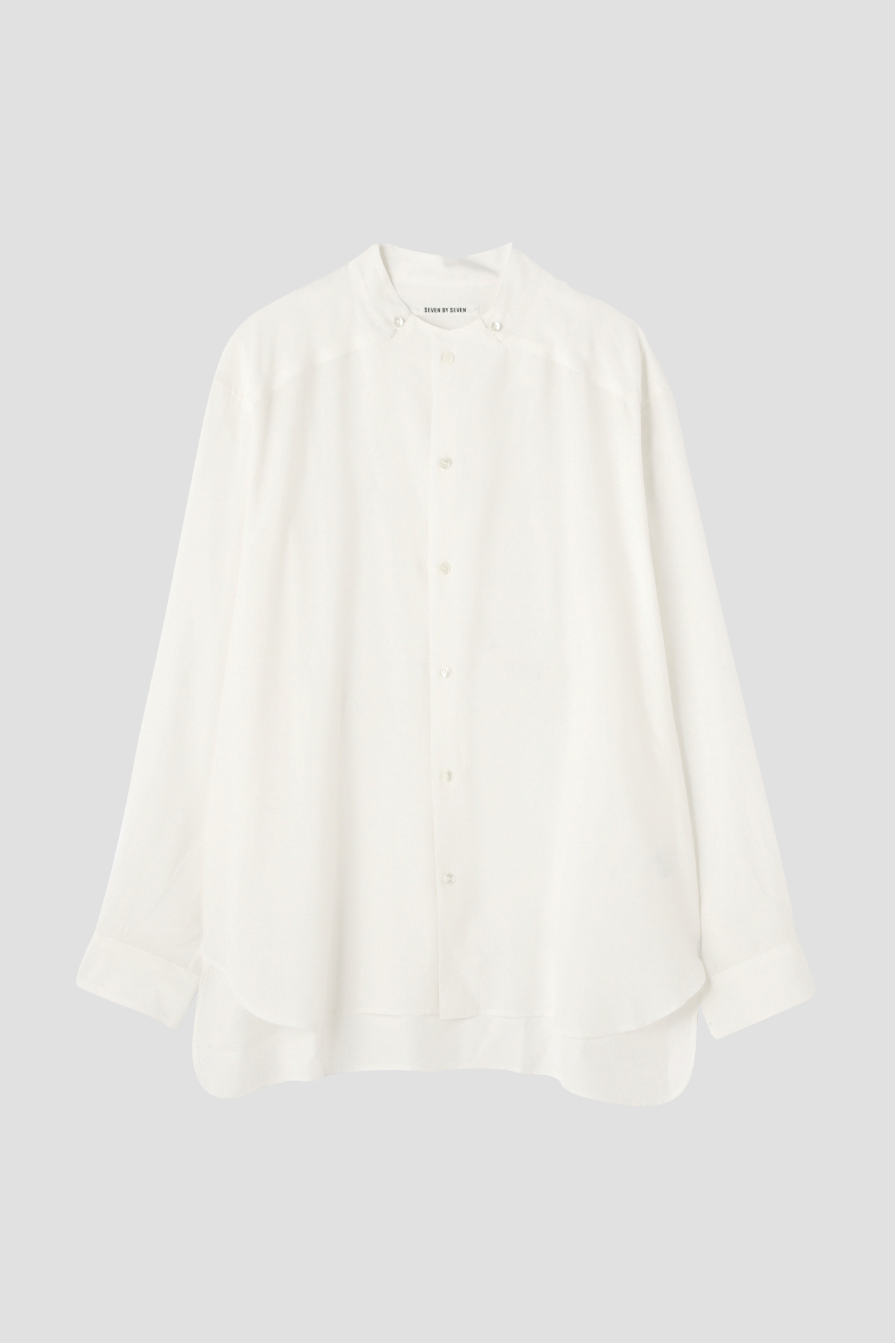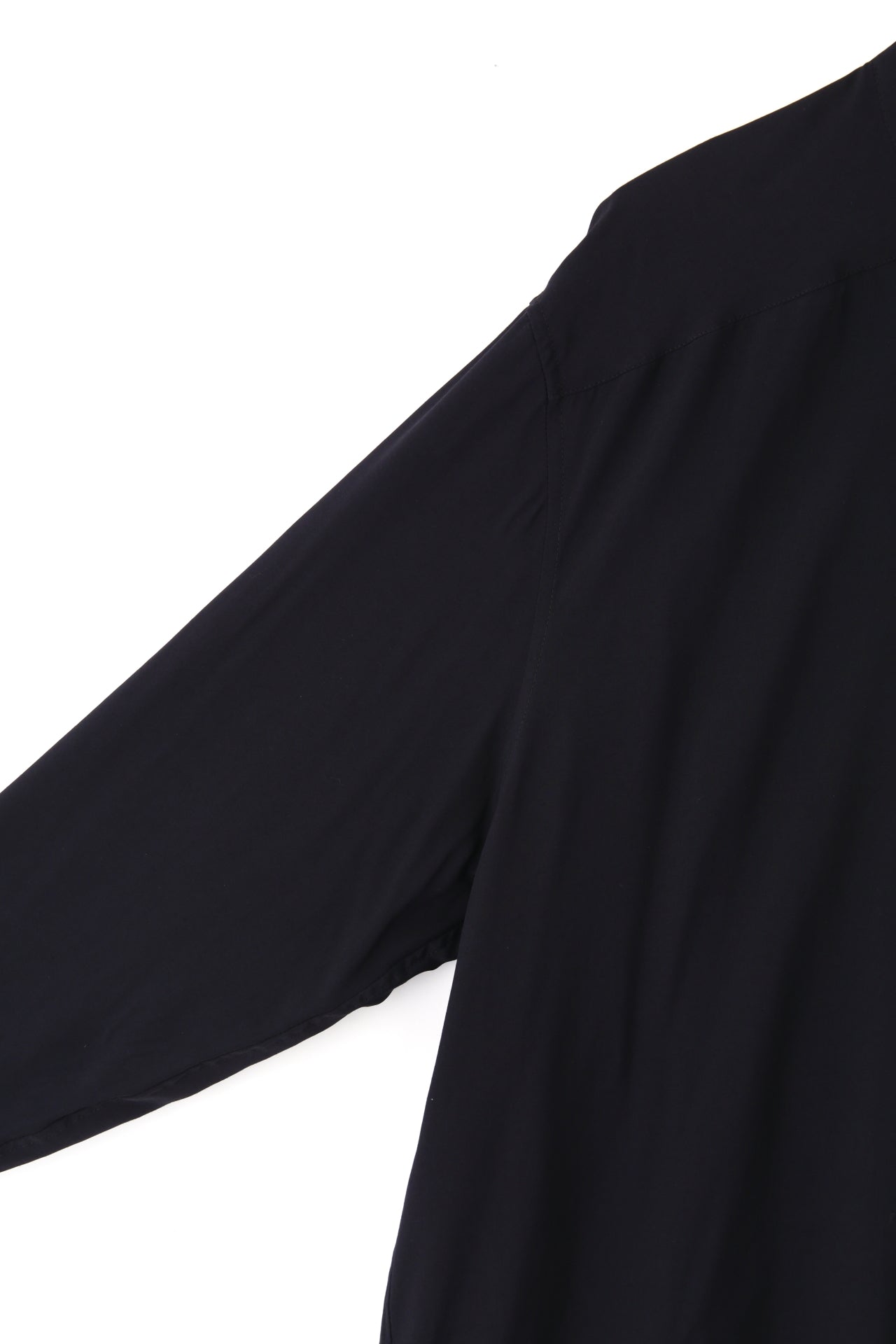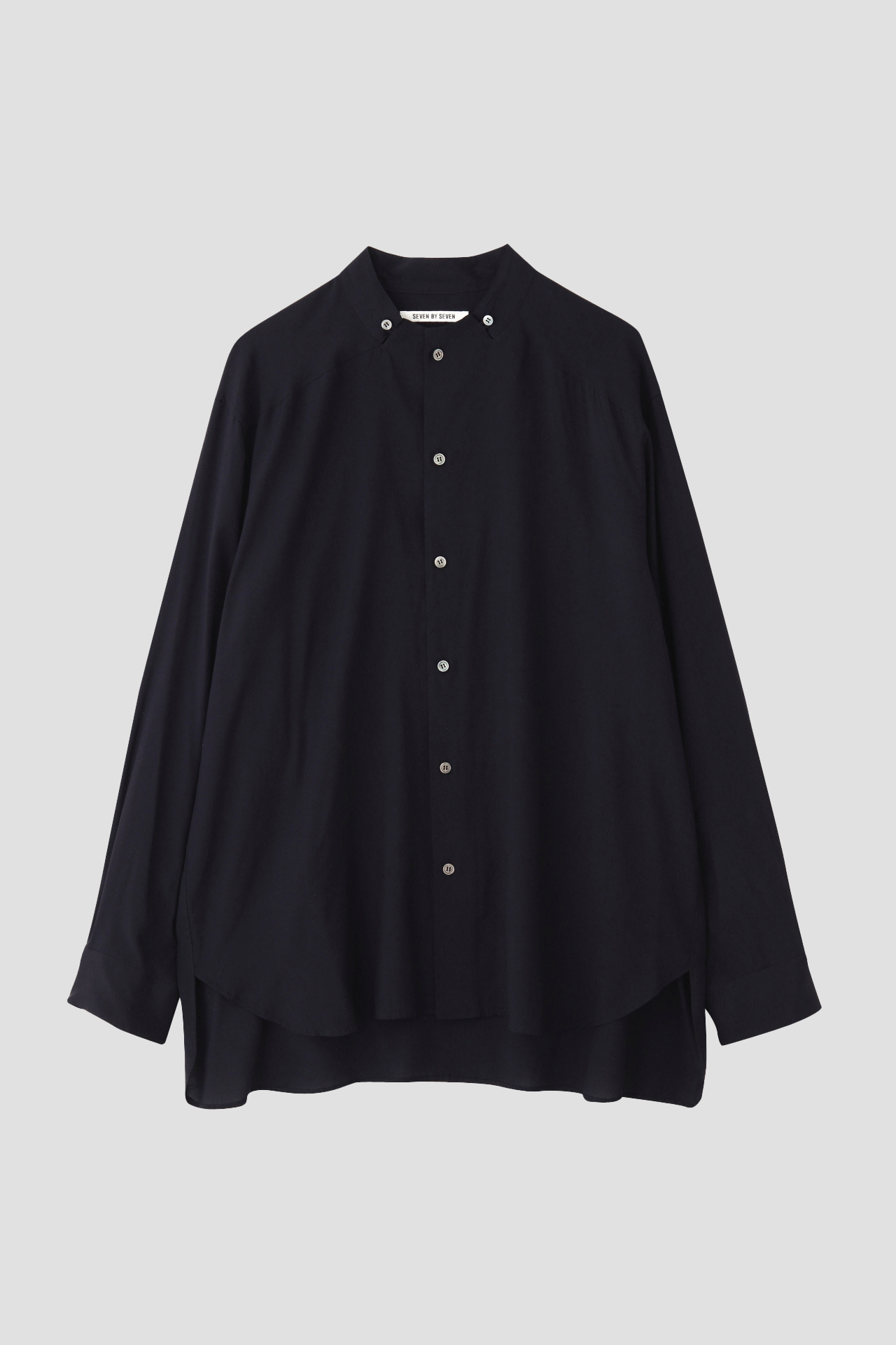 レーヨンシルクツイルはプラット・エアーイン加工で染めています。エアーインとは下晒の段階で糸を揉み解し芯から解すことでソフト感、膨らみ感が強調される加工です。襟元はCOOKシャツのデザインをモチーフにスッキリ仕上げました。ただのスタンドカラーでないSEVEN BY SEVENらしいデザインになっています。