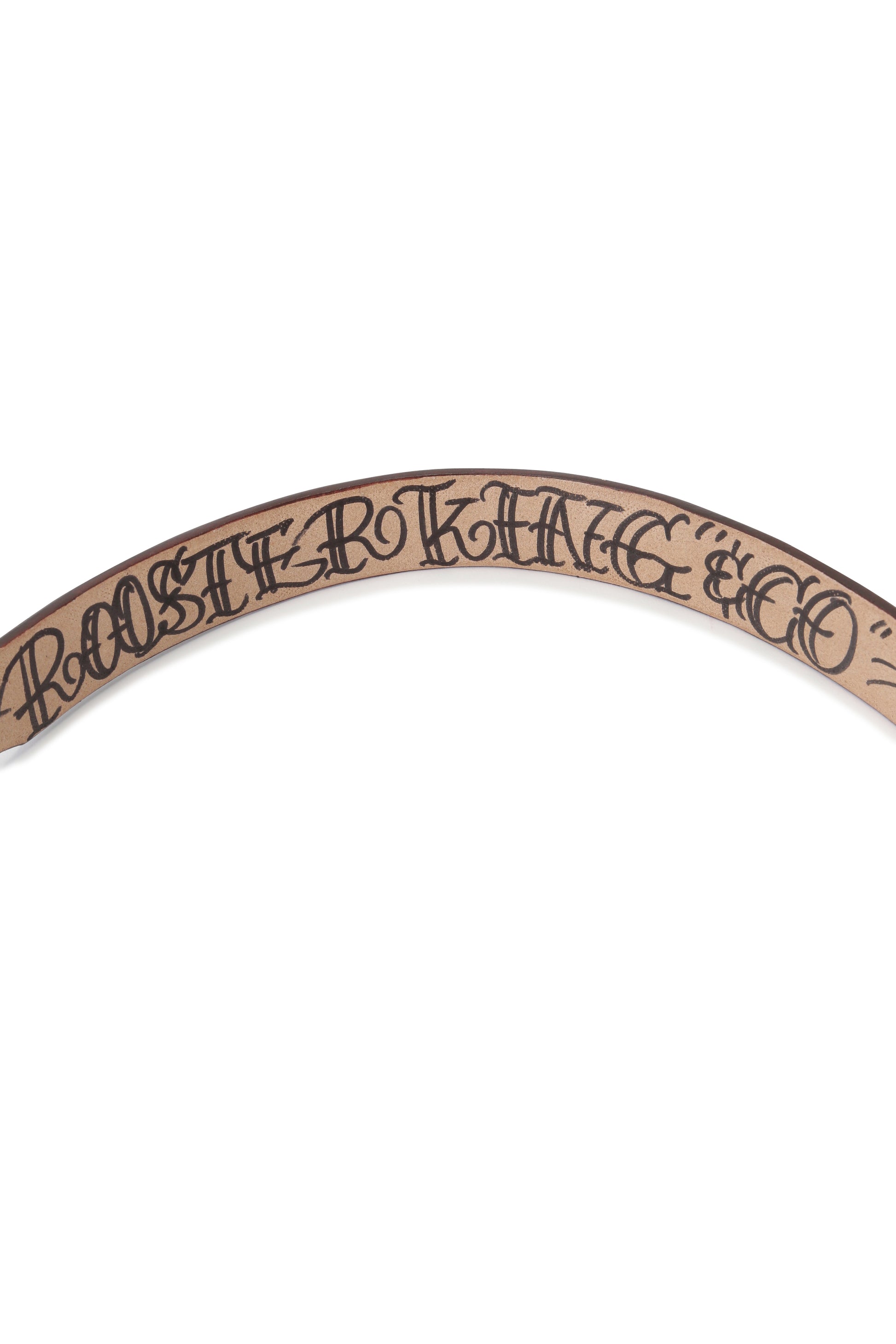 デザイナーの松﨑氏が得意とするカービングの雰囲気を特殊なスタンプで再現したレザーは、松﨑氏だからこそ入手することの出来るルートで仕入れた存在感のあるパーツと相まって、特別な存在感を醸し出しています。また、ベルト裏には松﨑氏の手描きによる両ブランドのネームとサインが描かれている すべてが一点モノの仕様となっています。長年のアメリカ生活と、様々な経験を糧に全ての工程を手作業で行うRooster King & Co.,だからこそ創り出せる存在感が力強い特徴的なFLOWER 柄のウェスタンベルトです。