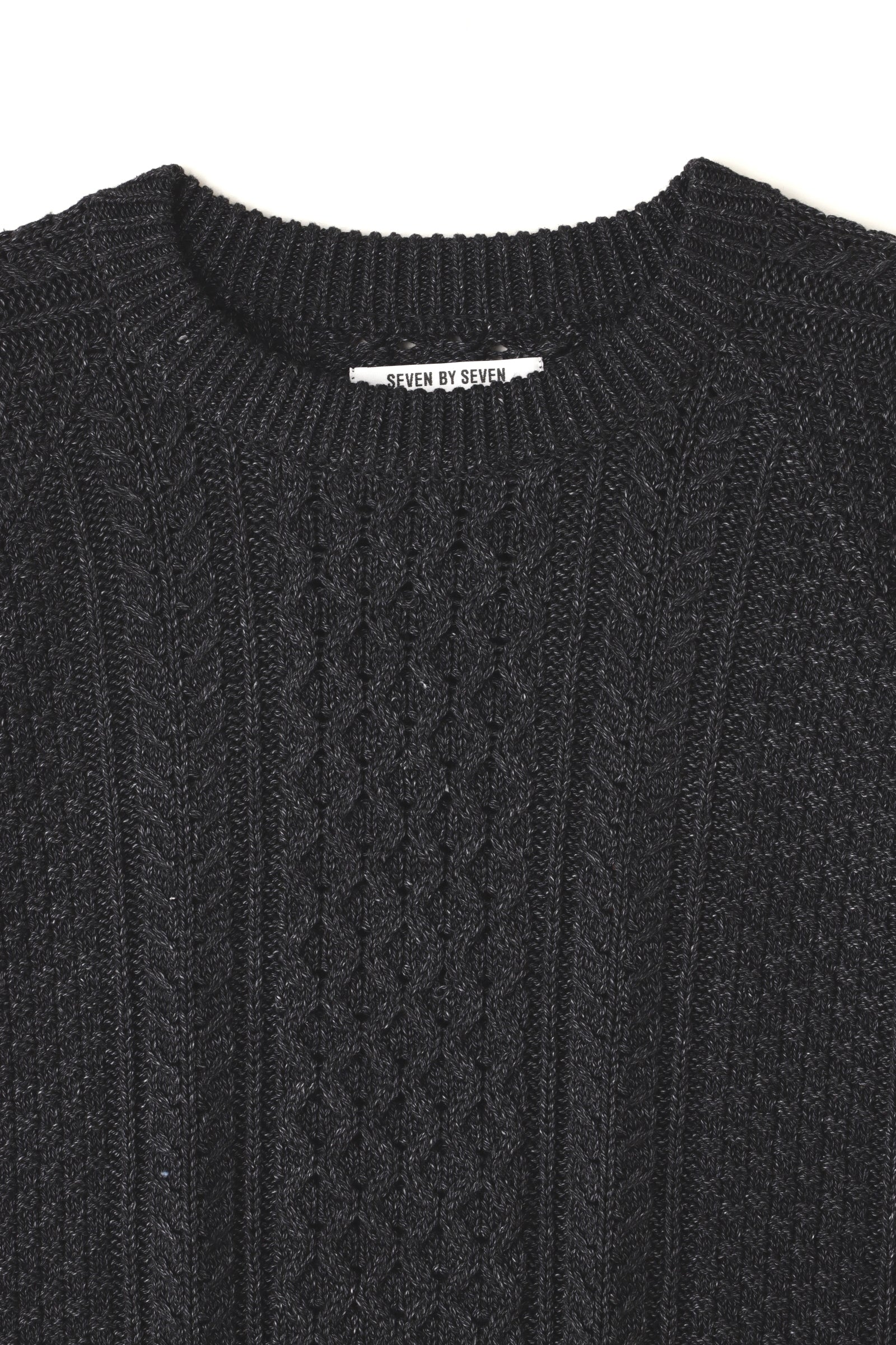 通常、インディゴカラーのニットは、プロダクトが完成したのちに染色を施して作製することがすることがほとんどです。それは、移染しやすいインディゴの特性上、ニットを編みたてる機械への色移りが起きやすいため、専用の機械が無ければ作製出来ないといった背景があるからです。しかしながら、今回Seven By Sevenでは、日本で数少ないインディゴ糸を使用してニットを編みたてる職人と出会い、インディゴ糸で編みたてたニットを作製しました。1本1本の糸が中白のインディゴカラーで染まっているため、デニムのように特徴的なアタリが生まれる仕上がりとなりました。また、コットン素材の為インディゴ特有の経年変化も楽しめる仕上がりとなっています。ケーブル編みで作製することで、凹凸感によるアタリの出かたも楽しめる仕様となっています。ケーブル編みのクルーネックニットをブランドらしいアレンジで演出した長年付き合っていけるインディゴニットです。