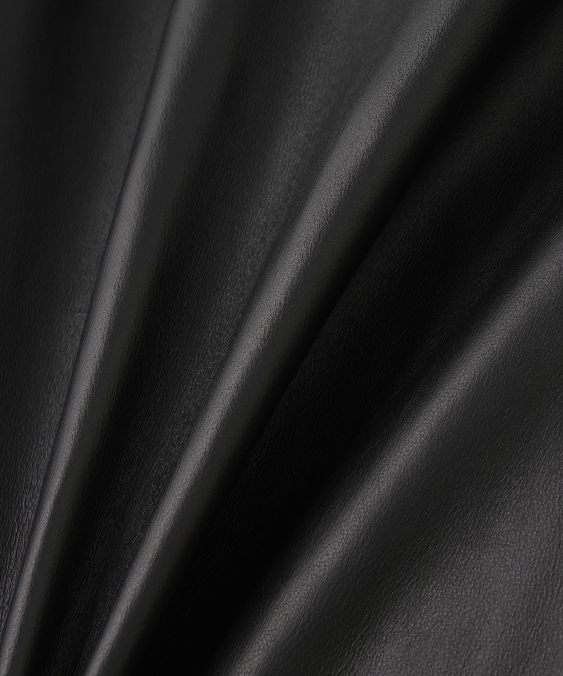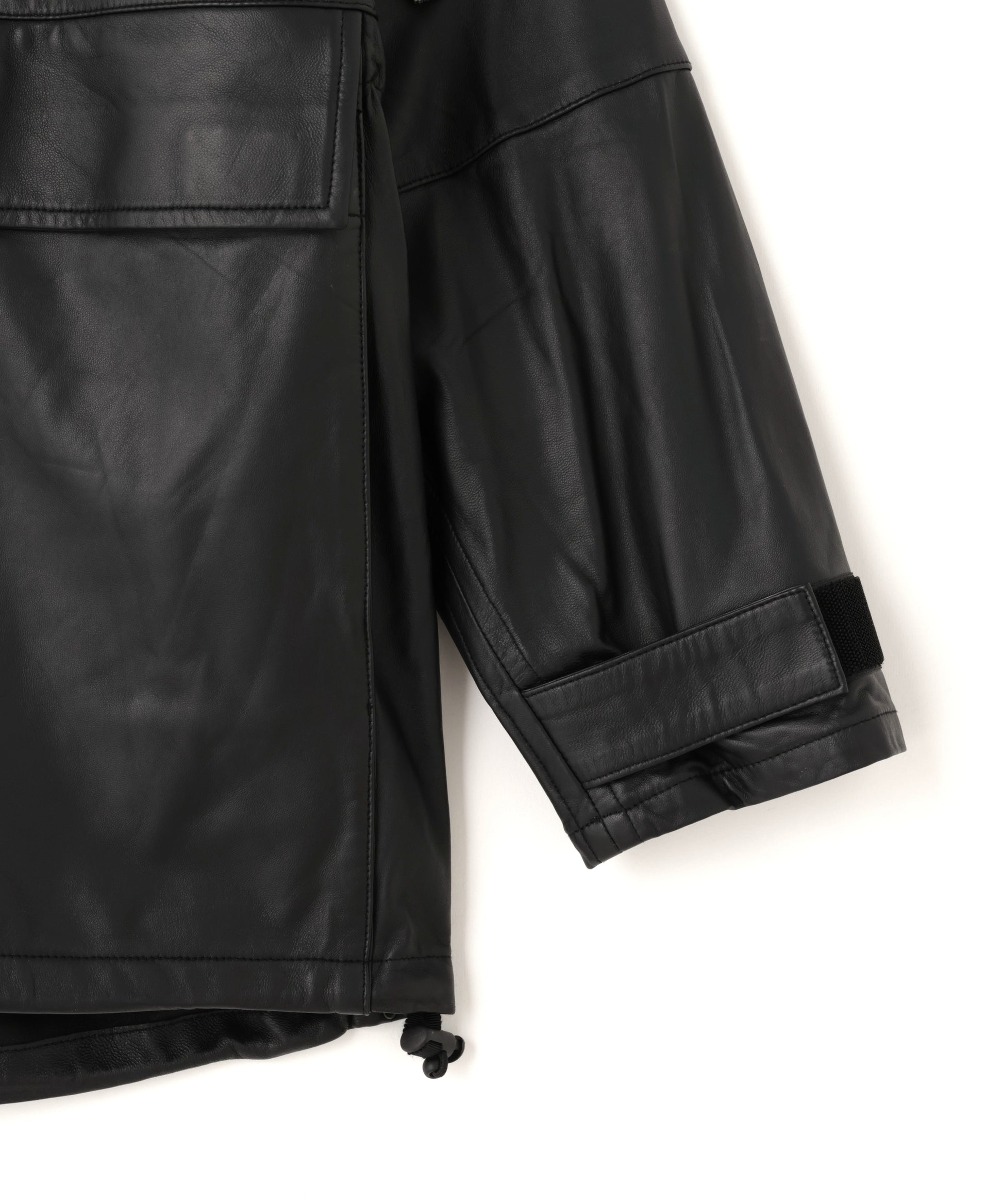 可能な限り革を薄く漉くことで、レザーながらも独特なハリ感と柔らかさが共存した仕上がりとなりました。敢えて、一枚仕立てで作製することで裏面が見える仕様に仕上げており、裏側から見える革の切り替え部分には、止水テープを模したレザーテープを叩きつけるなど、オリジナルに対して最大限のリスペクトを込めたデザインに仕上げています。本来、米軍が必要としていたGore-Texの機能には到底及ばないながらも、ファッション性に特化した ブランドらしいアプローチの遊び心が感じられる”ナイロン風”レザーパーカーです。