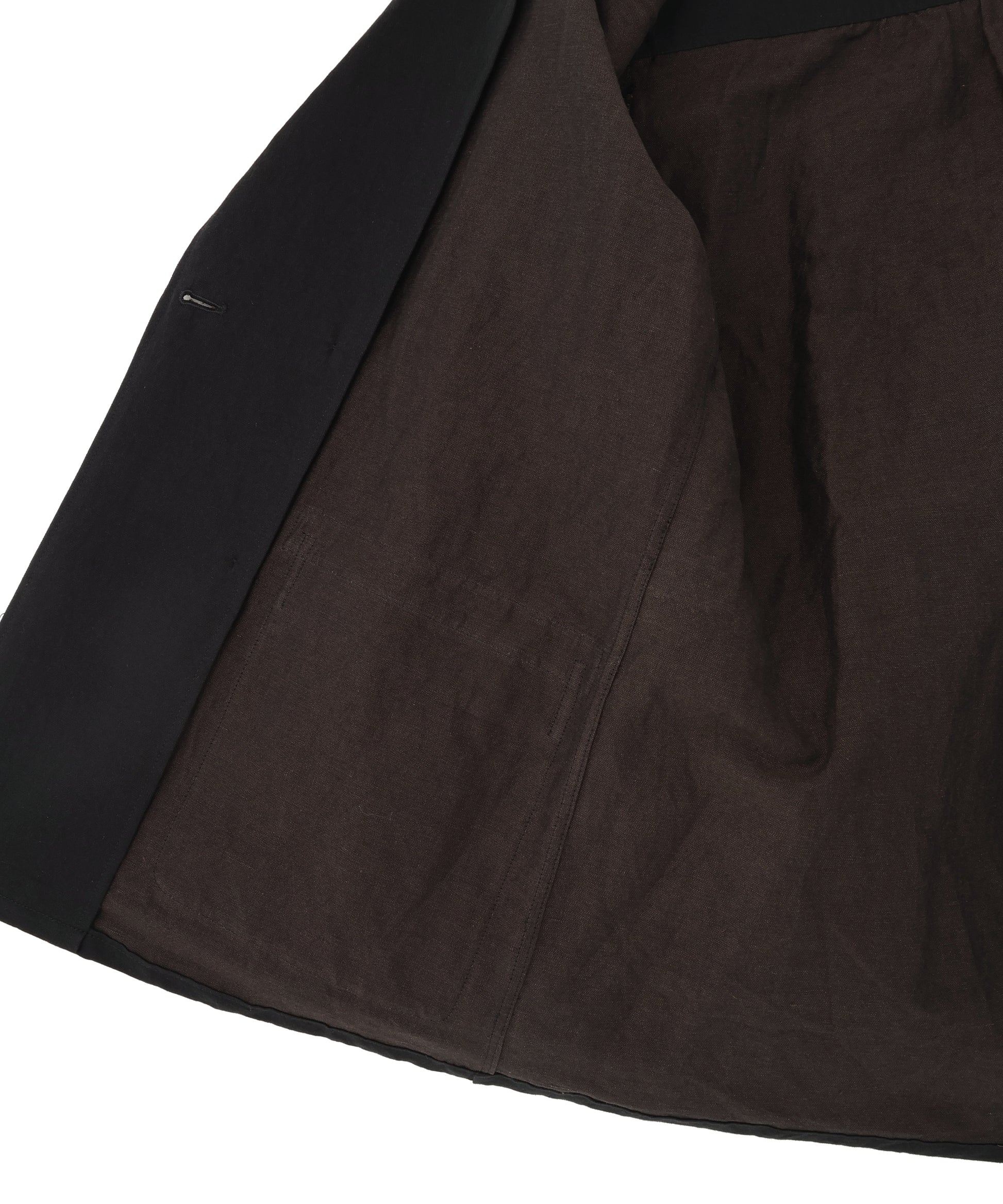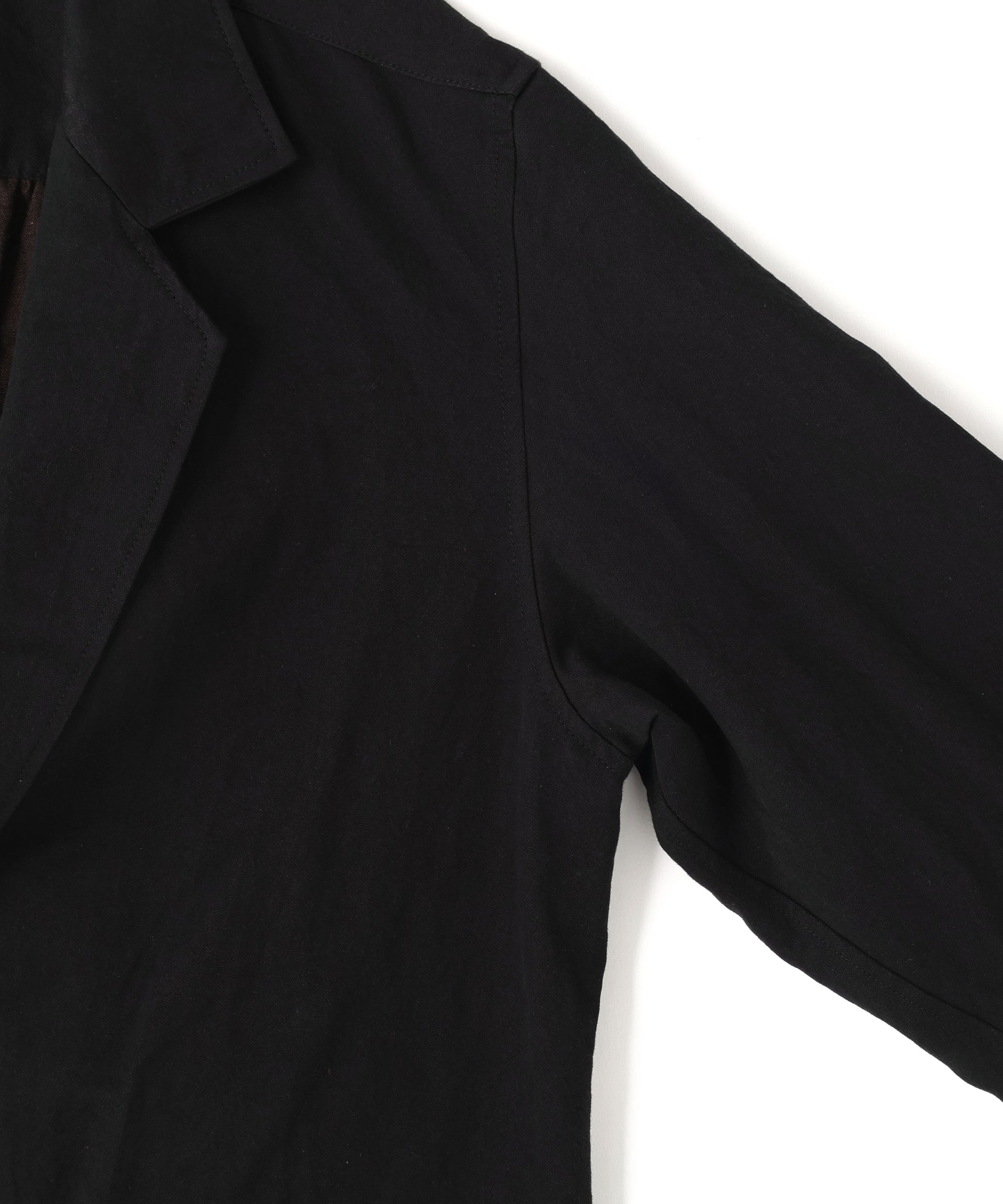 経糸・緯糸共に特殊な染色技法を施し、繊維の奥深くまで染めることで、色の深さが際立ち、上質なリネン素材と掛け合わさることで、特徴的な光沢感も感じられる仕上がりとなりました。ダブルブレストのデザインに繊細さと風合いを感じられる素材が合わさることで、カジュアルな要素の中にも、品の良さも感じるアイテムとなっています。また、1枚仕立てで作製することで、カバーオールのような感覚で、ラフに羽織れるのもポイントの一つです。丁度良い塩梅の中間着として、様々な場面で活躍するシャツジャケットです。