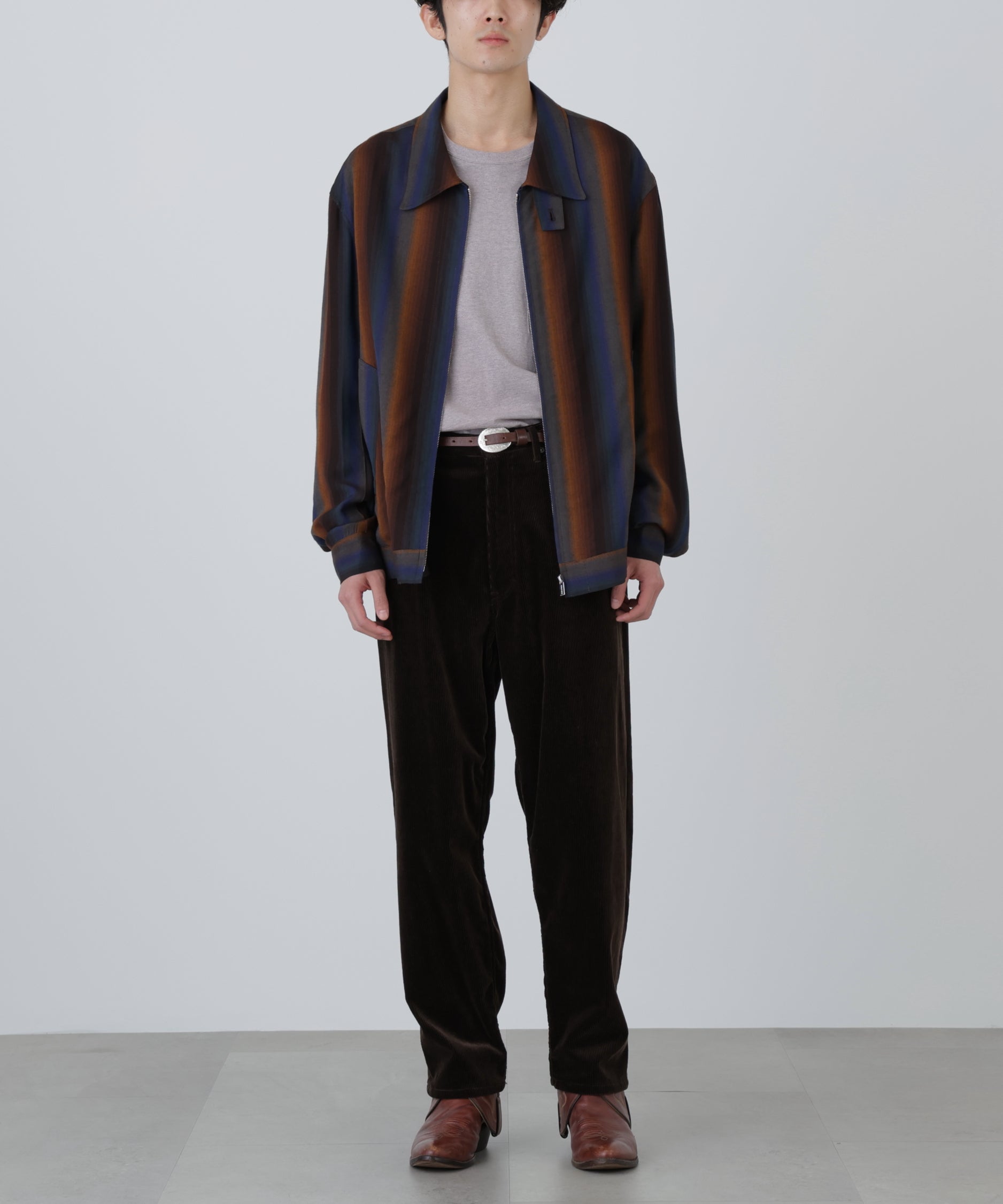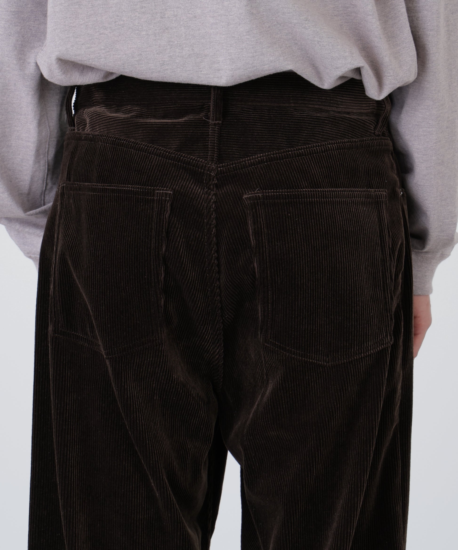 ウェストサイズは、グッと絞って履くことを想定して大きめのサイズに仕上げています。また、只の大きめサイズのパンツとならないよう、拘ったシルエットによって生まれる腰周りから裾にかけてのバランスは秀逸で、野暮ったさの中に美しさが垣間見える仕上がりとなっています。モダール混の光沢と柔らかさのあるコーデュロイ生地は型が持つ余白感、素材の柔らかさと光沢感が相まって、ワークウェアのタフさがありながらも上品さも兼ね備えた仕上がりの品あるワイドパンツです。