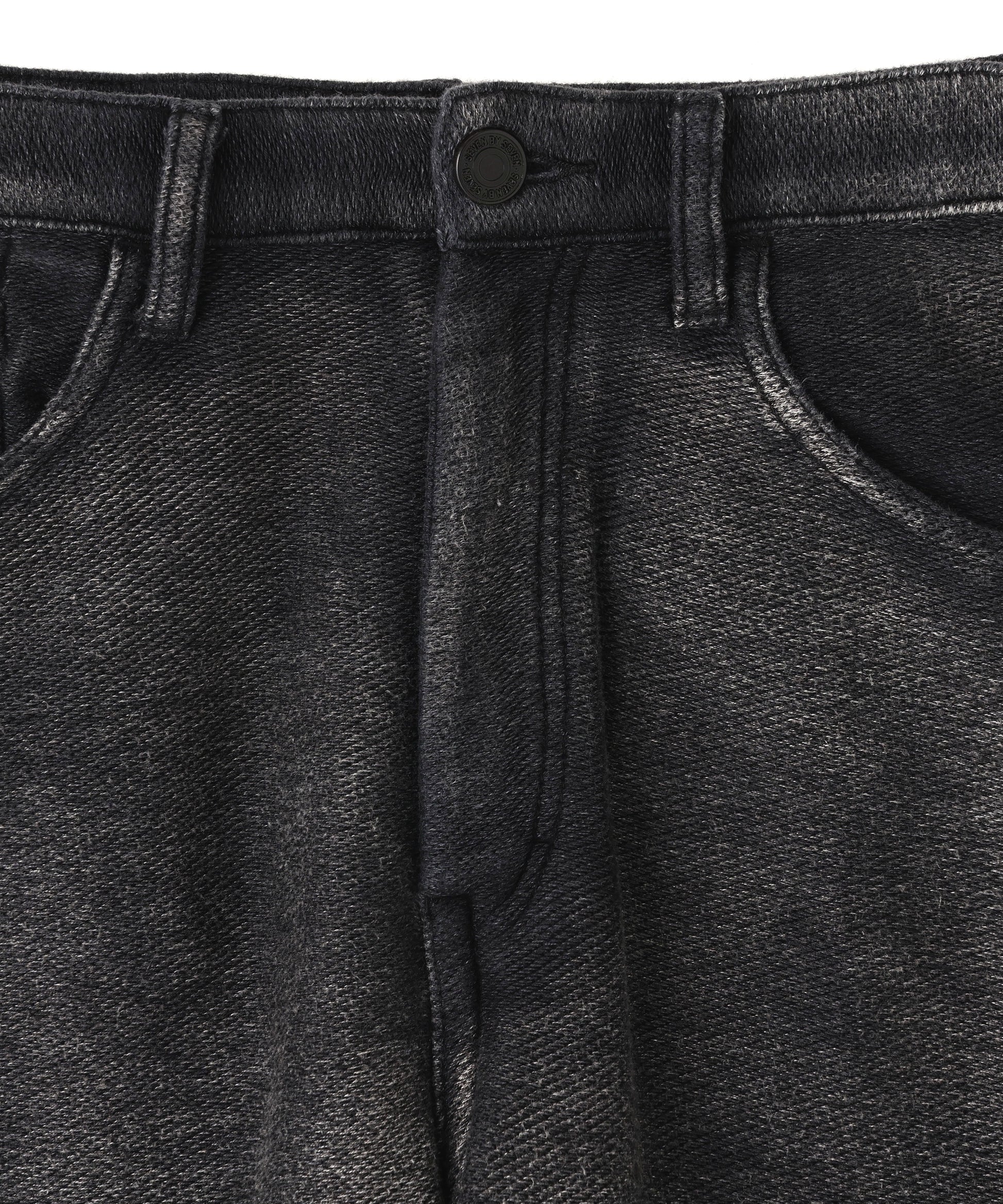 通常、インディゴカラーのニットは、プロダクトが完成したのちに染色を施して作製することがすることがほとんどです。それは、移染しやすいインディゴの特性上、ニットを編みたてる機械への色移りが起きやすいため、専用の機械が無ければ作製出来ないといった背景があるからです。しかしながら、Seven By Sevenでは、日本で数少ないインディゴ糸を使用してニットを編みたてる職人と出会い、インディゴ糸で編みたてたニットを作製しました。1本1本の糸が中白のインディゴカラーで染まっているため、デニムのように特徴的なアタリが生まれる仕上がりとなりました。また、コットン素材の為インディゴ特有の経年変化も楽しめる仕上がりとなっています。デニムの表情をニットで再現するために、編地も綾目に作製したのも特徴の一つです。一見するとデニムアイテムのような印象ですが、ニットで作製したことで不思議な柔らかさが生まれました。また、デニムジャケット感の再現性を高めるために、タック釦(ジーンズなどの金属製の釦)を再現した水牛ボタンを取り付ける拘りぶりも、ブランドらしいアプローチの一つとなりました。加工によるアタリ具合と経年変化も楽しめるジーンズ風のインディゴニットパンツです。