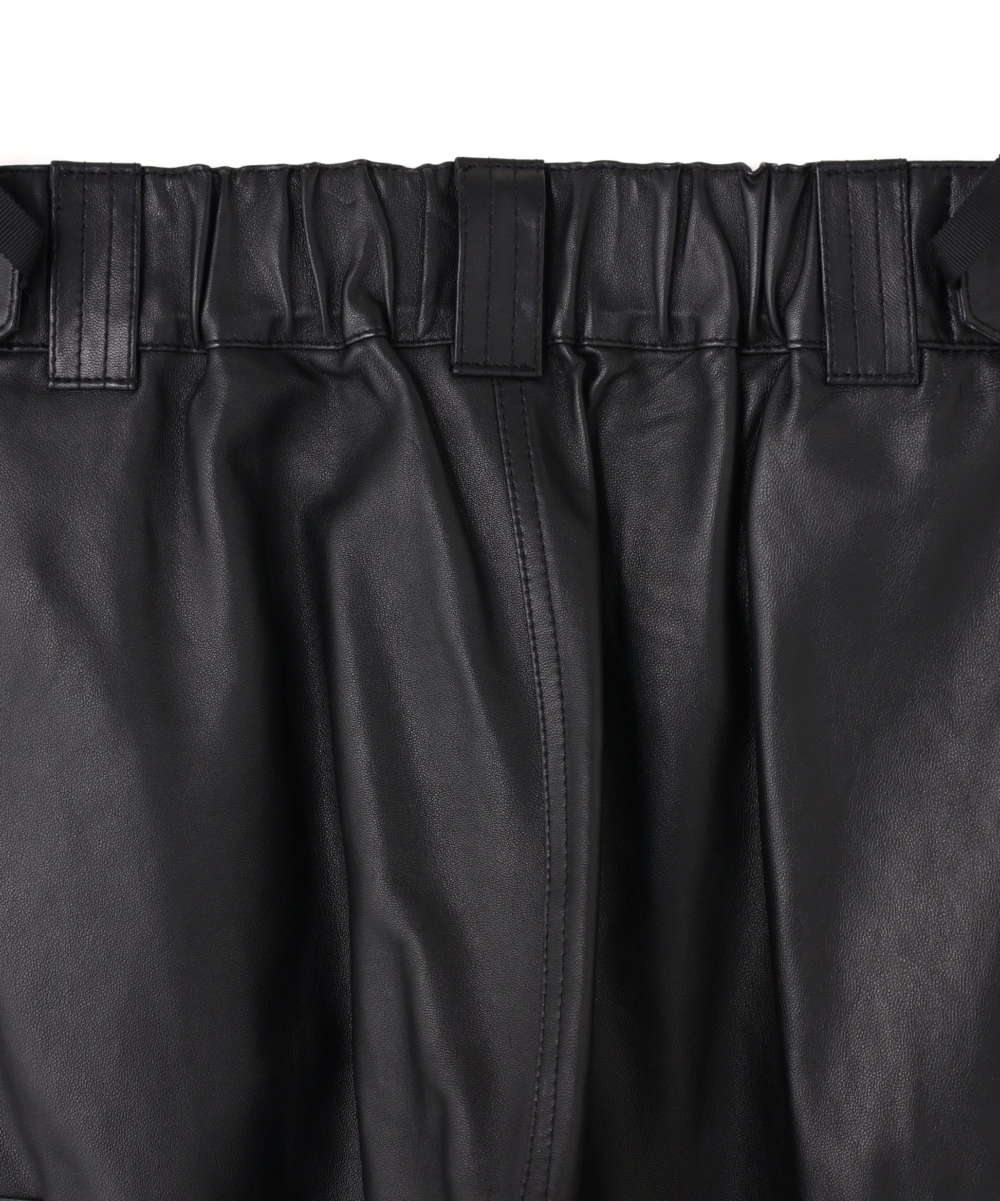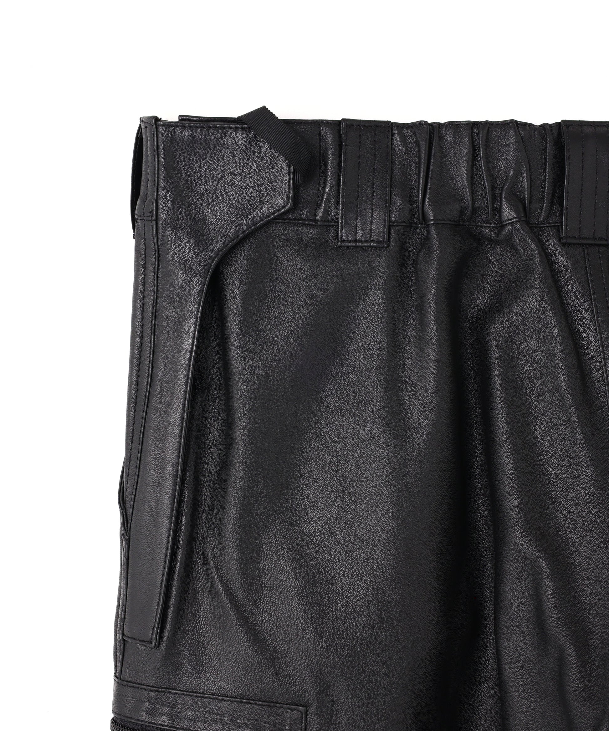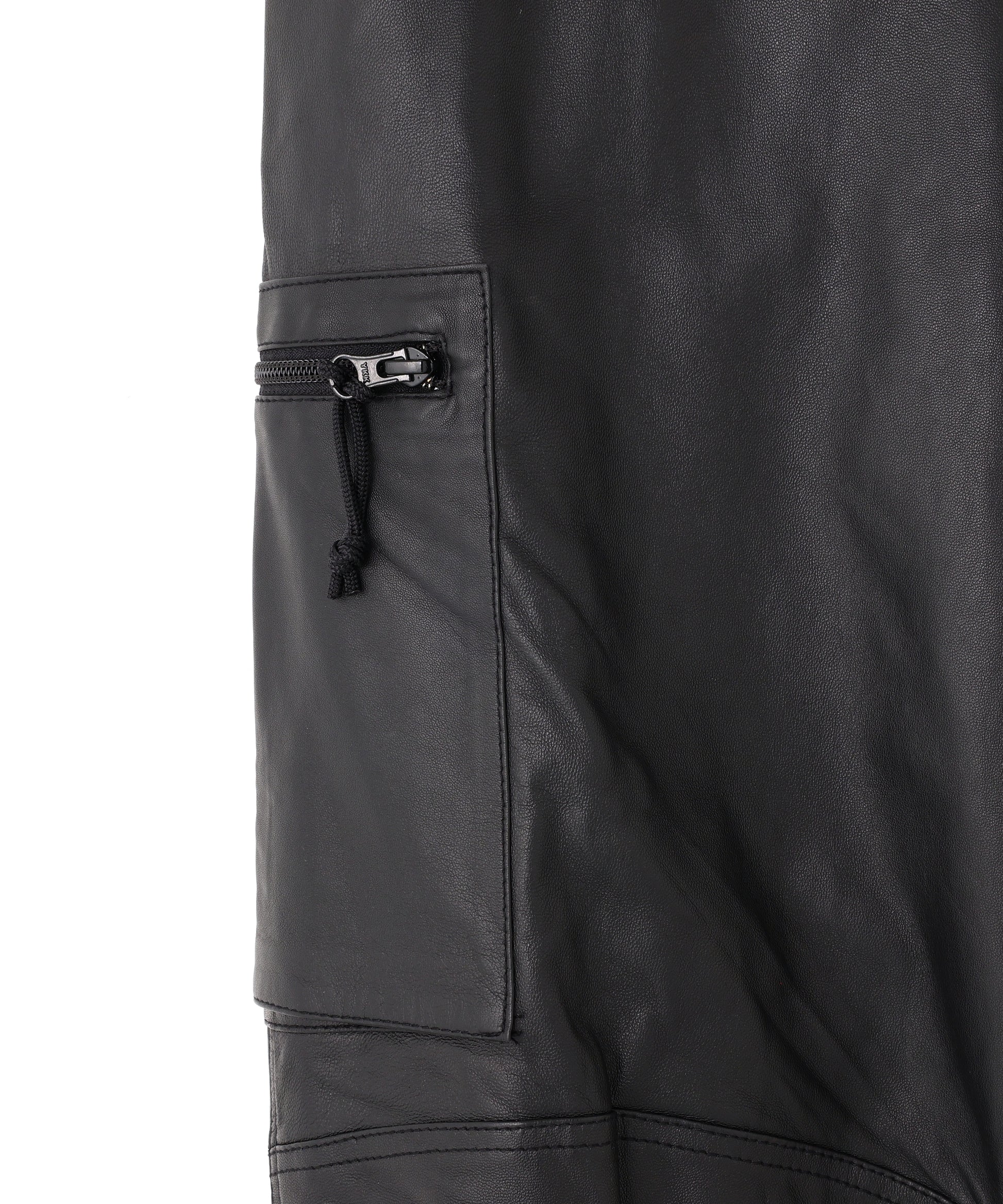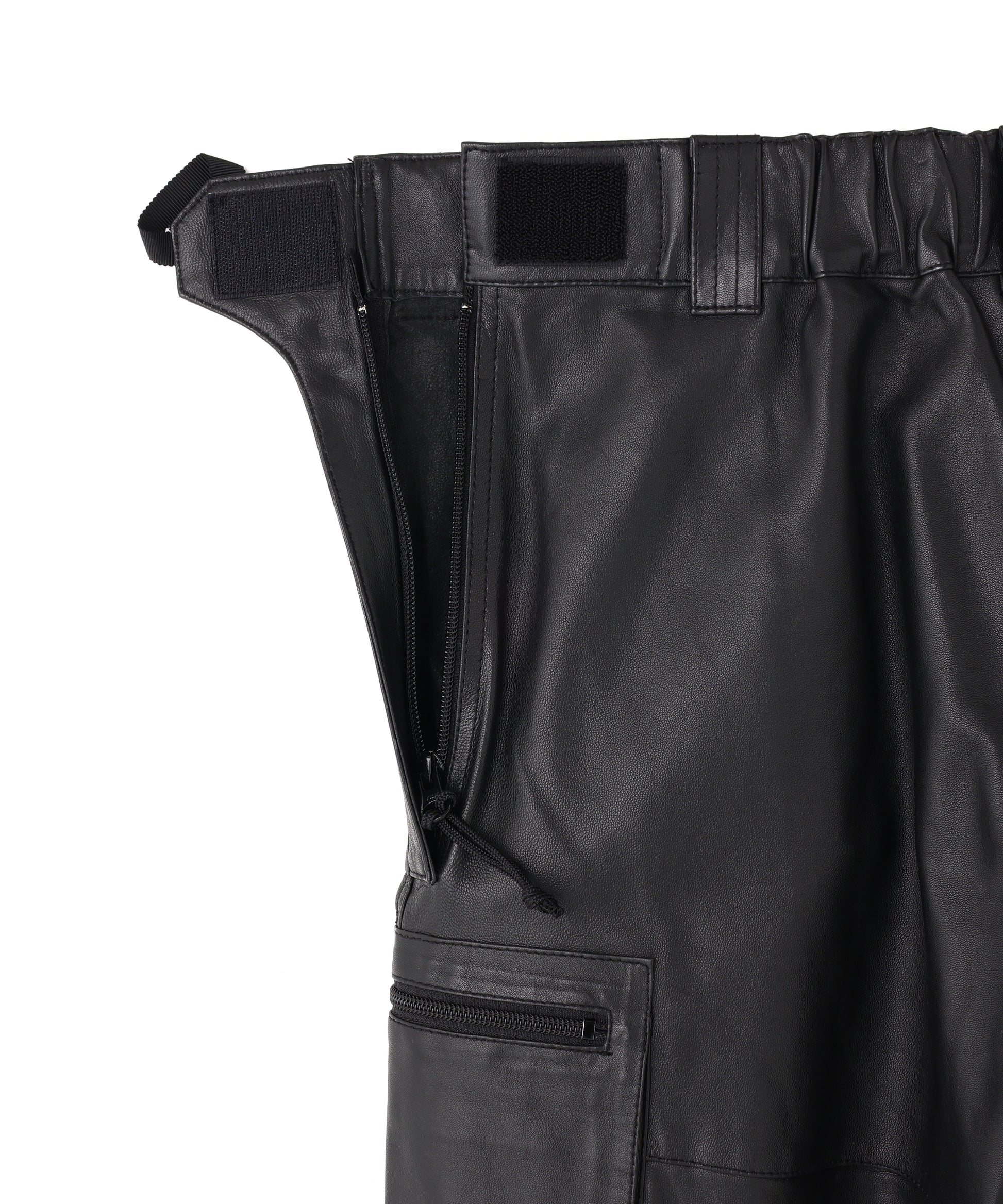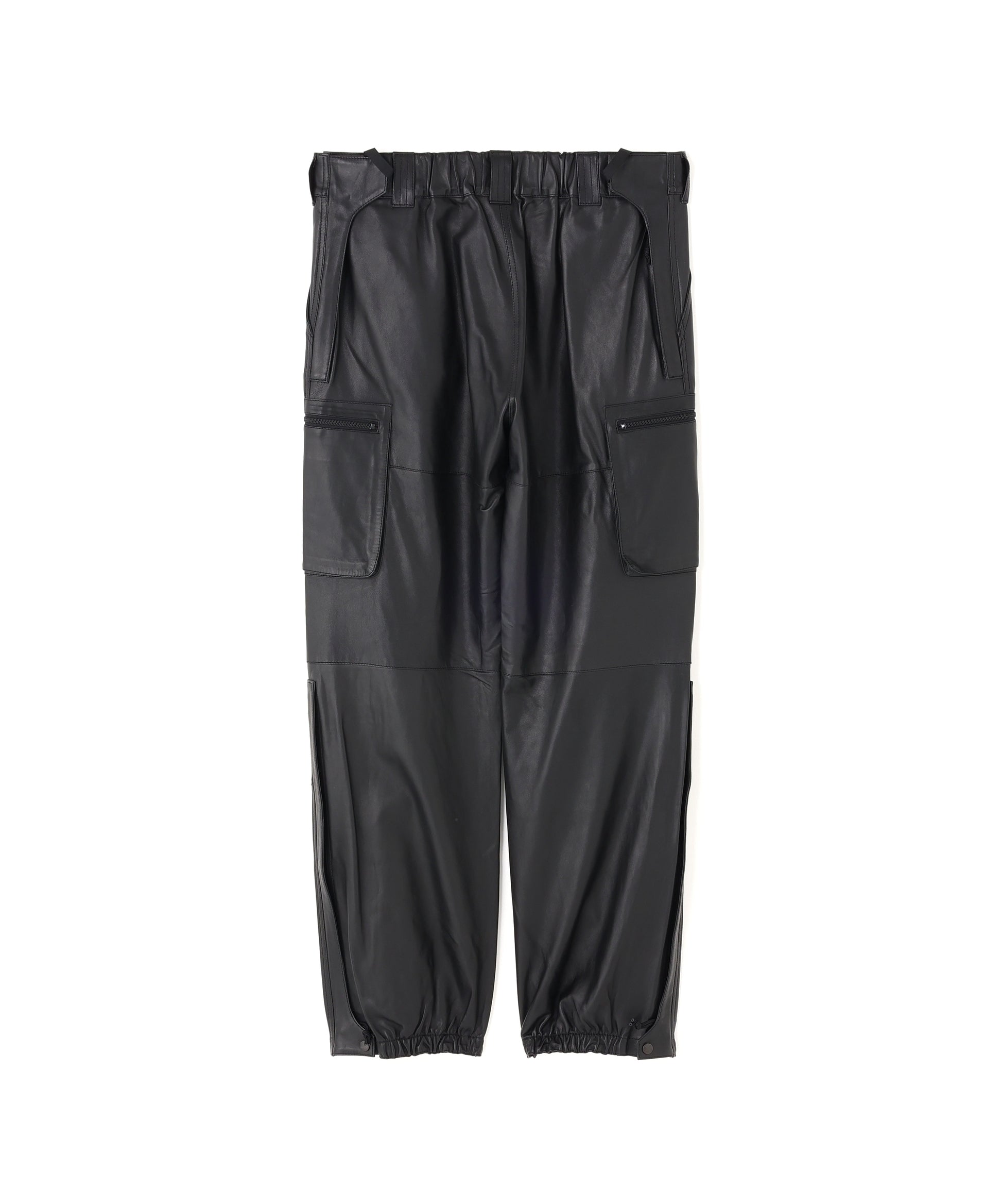 本来、オーバーパンツに求める役割でもある防風性や撥水性の機能には到底及ばないながらも、ファッション性に特化した ブランドらしいアプローチの遊び心が感じられる”ナイロン風”のレザーで作製したミリタリーディテールのパンツです。