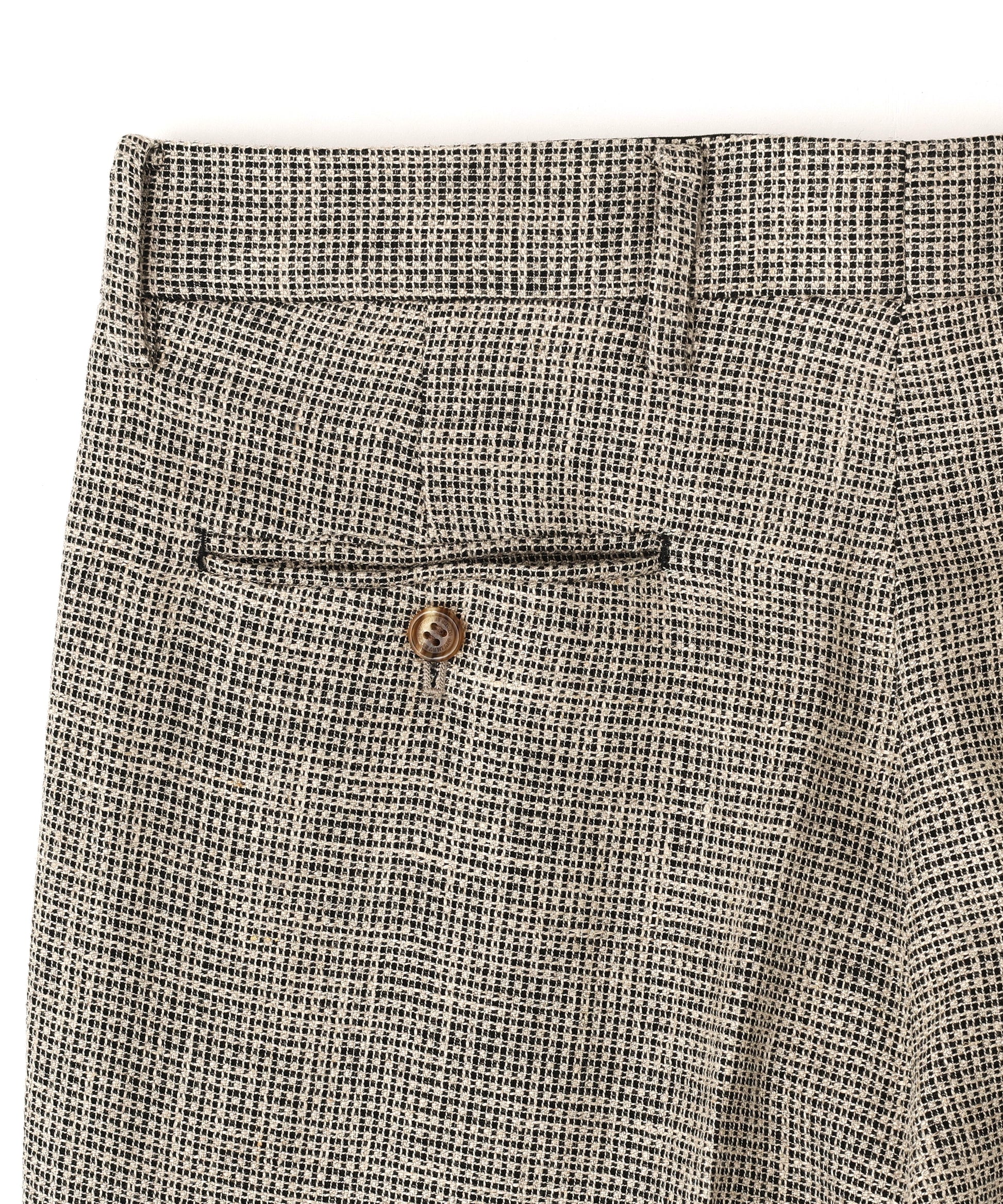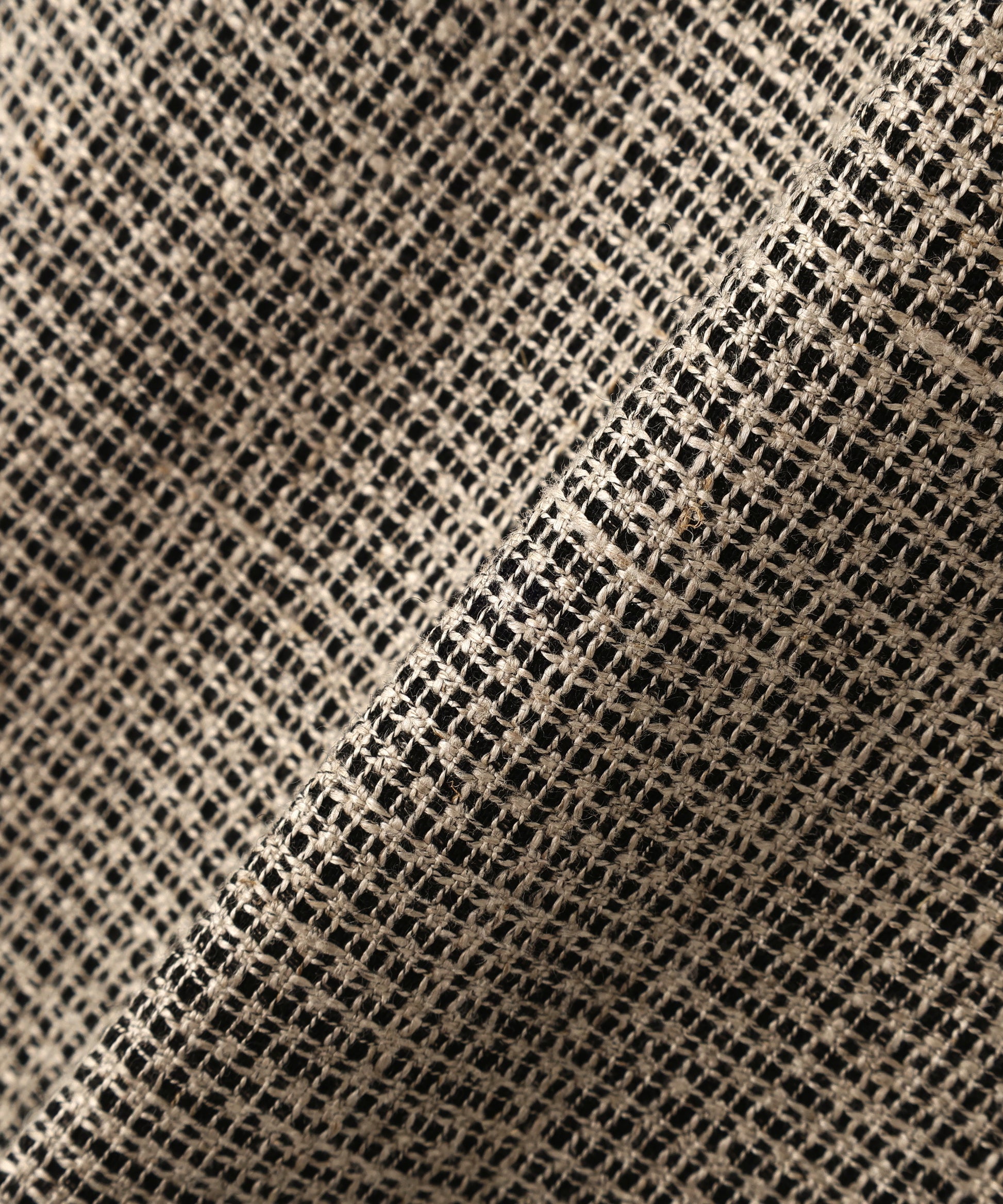 ナチュラルな風合いと高級感を両立させた特別な生地を使用しました。リネンとナイロンの杢糸(キナリ×黒)に、ウールクレープの強撚糸(黒)を組み合わせた交織素材は、凹凸のある表情豊かな生地感が魅力です。