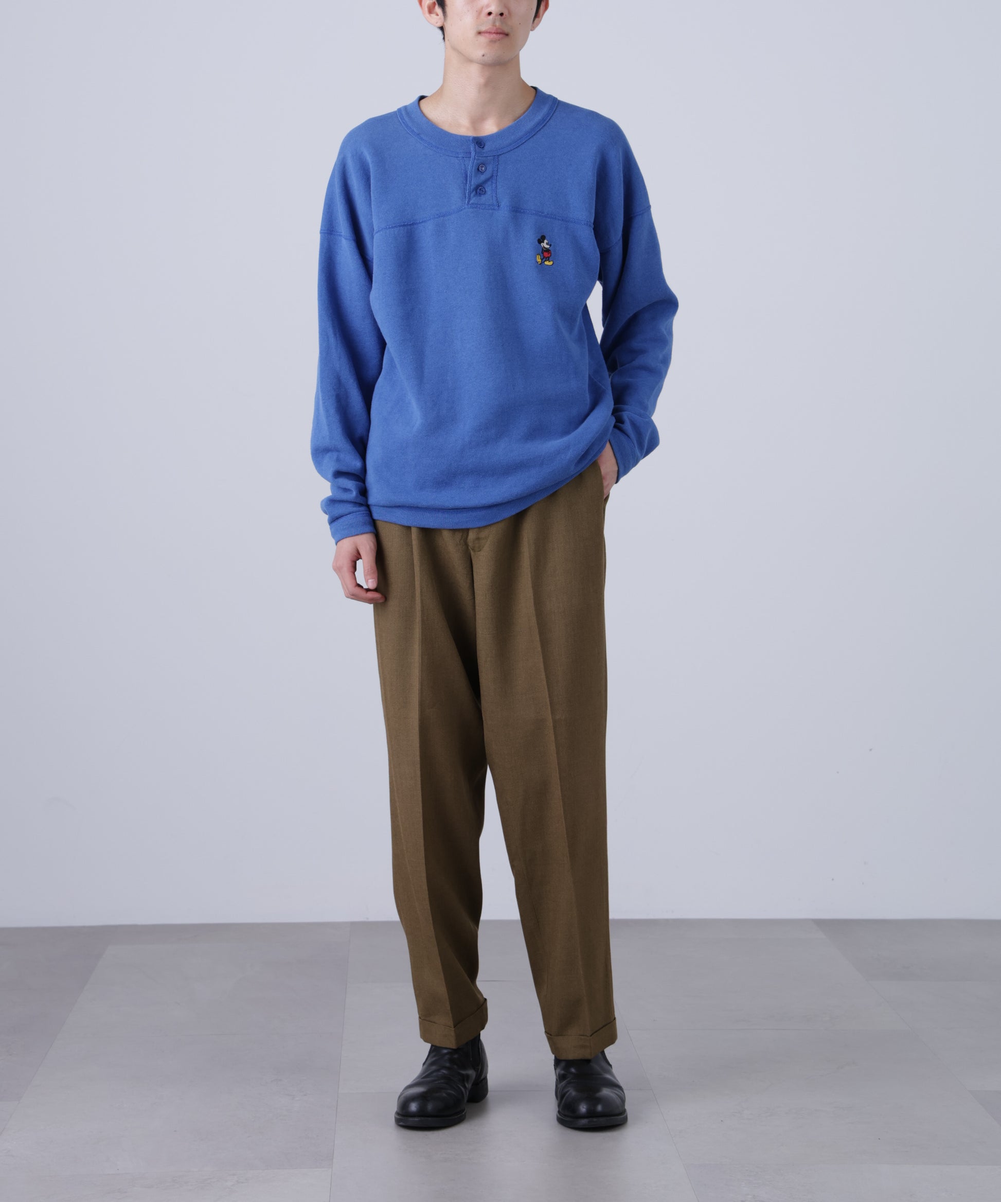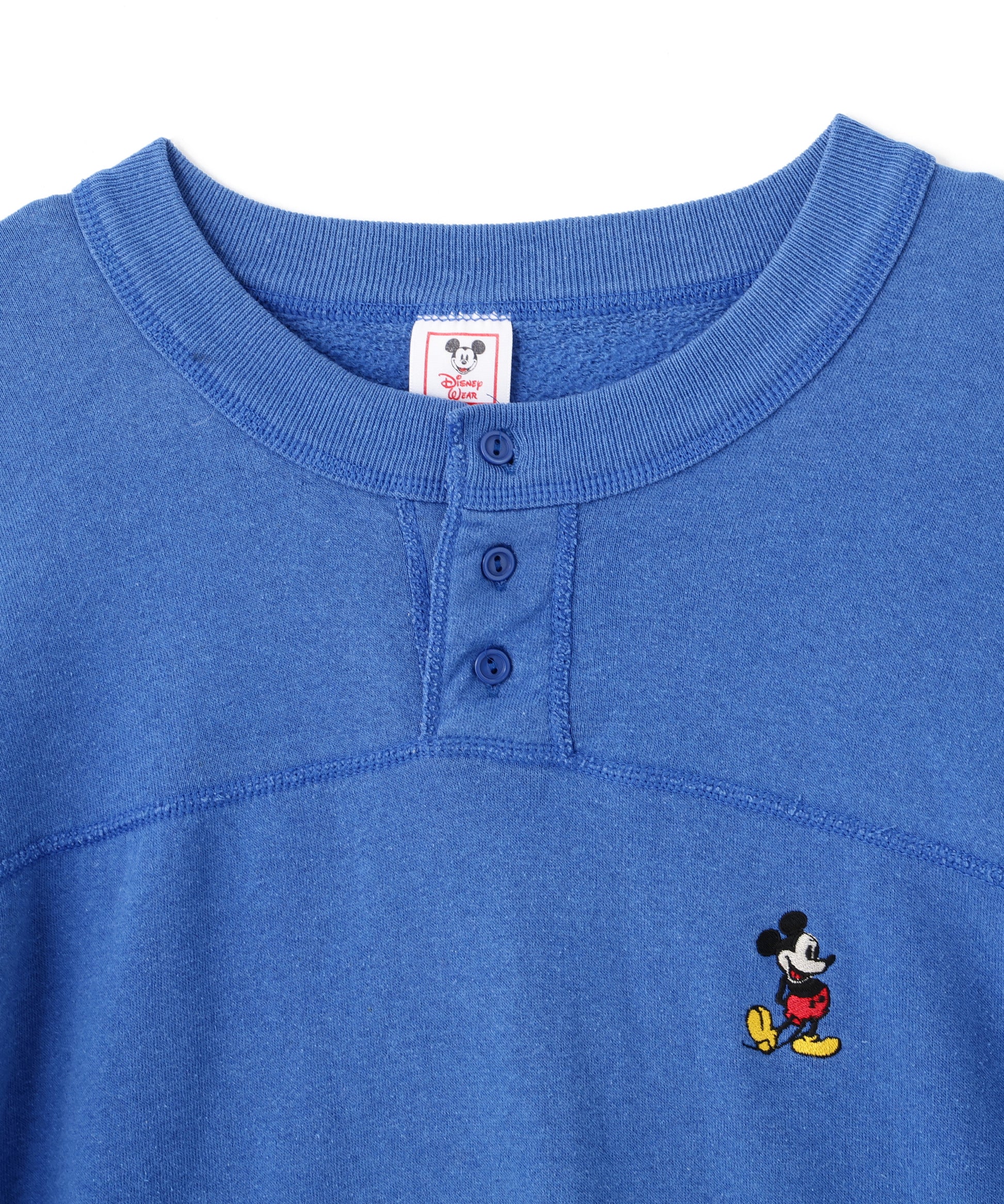 ワンポイント刺繍が映える、ミッキーデザインのヘンリーネックスウェット。
